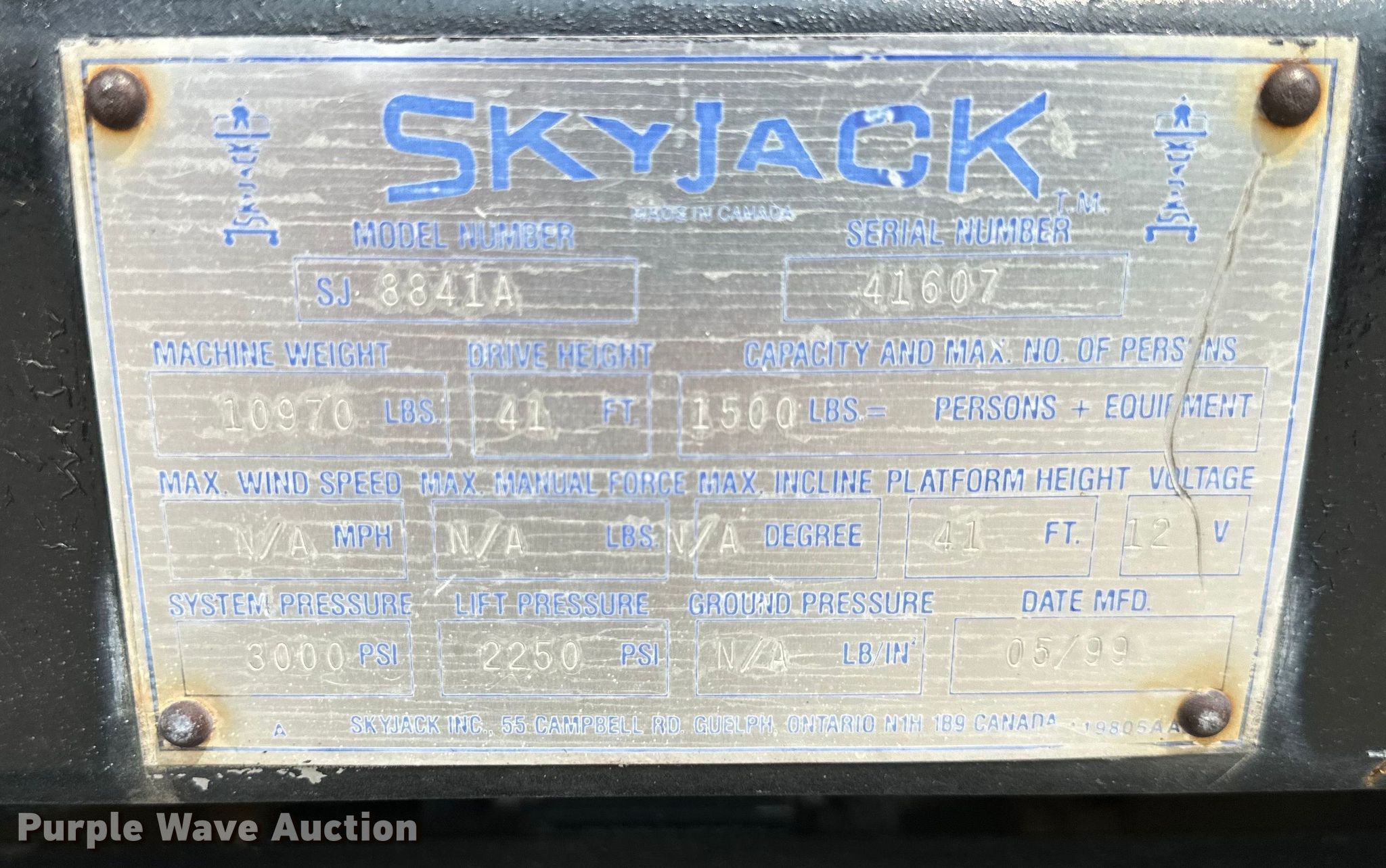 Purple Wave is selling a used Scissor or Vertical Lift in Kansas. This item is a 1999 SkyJack SJ8841 scissor lift with the following: Hours: 2,168 on meter, Serial: 41607
