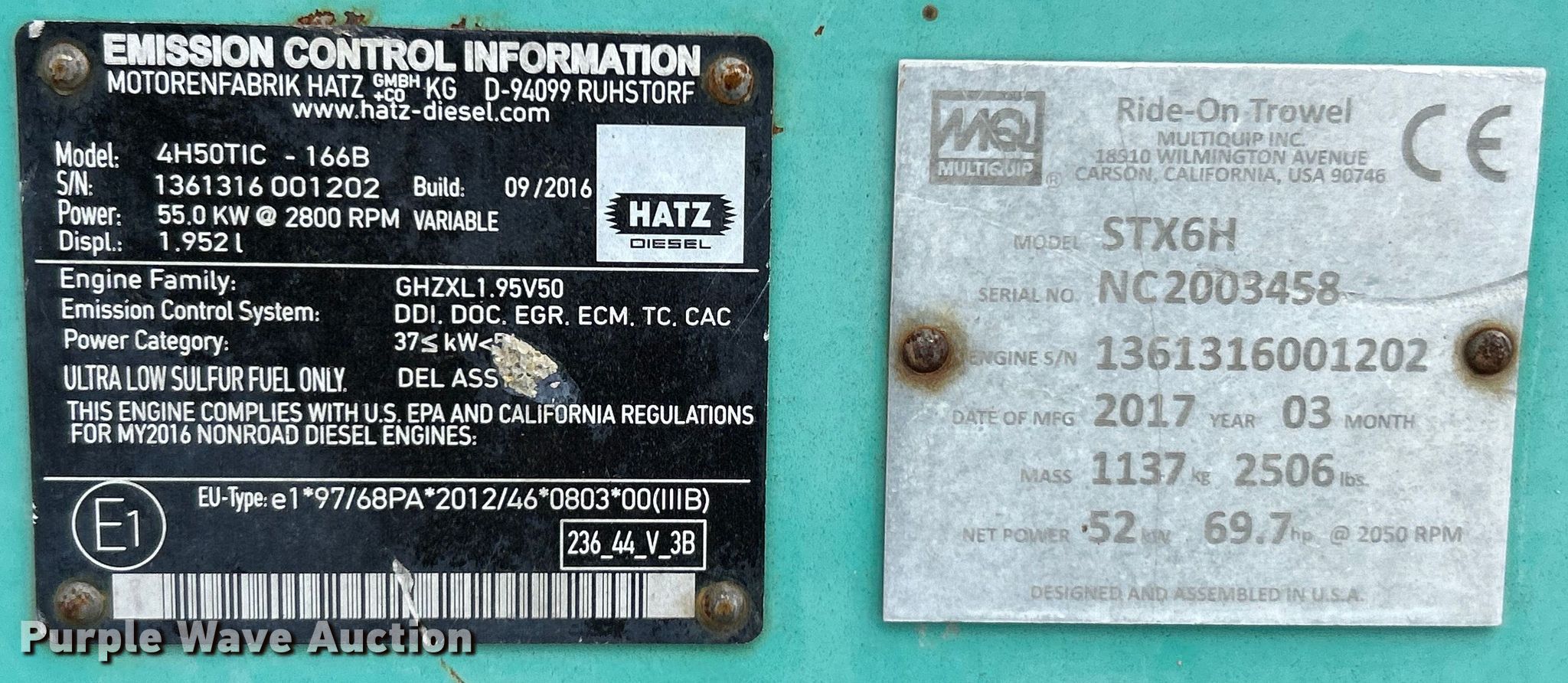 2017 Whiteman STX6H power trowel. Hours: 1,446 on meter, Serial: NC2003458. Engine Hatz, Cylinders: 4, Fuel type: Diesel. Transmission Hydrostatic. Features Width: 10'. Concrete Strategies, LLC. St. Louis, MO 63147