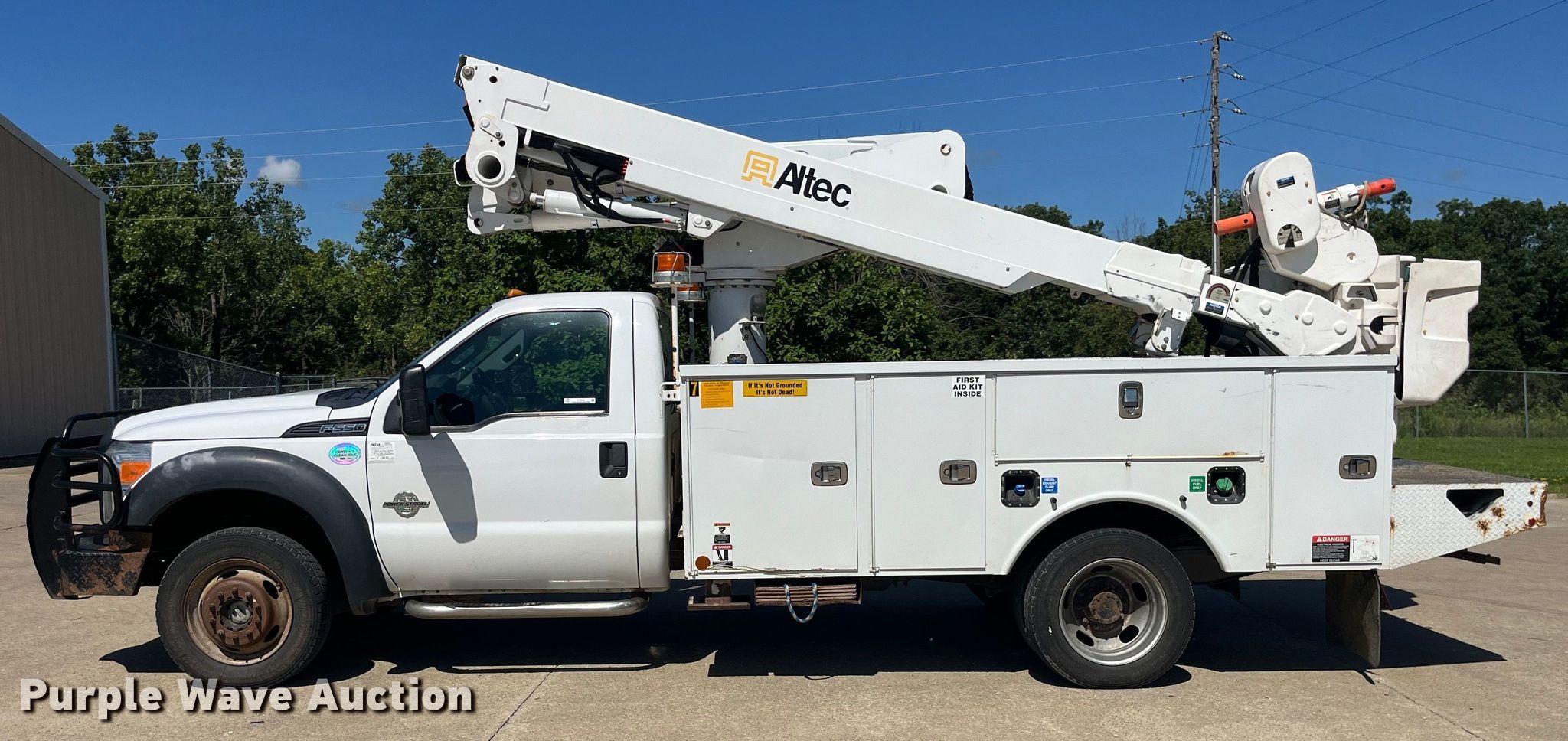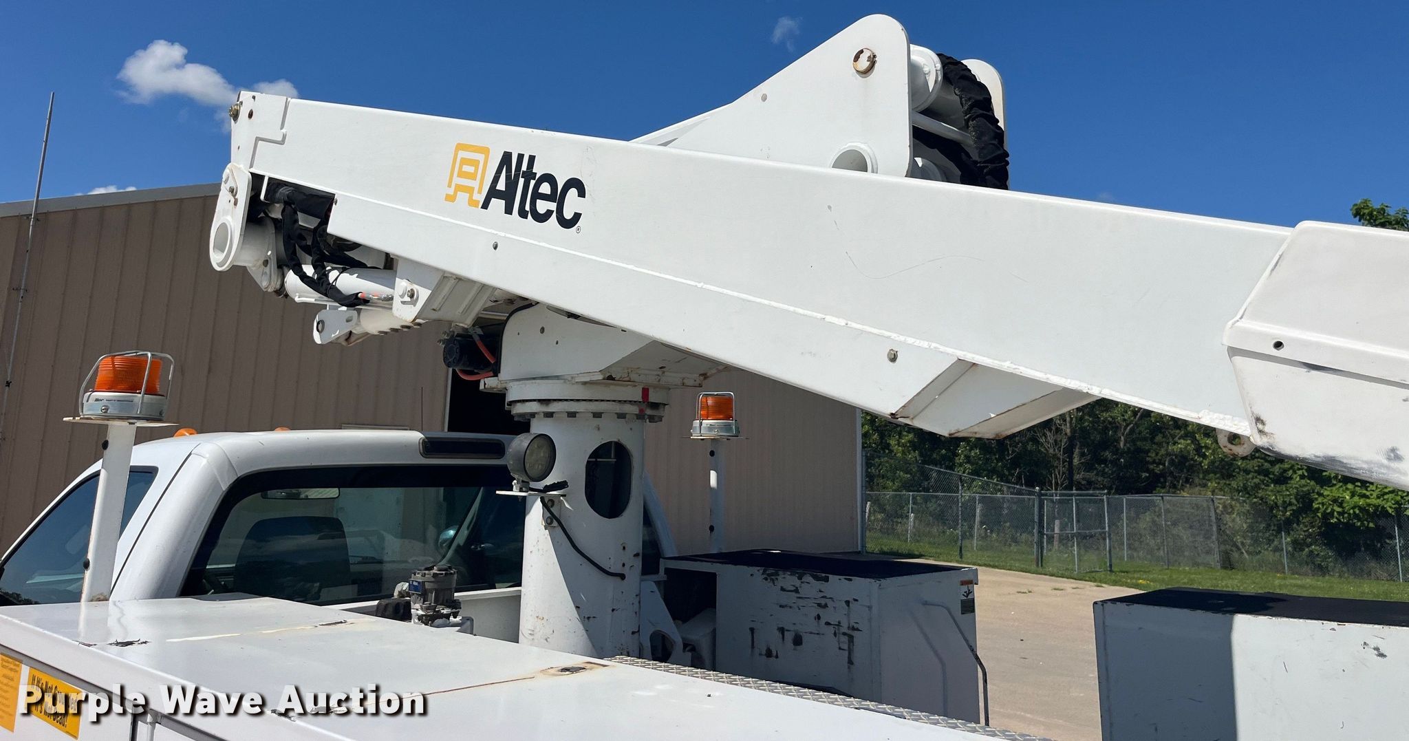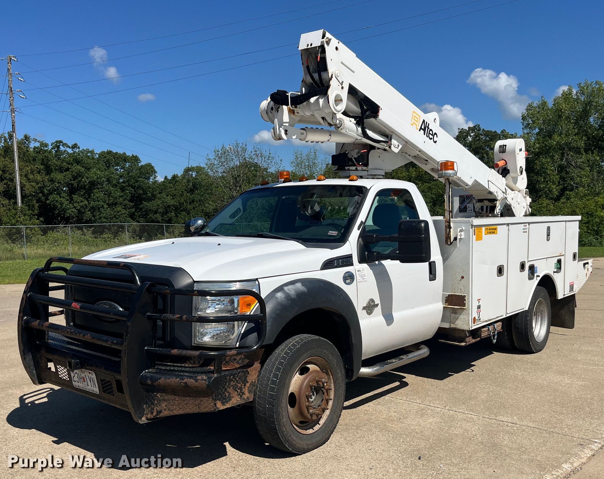 2016 Ford F550 Super Duty XL bucket truck. Miles: 172,875 on odometer, VIN: 1FDUF5HT4GEB27614. Engine Displacement: 6.7L, Cylinders: 8, Fuel type: Diesel. Transmission Automatic. Chassis Four wheel drive, Axles: Single, Suspension: Spring, Brakes: Hydraulic, PTO, GVWR: 19,500 lbs, Wheelbase: 165". Interior AC, Heat, Auxiliary controls. Features Bed Altec, Serial: 856-36838398, 11' L x 94" W, Boom Altec AT40M, Serial: 1215CZ00401, Maximum lift capacity: 400 lbs, Maximum lift height: 40', Boom type: Articulating, Insulated, Telescopic, Man basket, Boom controls Ground, Platform/ basket, Material handler. Tires Size: 225/70R19.5. Notes Dash warning indicator: Check engine, ABS, Brake, Traction control, Airbag, Check brake system, Oil change required, Windshield chipped or cracked, Hail damage. Missouri title. Title distribution may be delayed up to 14 days from verification of funds. Milan, MO 63556