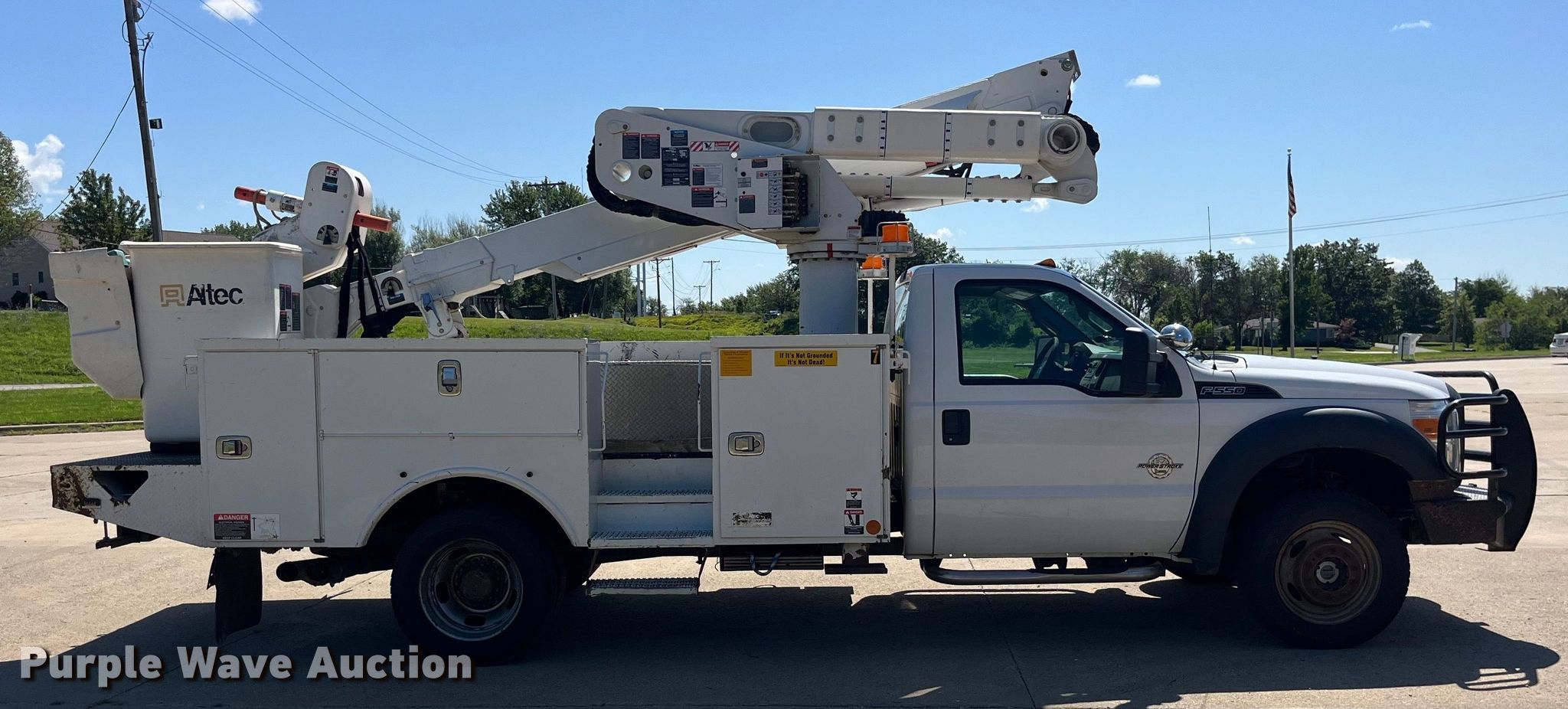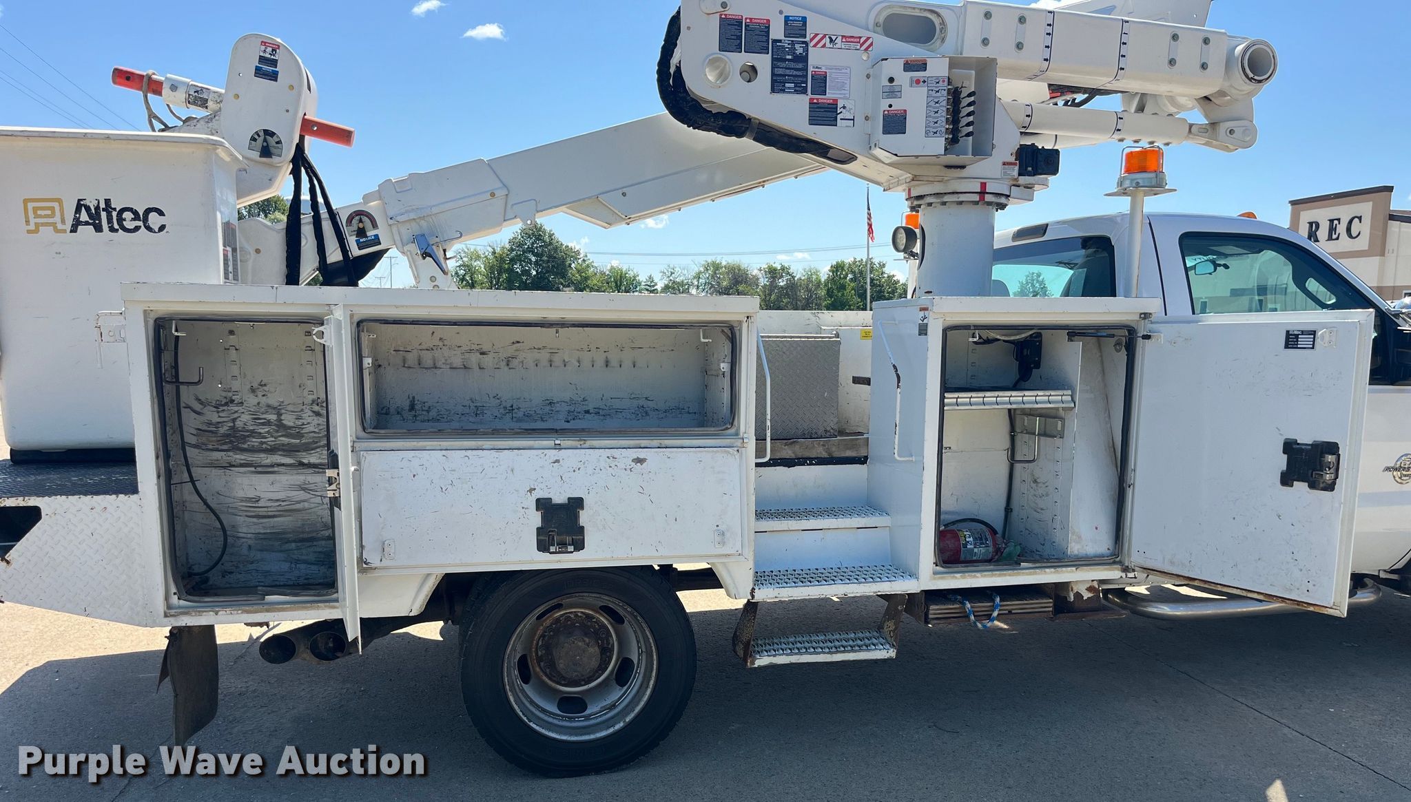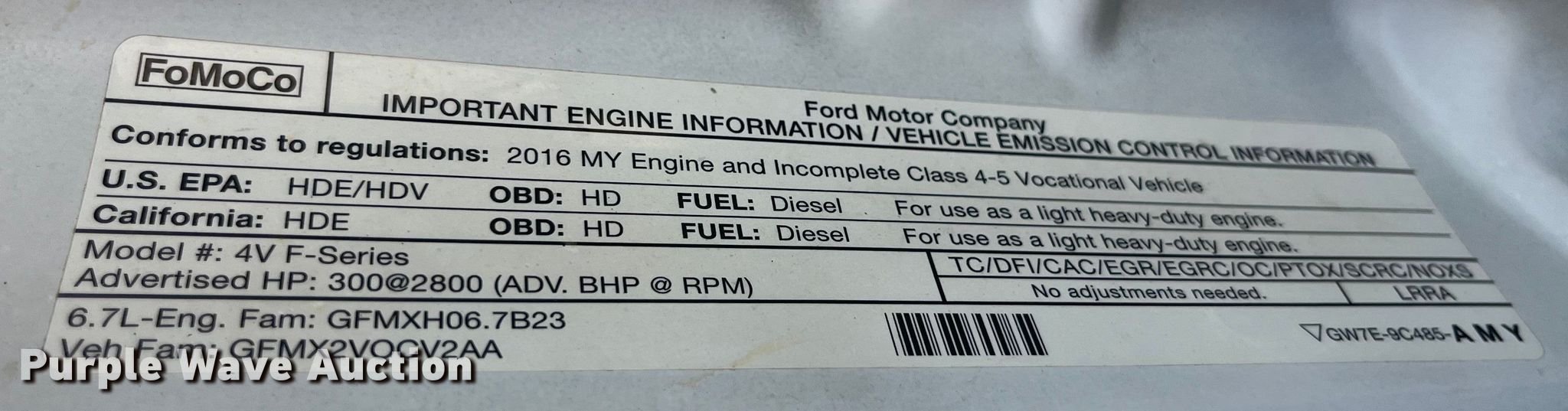 2016 Ford F550 Super Duty XL bucket truck. Miles: 172,875 on odometer, VIN: 1FDUF5HT4GEB27614. Engine Displacement: 6.7L, Cylinders: 8, Fuel type: Diesel. Transmission Automatic. Chassis Four wheel drive, Axles: Single, Suspension: Spring, Brakes: Hydraulic, PTO, GVWR: 19,500 lbs, Wheelbase: 165". Interior AC, Heat, Auxiliary controls. Features Bed Altec, Serial: 856-36838398, 11' L x 94" W, Boom Altec AT40M, Serial: 1215CZ00401, Maximum lift capacity: 400 lbs, Maximum lift height: 40', Boom type: Articulating, Insulated, Telescopic, Man basket, Boom controls Ground, Platform/ basket, Material handler. Tires Size: 225/70R19.5. Notes Dash warning indicator: Check engine, ABS, Brake, Traction control, Airbag, Check brake system, Oil change required, Windshield chipped or cracked, Hail damage. Missouri title. Title distribution may be delayed up to 14 days from verification of funds. Milan, MO 63556