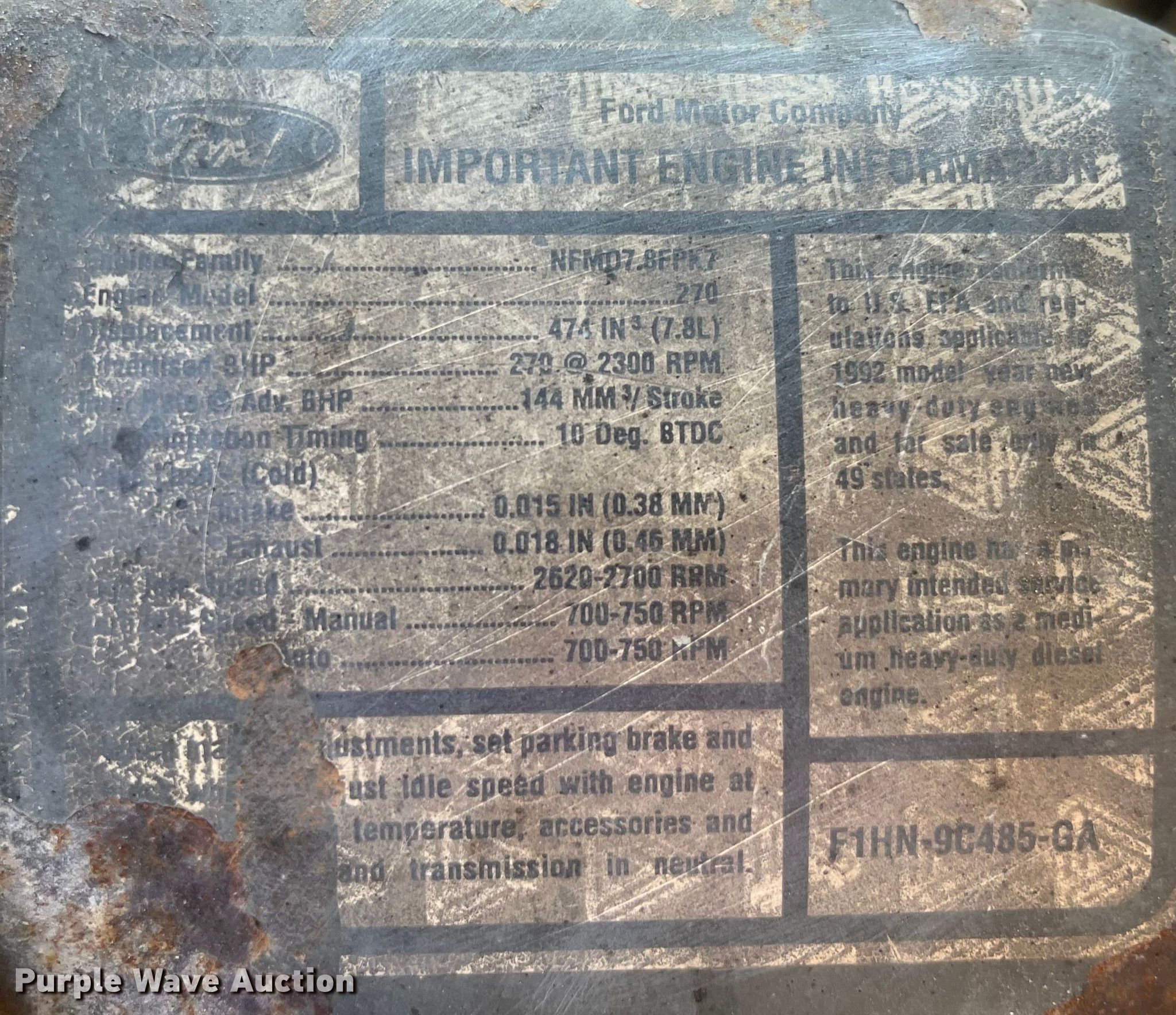 1992 Ford L8000 dump truck. Miles: 473,283 on odometer, VIN: 1FDYU82A7NVA25818. Engine Ford, Displacement: 7.8L, Cylinders: 6, Fuel type: Diesel. Transmission Manual, Speed: 10. Chassis Axles: Tandem, Differential lock: Inter-axle, Suspension: Spring over walking beam, Brakes: Air, PTO, GVWR: 54,000 lbs, Wheelbase: 204". Interior AC, Heat, Brake controller. Features Dump bed Heil HPT10YD15, 15' x 7' 10" W, Side height: 36", Side board height: 17", Bed type: Steel, Ram: Single, End gate: Air operated. Tires Front: 315/80R22.5, Rear: 11R22.5. Notes Oil leak, Non-operational AC Missing AC belt. Missouri title. Title distribution may be delayed up to 14 days from verification of funds. Tyler Pickett. Hannibal, MO 63401