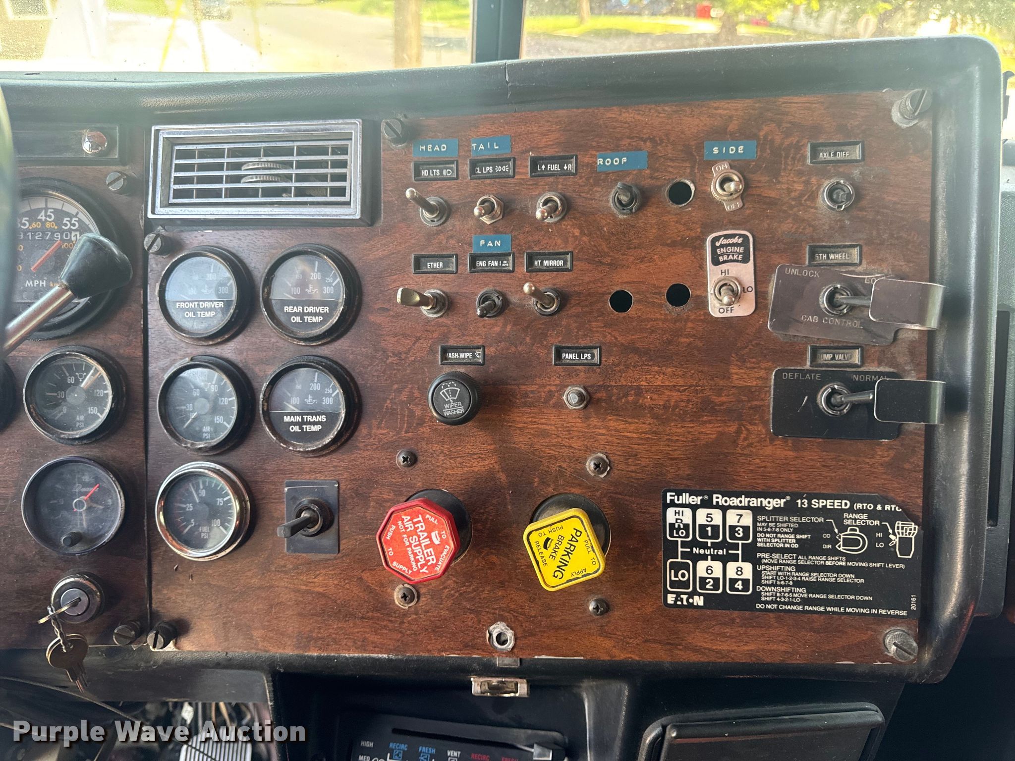 1987 Peterbilt 379 dump truck. Miles: 912,790 on odometer, VIN: 1XP5DB9XXHN212441. Engine Caterpillar 3406, Displacement: 14.6L, Cylinders: 6, Fuel type: Diesel, Engine brake. Transmission Eaton Fuller Roadranger, Manual, Speed: 13. Chassis Axles: Tandem, Suspension: Air Dump valves, Brakes: Air, PTO, GVWR: 50,000 lbs FAWR: 12,000 lbs, IAWR: 19,000 lbs, RAWR: 19,000 lbs. Interior AC, Heat, Heated mirrors. Features Dump bed 16' L x 95" W, Side height: 52", Bed type: Steel, Roll tarp, Ram: Single, End gate: Air operated. Tires Size: 11R22.5. Notes Dash warning indicator: Low Water, Windshield chipped or cracked, Non-operational AC, Cab roof damaged, Bed lift cylinder issues, leaks. Missouri title. Title distribution may be delayed up to 14 days from verification of funds. Lexington , MO 64067