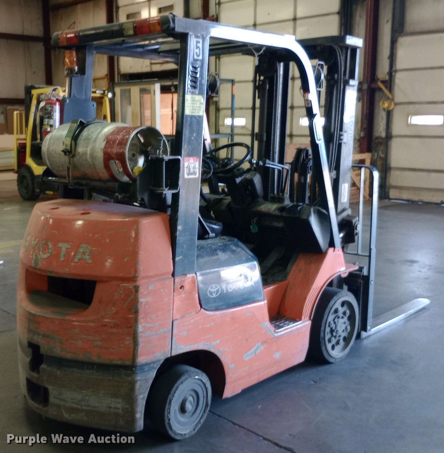 Purple Wave is selling a used Warehouse Forklift in Kansas. This item is a 1999 Toyota 7FGCU25 forklift with the following: Hours: 16,490 on meter, Actual hours unknown, Serial: 60677, Unit #: F005