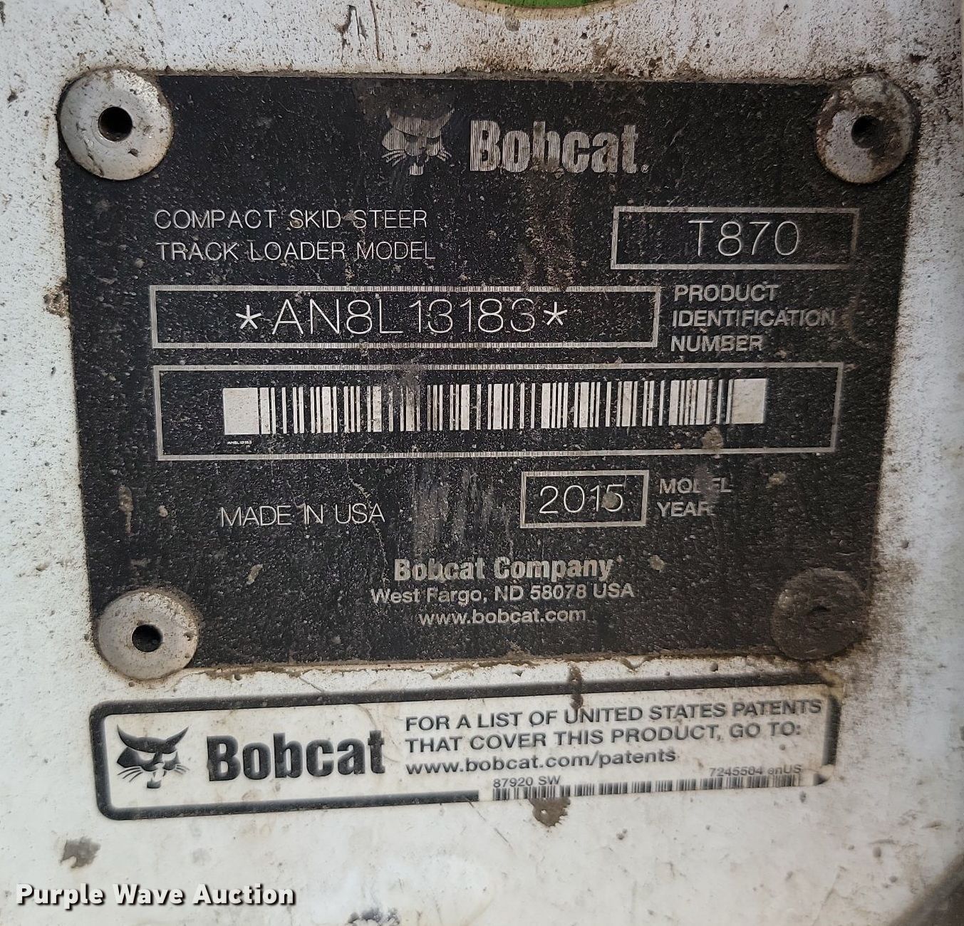 Purple Wave is selling a used Tracked Skid Steer Loader in Minnesota. This item is a 2015 Bobcat T870 tracked skid steer loader with the following: Hours: 3,120 on meter, Serial: AN8L13183