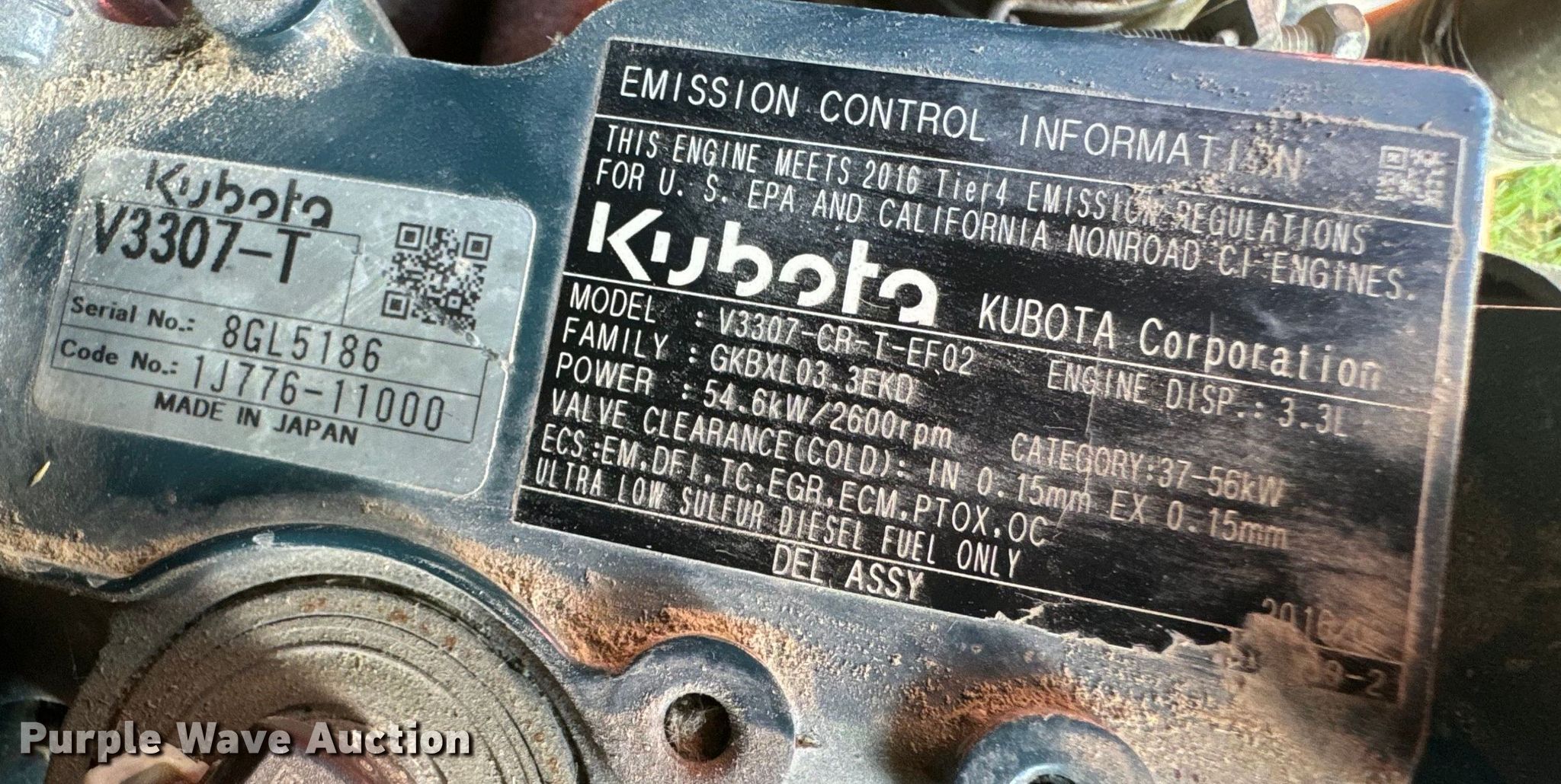 2016 Kubota SSV75 skid steer loader. Hours: 3,204 on meter, Serial: JKUS0751E00J21361. Engine Kubota V3307-CR-T-EF02, Serial: 8GL5186, Displacement: 3.3L, Cylinders: 4, Fuel type: Diesel, kW: 54.6. Transmission Hydrostatic, Two speed travel. Operators station Bucket control: Foot. Features Auxiliary hydraulics, Quick coupler: Hydraulic. Tires Size: 30x10-16. Heins Family Farms, LLC. Higginsville, MO 64037