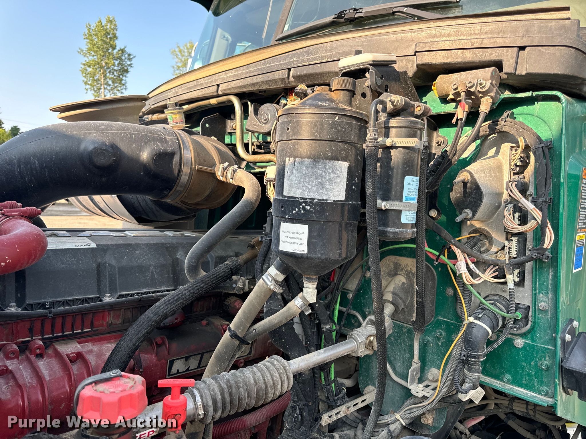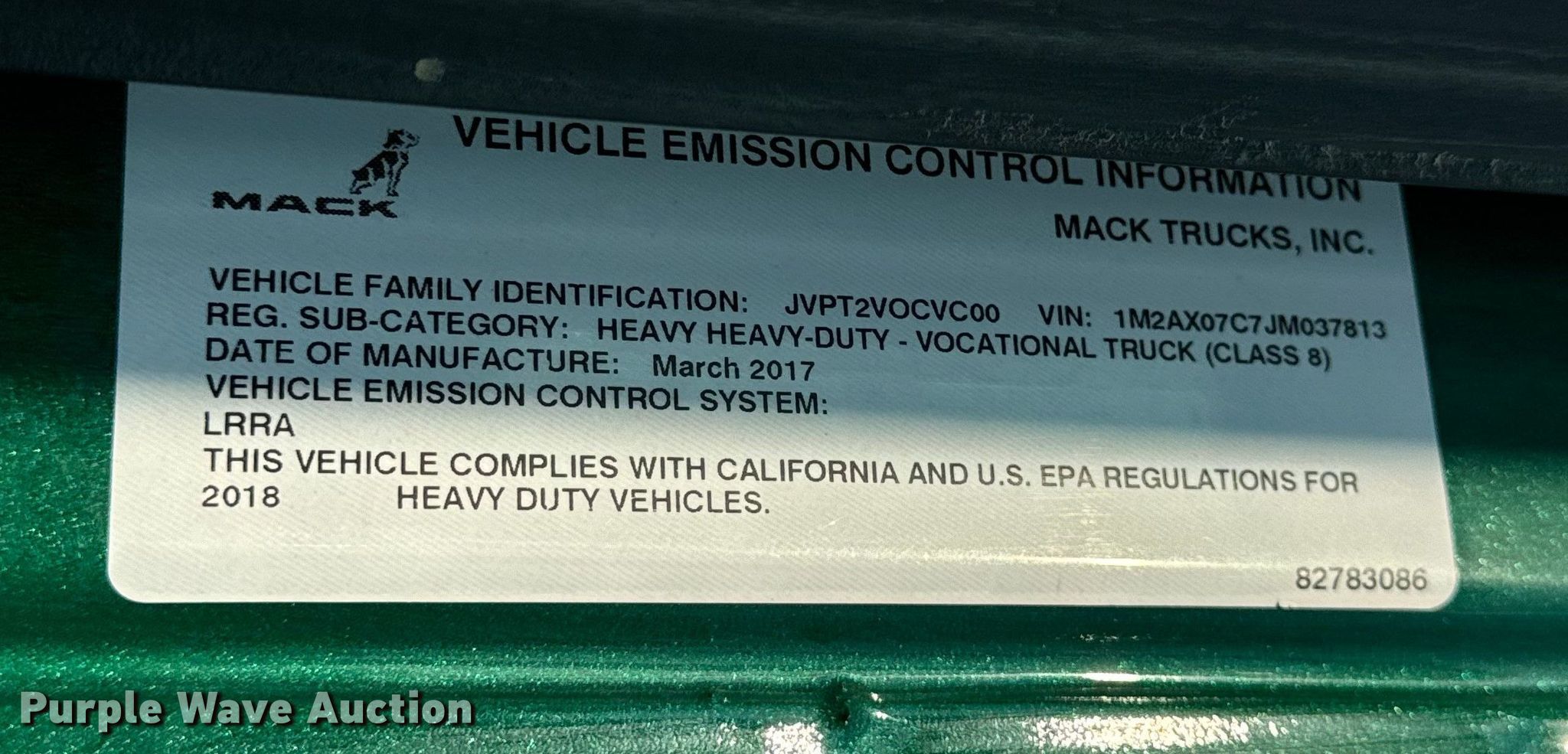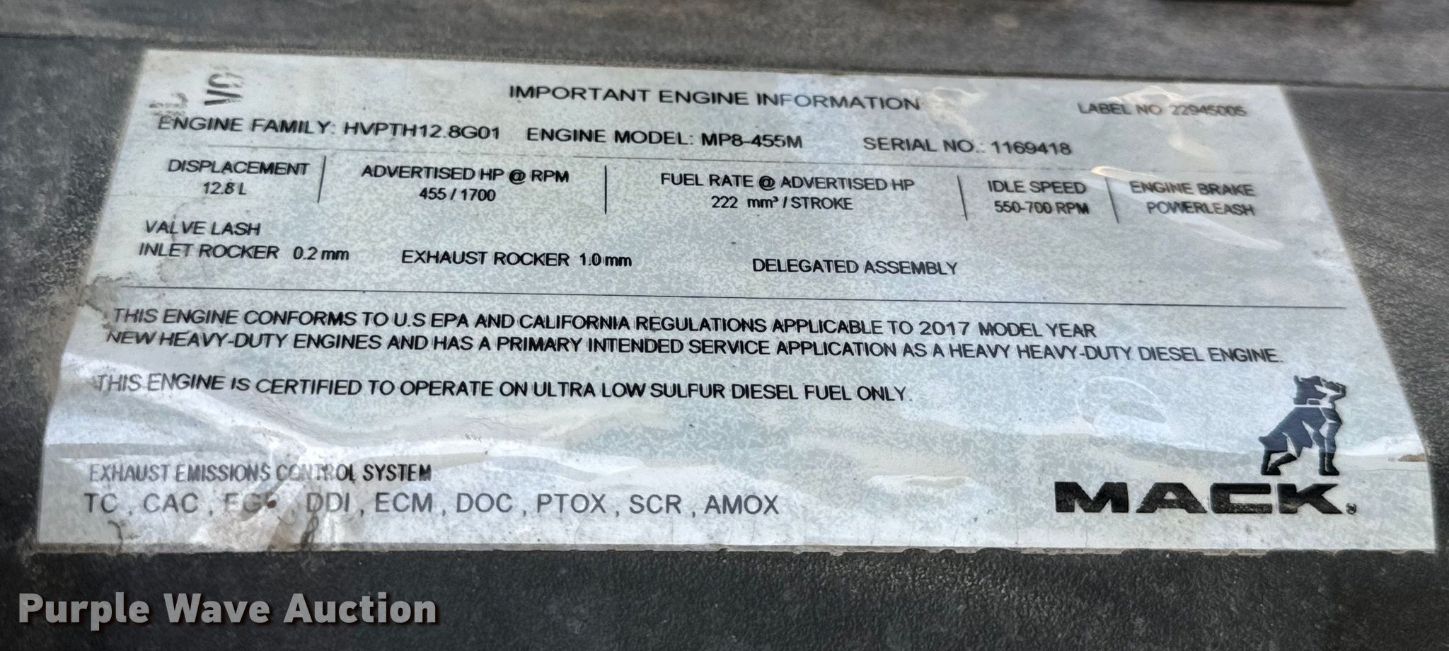 2018 Mack GU713 dump truck. Miles: 131,338 on odometer, Hours: 8,571 on meter, VIN: 1M2AX07C7JM037813. Engine Mack MP8-455M, Serial: 1169418, Displacement: 12.8L, Cylinders: 6, Fuel type: Diesel, HP: 455, Engine brake. Transmission Allison, Automatic. Chassis Double frame, Axles: Tandem, Differential lock: Inter-axle, Suspension: Camelback, Brakes: Air, PTO, GVWR: 66,000 lbs FAWR: 20,000 lbs, IAWR: 23,000 lbs, RAWR: 23,000 lbs. Interior AC, Heat, Heated mirrors, Power windows, Cruise control. Features Dump bed Hilark 16 5/16, 16' L x 96" W, Side height: 48", Bed type: Steel, Barrel, Roll tarp, Ram: Single, End gate: Air operated. Tires Front: 425/65R22.5, Rear: 11R24.5. Missouri title. Title distribution may be delayed up to 14 days from verification of funds. Clymore Trucking Company. Independence, MO 64050