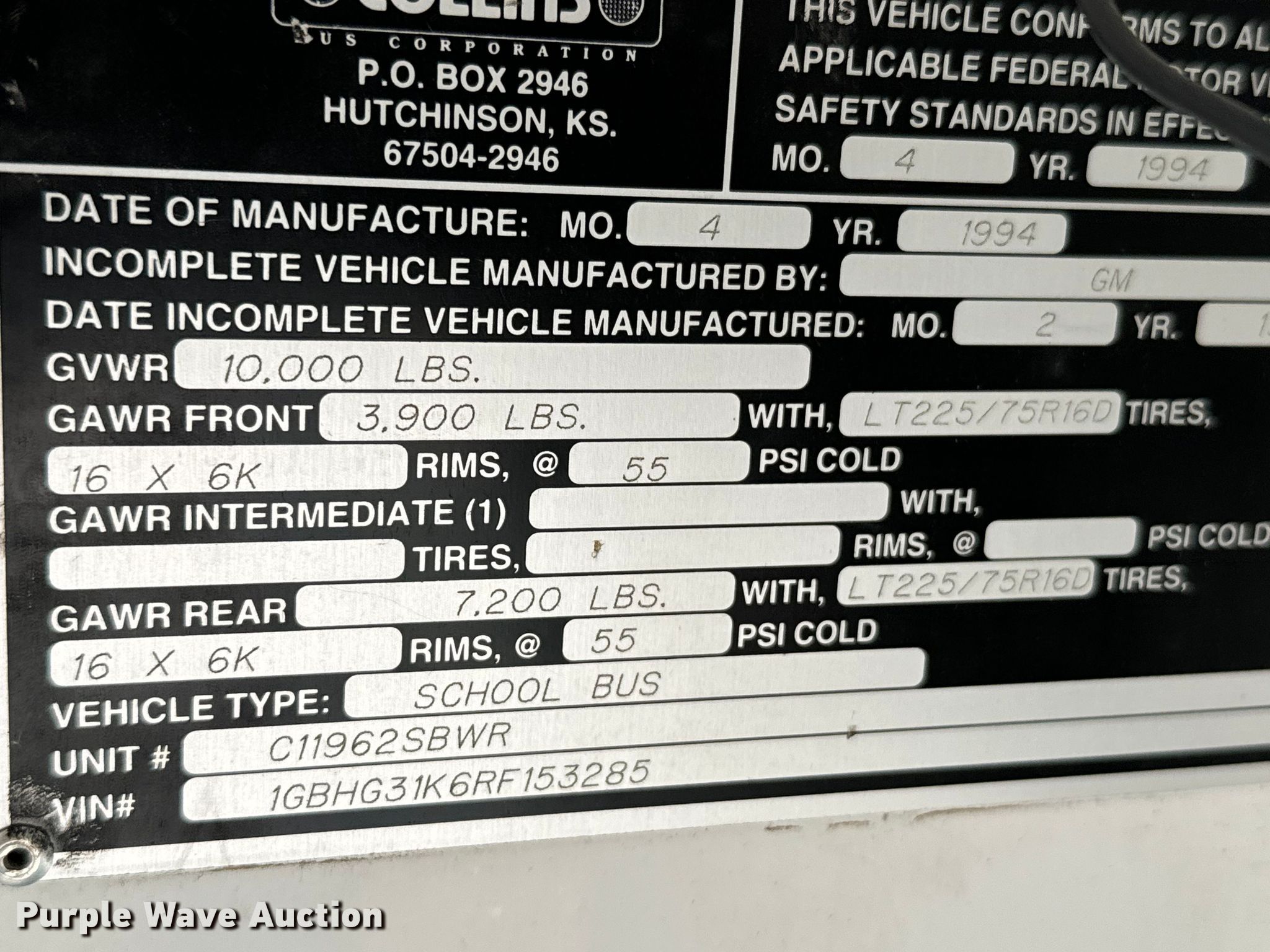 Purple Wave is selling a used Bus in Kansas. This item is a 1994 Chevrolet G30 school bus with the following: Miles: 125,240 on odometer, VIN: 1GBHG31K6RF153285