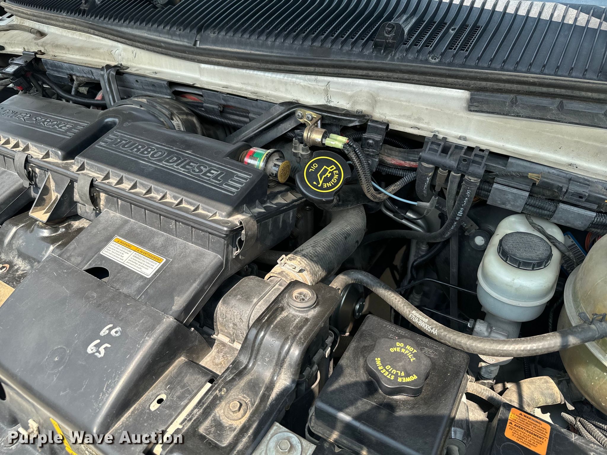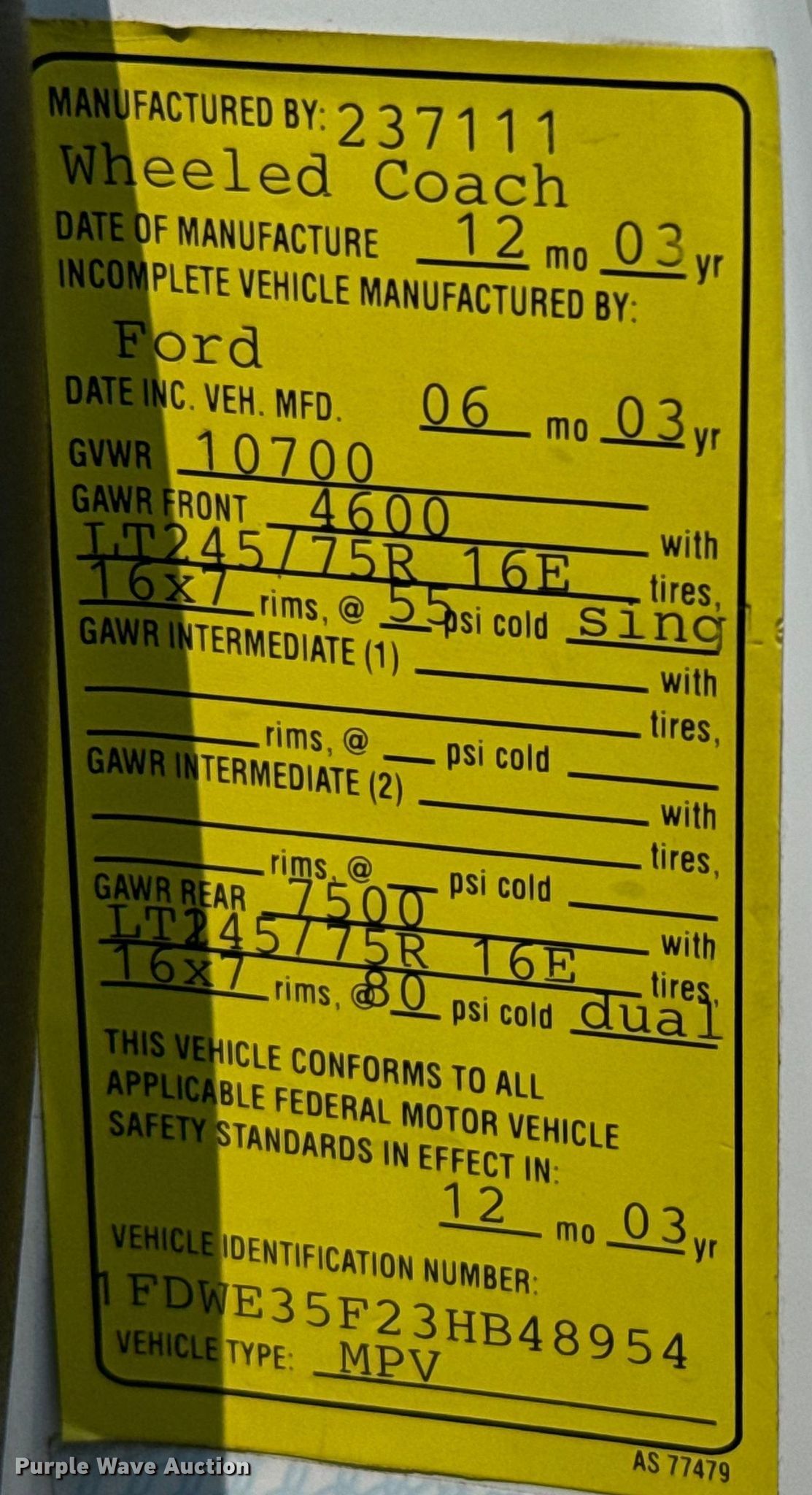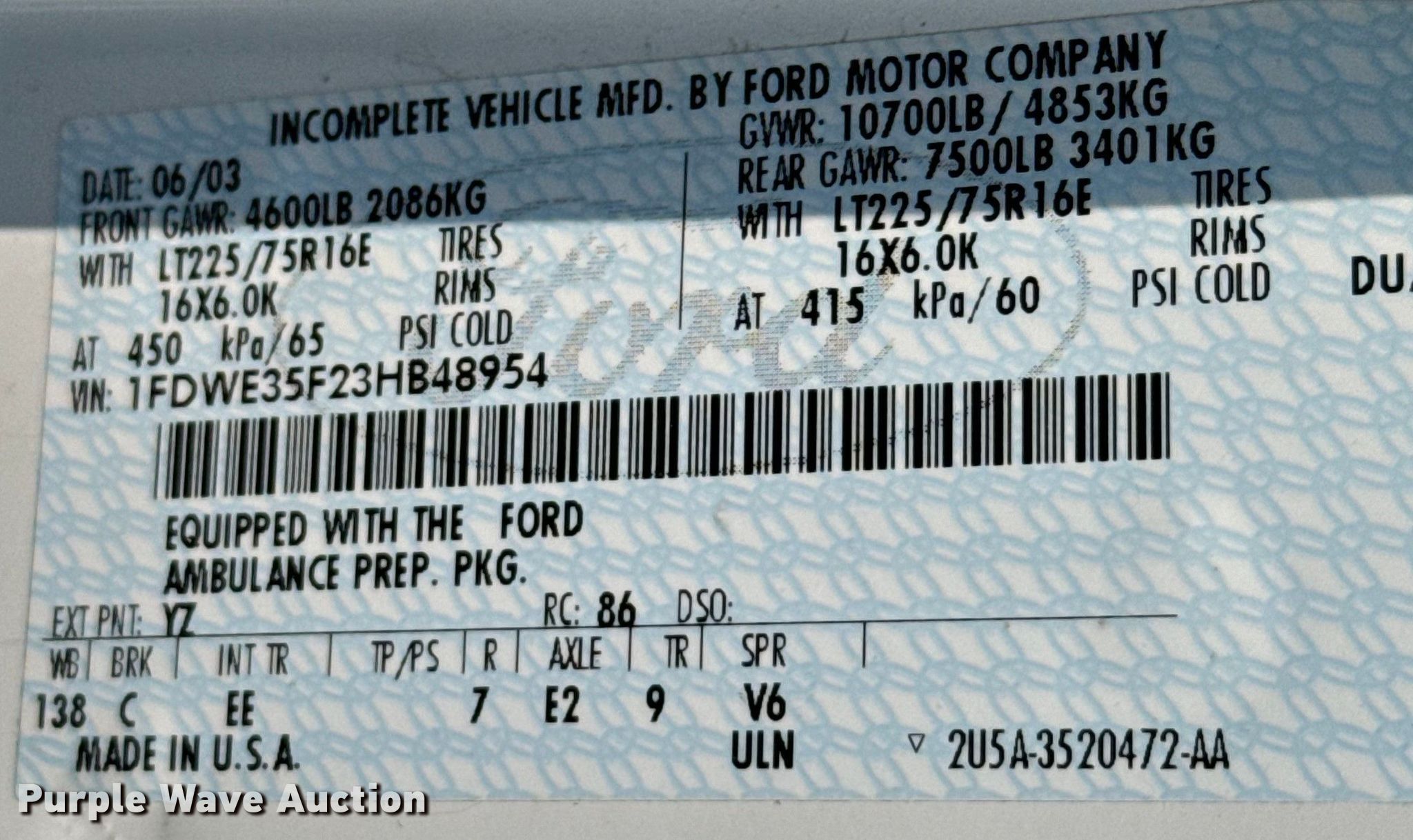 2003 Ford E350 ambulance. Miles: 109,460 on odometer, VIN: 1FDWE35F23HB48954. Engine Displacement: 7.3L, Cylinders: 8, Fuel type: Diesel. Transmission Automatic. Chassis Axles: Single, Suspension: Spring, Brakes: Hydraulic, GVWR: 10,700 lbs. Interior AC, Heat, Power windows, Power locks, Cruise control. Features Ambulance body Wheeled Coach, PA/ siren controls, Oxygen hookups. Tires Size: 225/75R16. Notes Ambulance bed and lock system missing, Radio removed. Kansas title. Title distribution may be delayed up to 14 days from verification of funds. WaKeeney, KS 67672