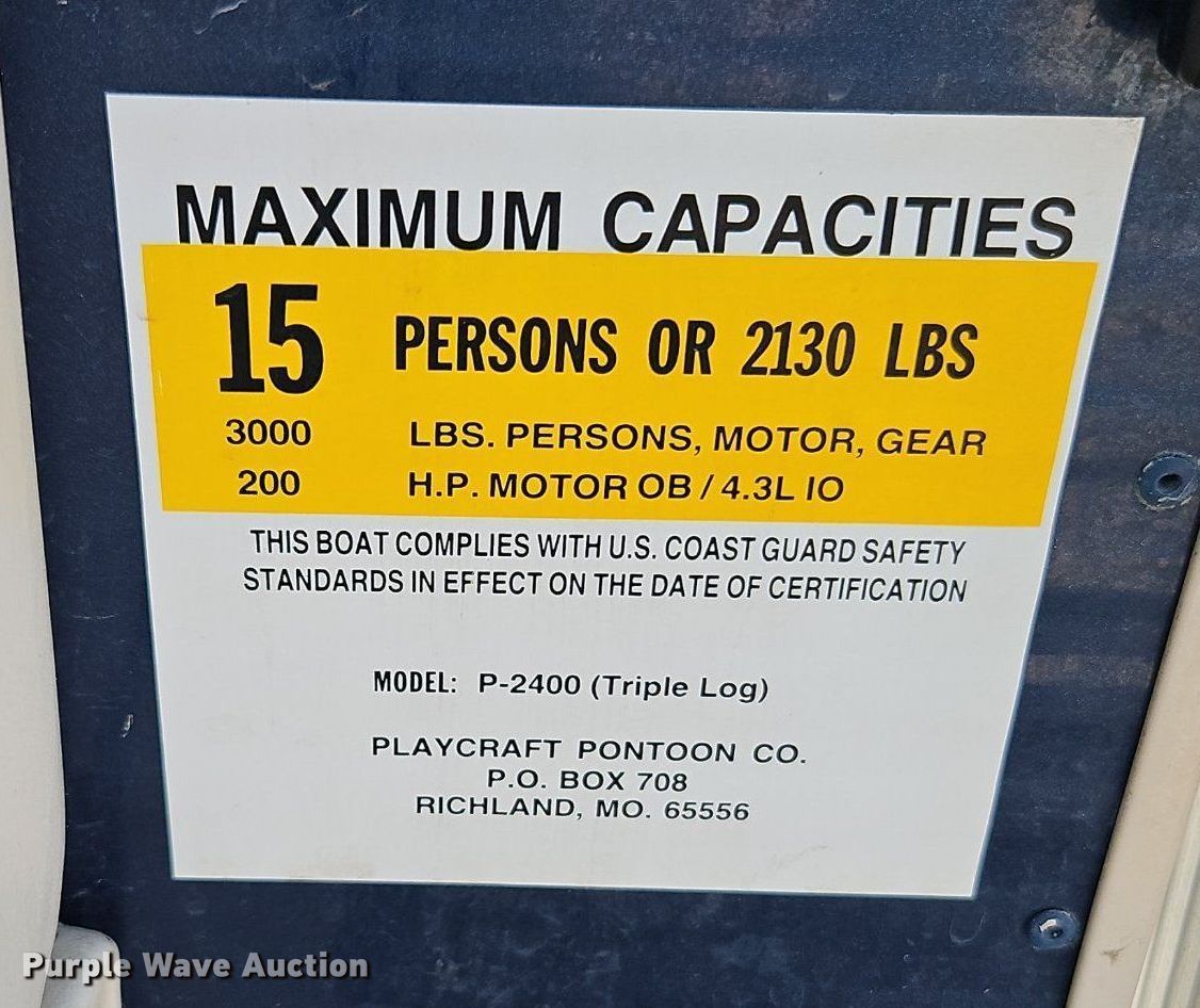 Purple Wave is selling a used Boat in Missouri. This item is a 2016 Play Craft Clipper 2400 pontoon boat with the following: Hours: Unknown, Length: 24', Hull ID: PLF97119H516, Unit #: 9