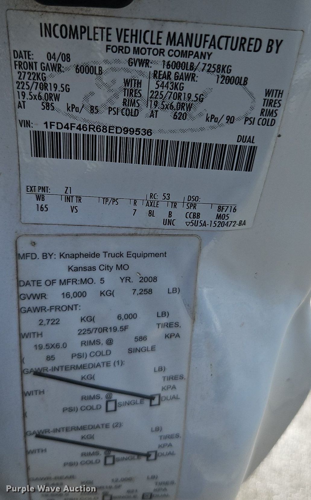 2008 Ford F450 Super Duty XL dump flatbed truck. Miles: 36,440 on odometer, Hours: 2,255 on meter, VIN: 1FD4F46R68ED99536. Engine Displacement: 6.4L V8 OHV, Cylinders: 8, Fuel type: Diesel. Transmission Automatic. Interior AC, Heat. Features Dump bed Knapheide PVMXT-113C, 11' 3" L x 96" W. Tires Size: 225/70R19.5. Notes AC issues, does not blow cold. Kansas title. Title distribution may be delayed up to 14 days from verification of funds. City of Overland Park, KS. Overland Park, KS 66213