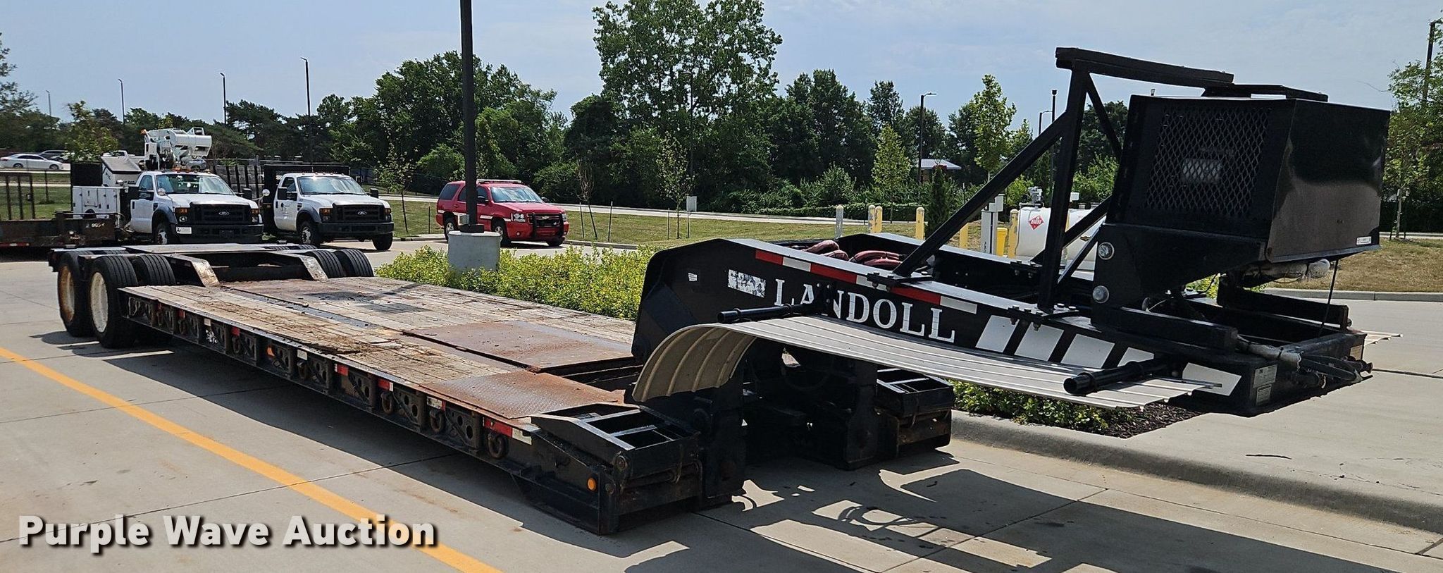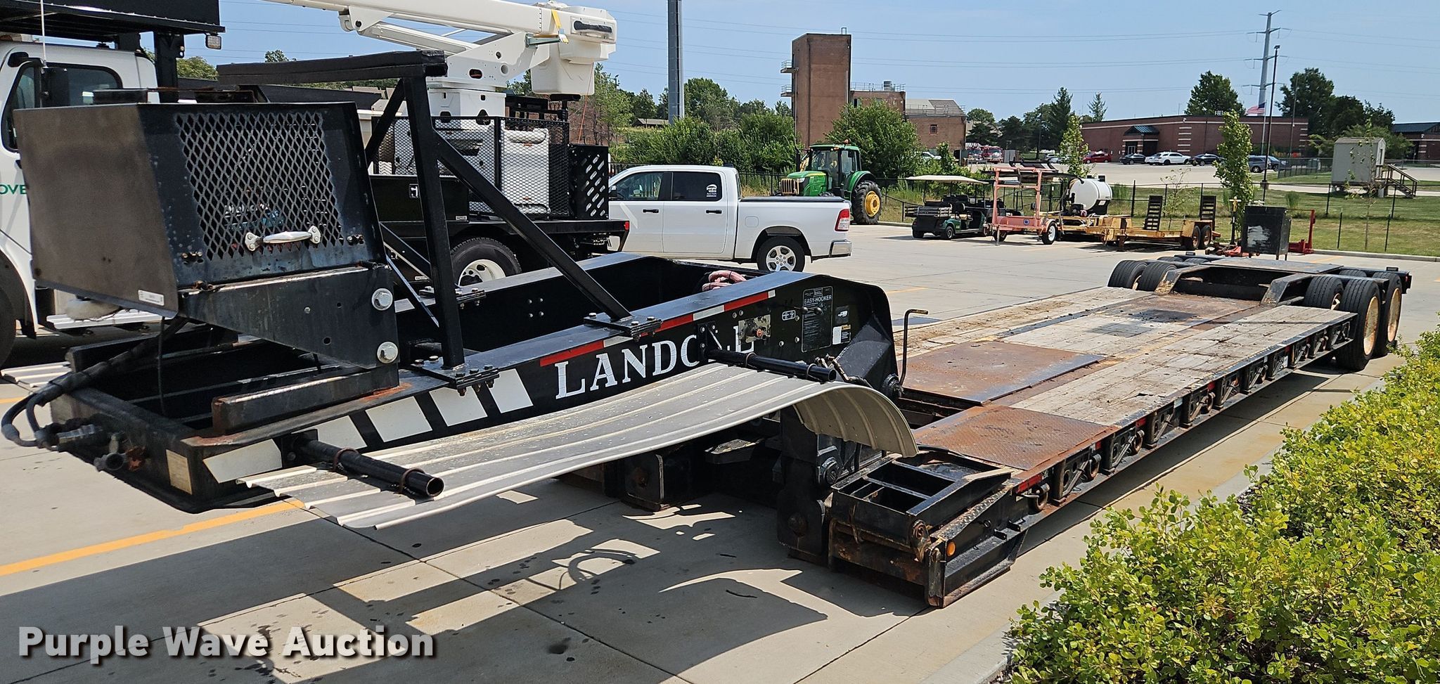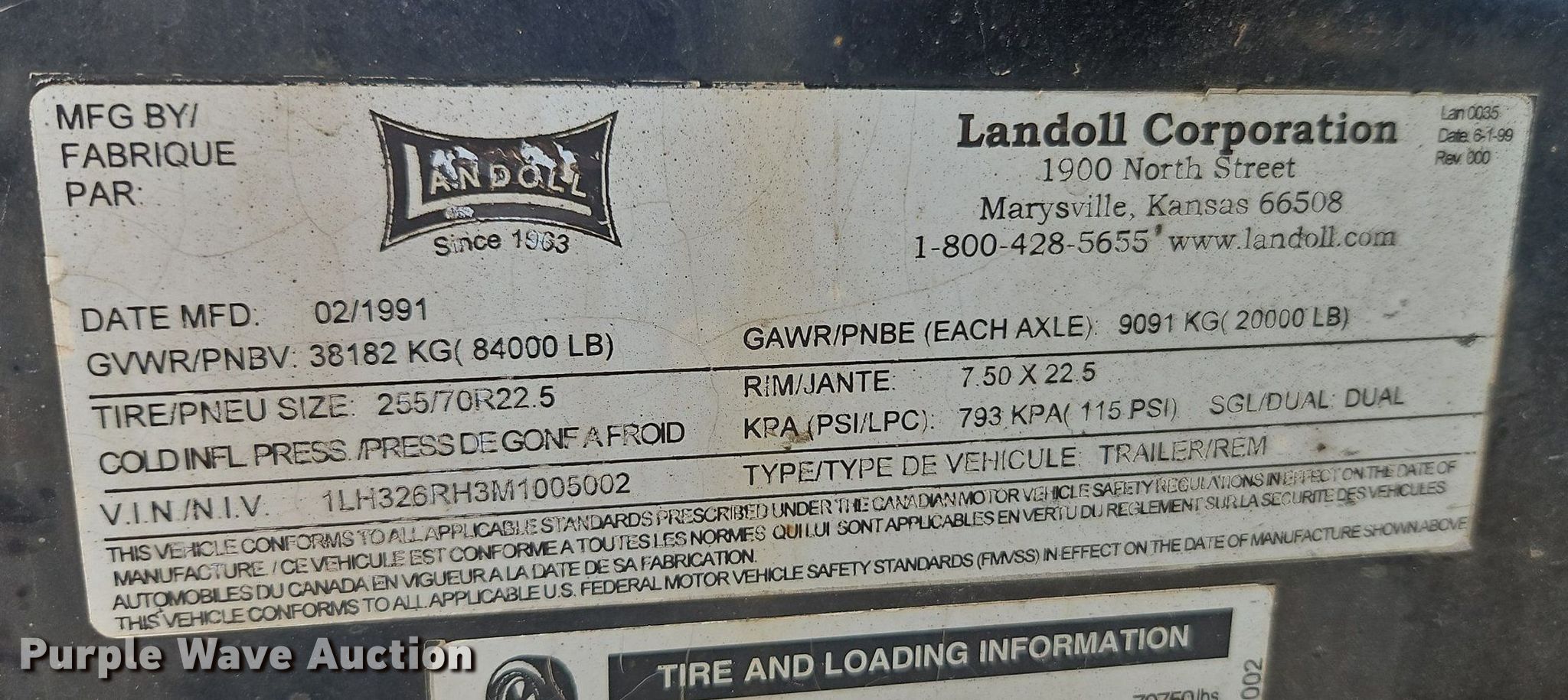 1991 Landoll lowboy equipment trailer. VIN: 1LH326RH3M1005002. Dimensions Overall: 42' L x 102" W, Deck: 23' 6" L x 102" W, Deck height: 20", Ramps: Manual Length: 2'. Features Deck type: Wood, Outriggers: Swing-out Board size: 10", Neck type: Detachable, Self-contained hydraulics, Hydraulic controls: Manual. Chassis Suspension: Spring, Brakes: Air, Axles: Tandem, GVWR: 84,000 lbs, GAWR: 20,000 lbs. Tires Steel wheels, Size: 255/70R22.5. Kansas title. Title distribution may be delayed up to 14 days from verification of funds. City of Overland Park, KS. Overland Park, KS 66213