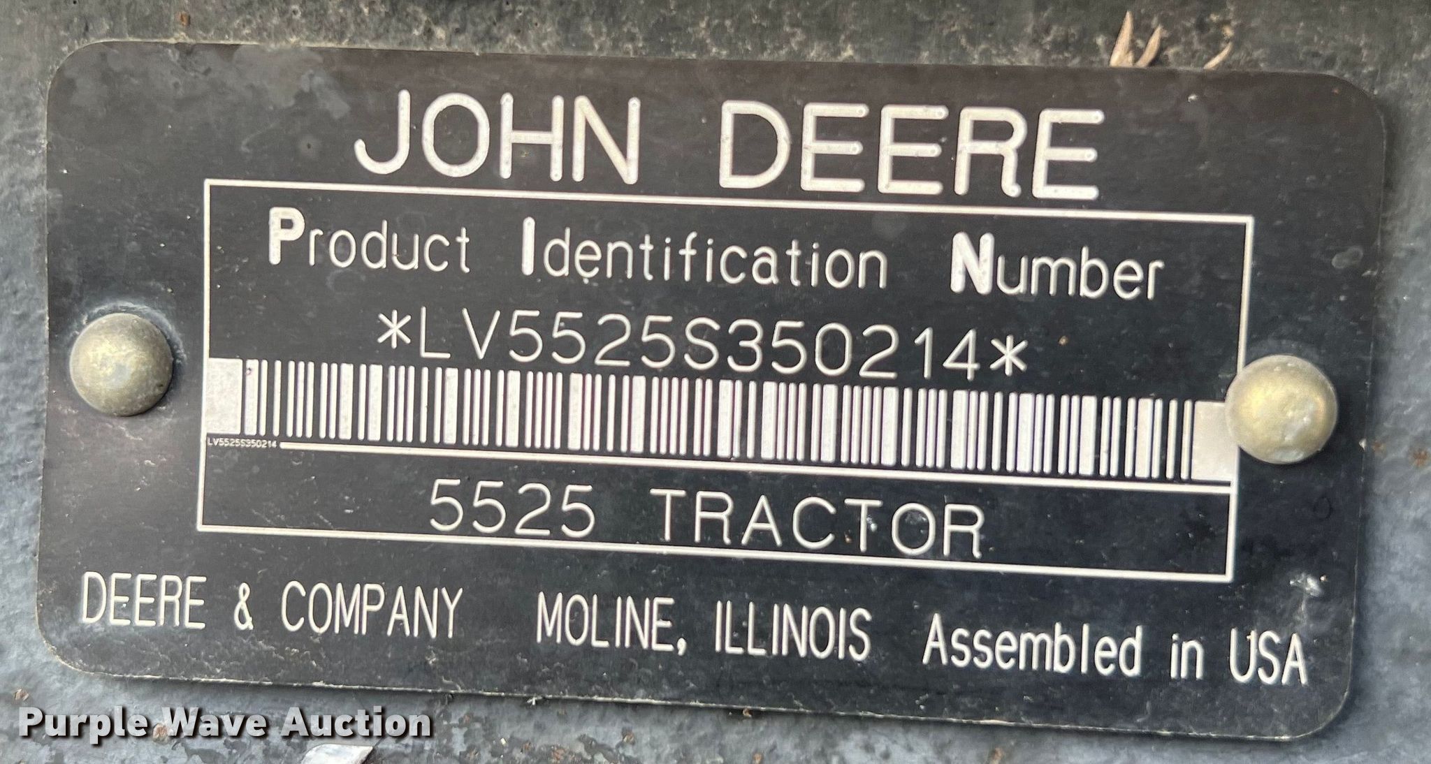 Purple Wave is selling a used Tractor in Texas. This item is a 2007 John Deere 5525 tractor with the following: Hours: 537 on meter, Serial: LV5525S350214, Unit #: 102