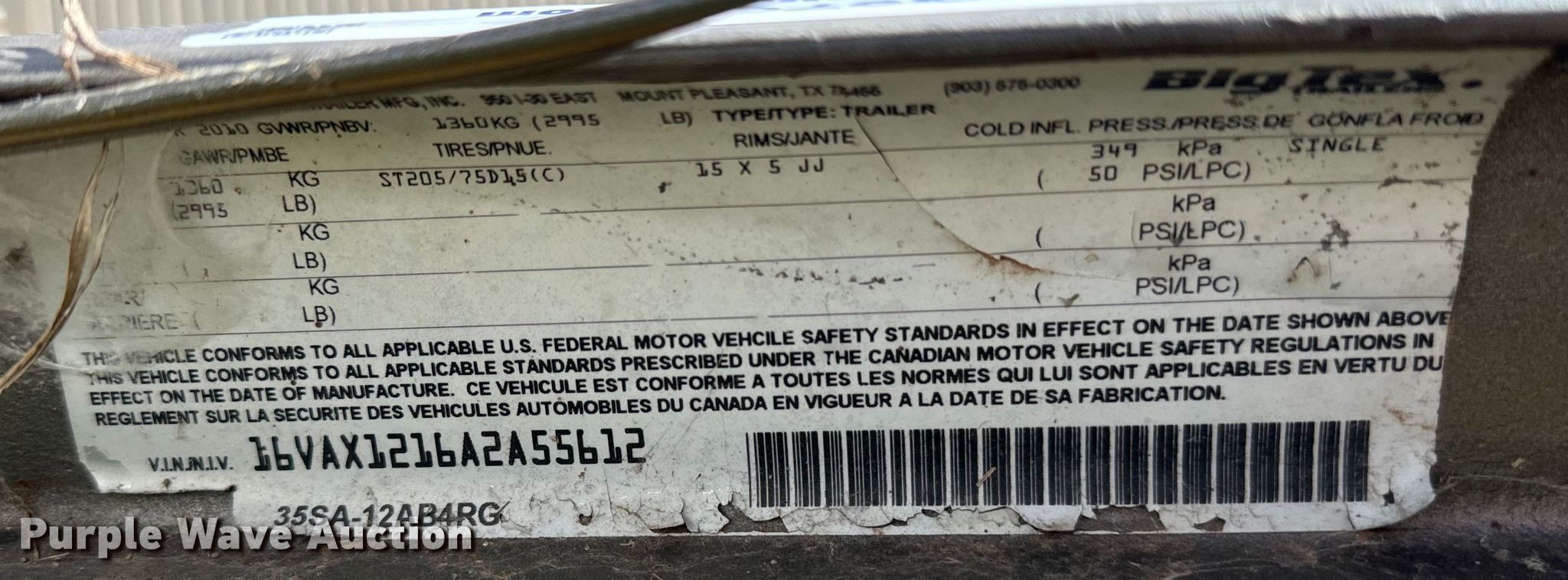 Purple Wave is selling a used Car or Utility Trailer in Oklahoma. This item is a 2010 Big Tex utility trailer with the following: VIN: 16VAX1216A2A55612