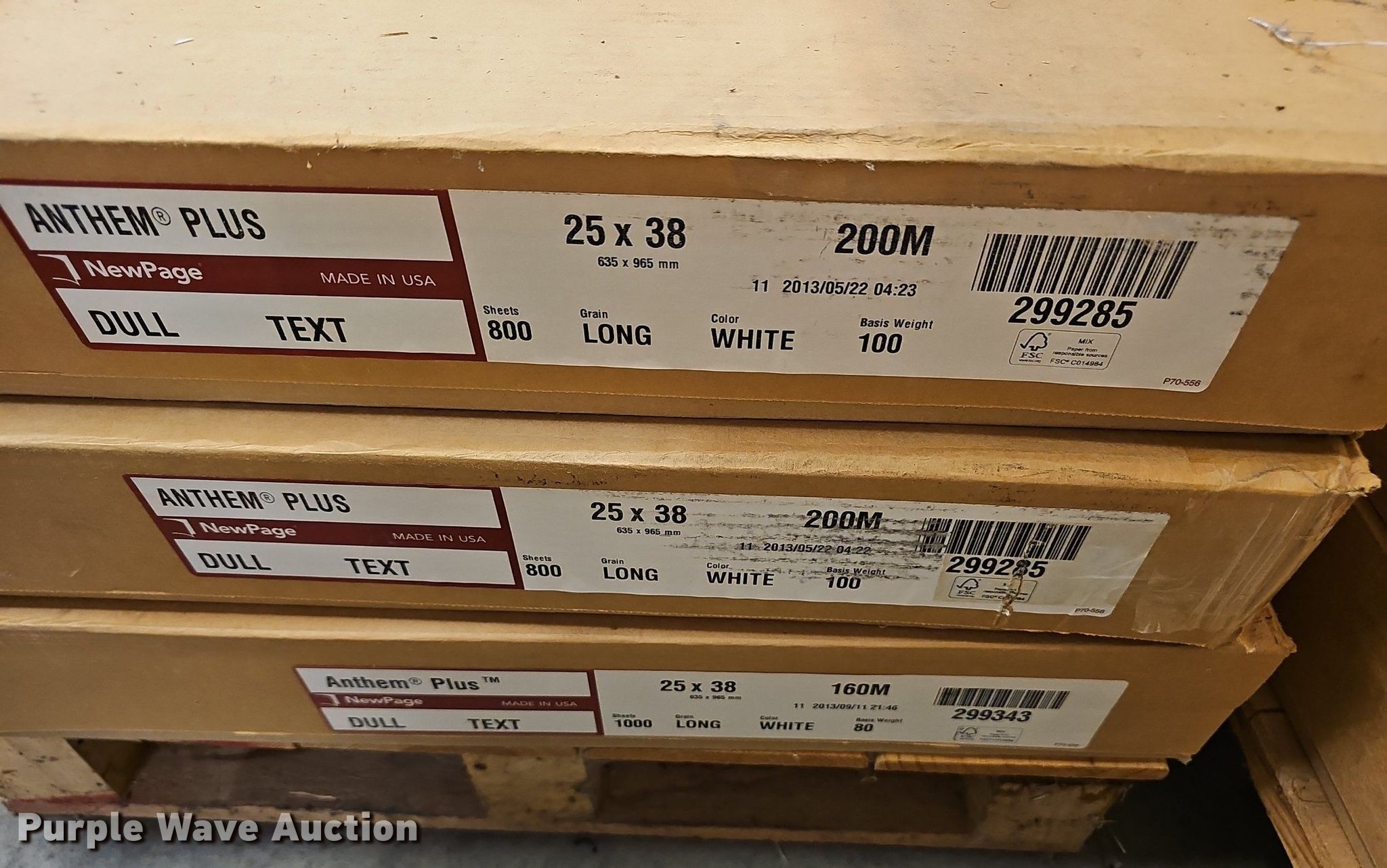Purple Wave is selling a used Other Industrial or Business in Kansas. This item is a Office supplies with the following: Paper stock, (2) sterling premium 20x26 matte cover, (5) anthem plus 20x26 satin cover, (6) anthem plus 23x35 gloss text, (3) anthem plus 25x38 dull text, (7) anthem plus 20x26 dull text, (2) sterling 23x35 litho C1S, (60) Assorted ink colors