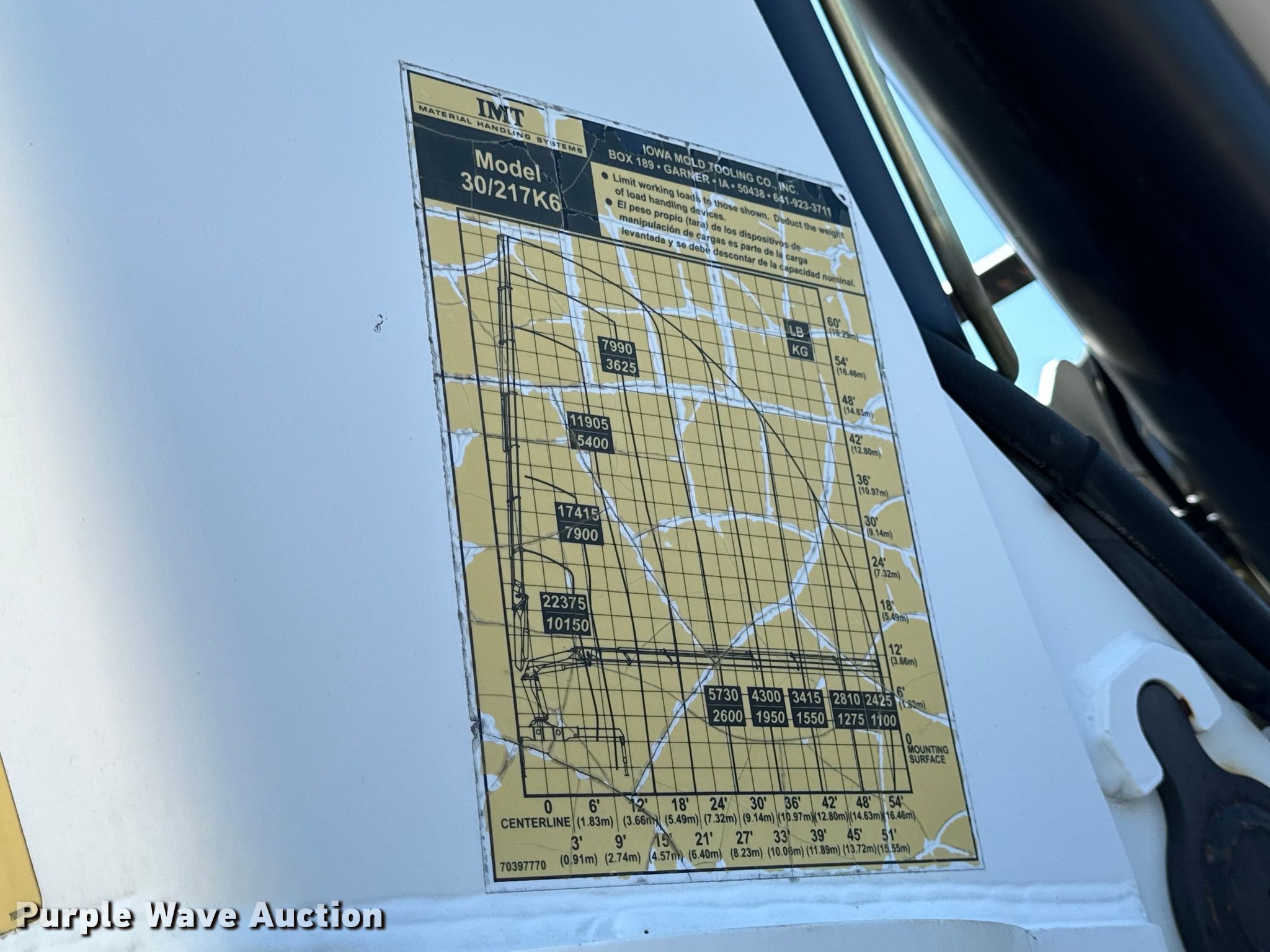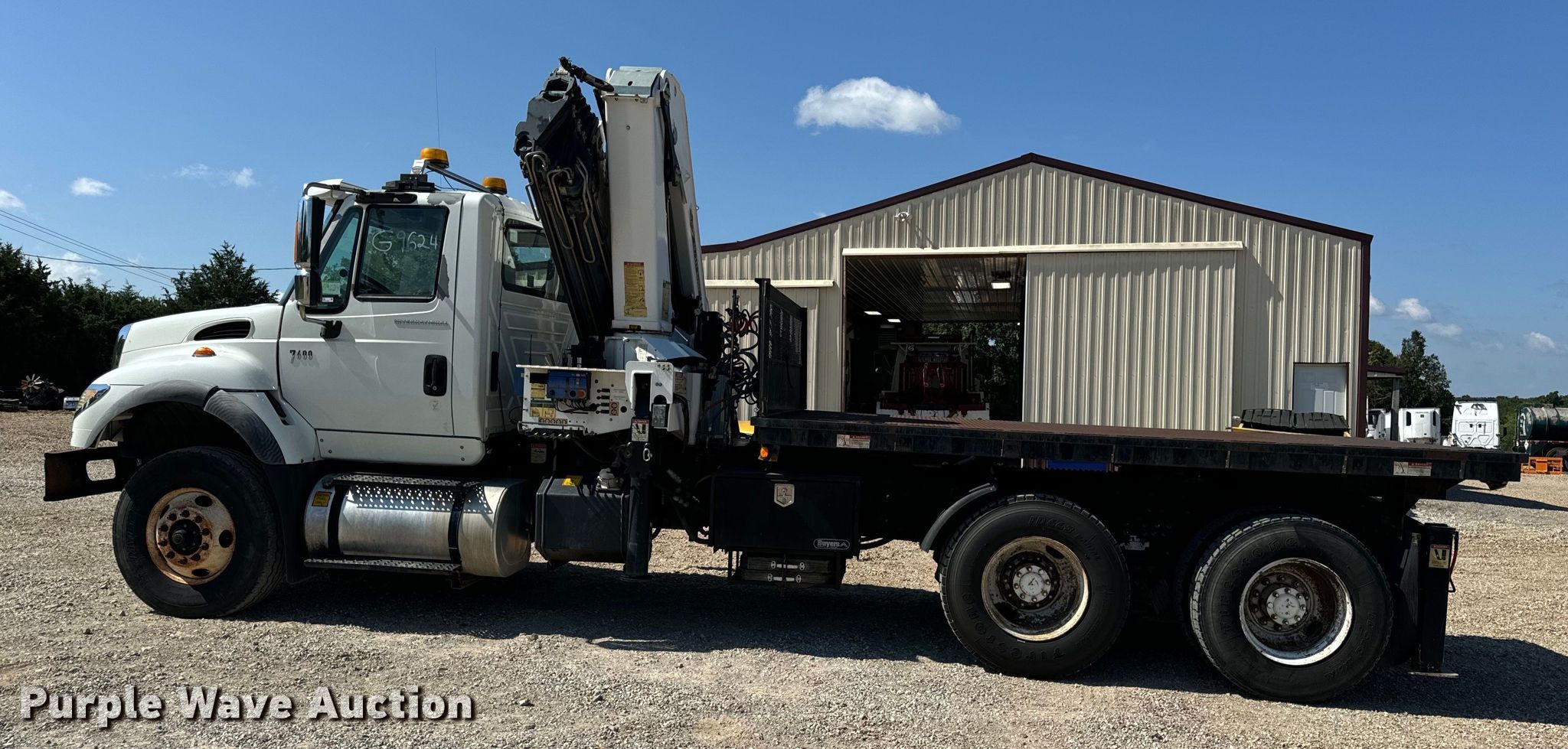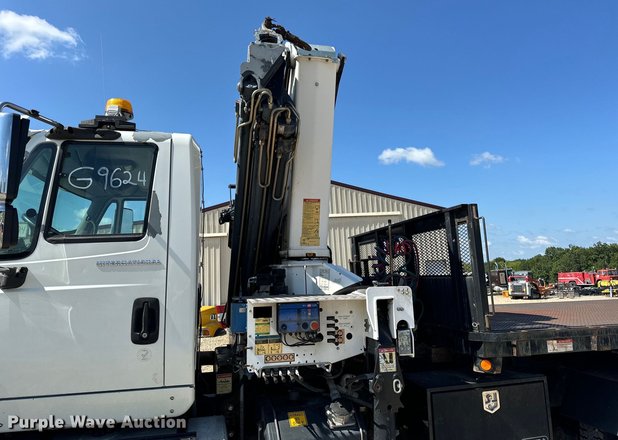 2005 International 7600 crane truck. Miles: 106,069 on odometer, Hours: 5,703 on meter, VIN: 1HTWYAHT55J176991, Unit #: G9625. Engine Cummins ISM, Displacement: 10.8L, Cylinders: 6, Fuel type: Diesel, Engine brake. Transmission Eaton Fuller, Manual, Speed: 10. Chassis Axles: Tandem, Suspension: Spring over walking beam, Brakes: Air, PTO, GVWR: 58,000 lbs FAWR: 18,000 lbs, IAWR: 20,000 lbs, RAWR: 20,000 lbs. Interior AC, Heat, Heated mirrors, Power windows, Power locks, Cruise control. Features Flatbed 13' 10" L x 96" W, Crane 2011 IMT 30/217 Serial: 771304, Telescopic, Knuckle, Maximum boom length: 54' Sections: 7, Maximum lift capacity: 22,375 lbs, Boom controls Ground, Remote control, Lift chart, Removable pinned-on flatbed, Fifth wheel plate Air operated, Sliding, Wet Kit. Tires Front: 315/80R22.5, Rear: 11R22.5. Notes AC needs charged. Missouri title. Title distribution may be delayed up to 14 days from verification of funds. Missouri Department of Transportation (MODOT). New Bloomfield, MO 65063