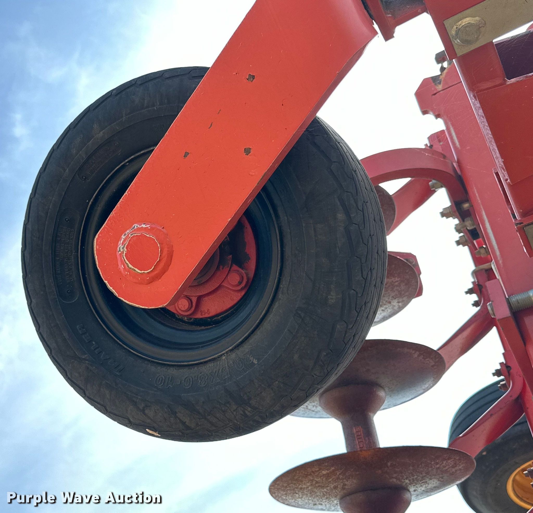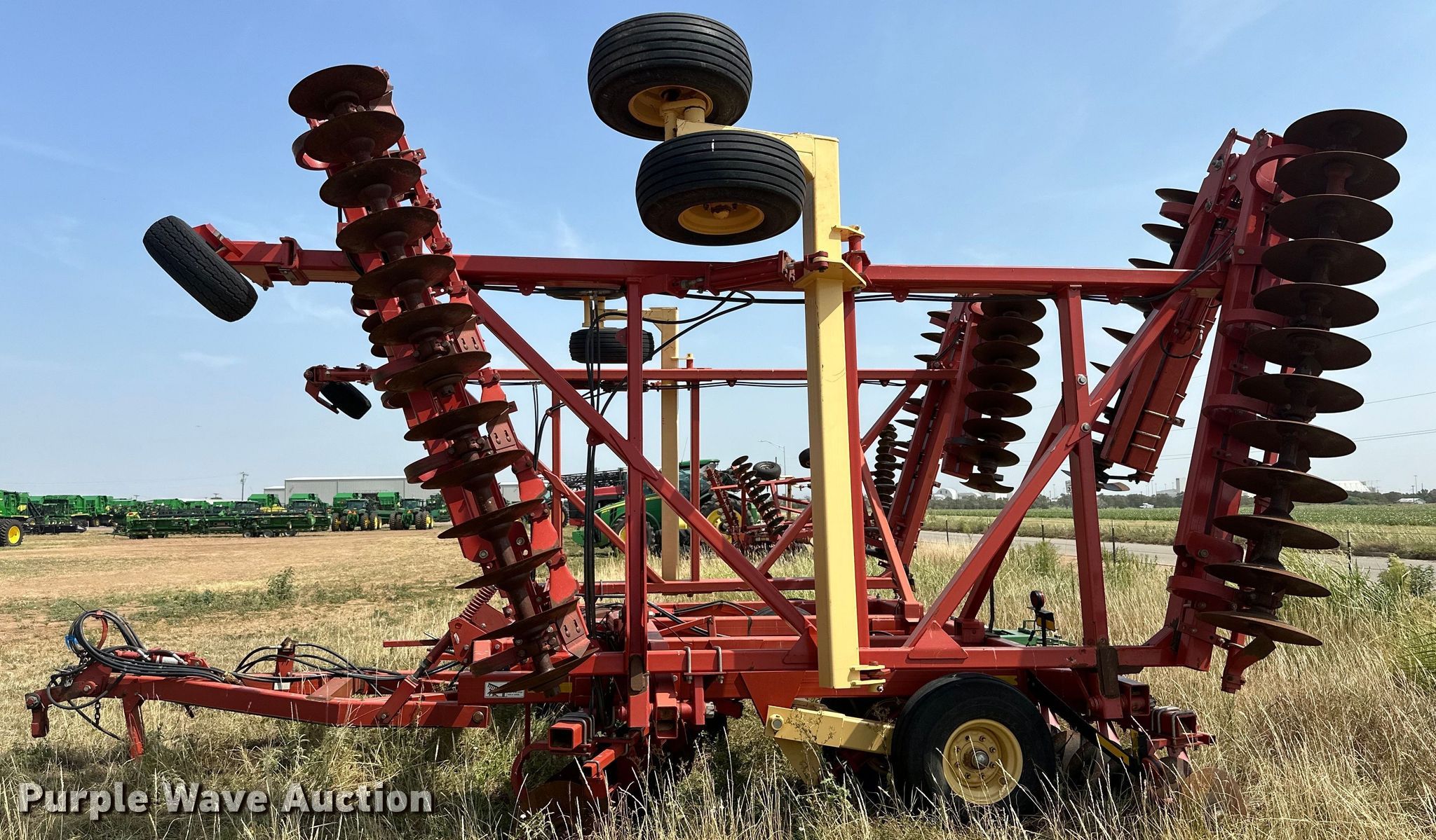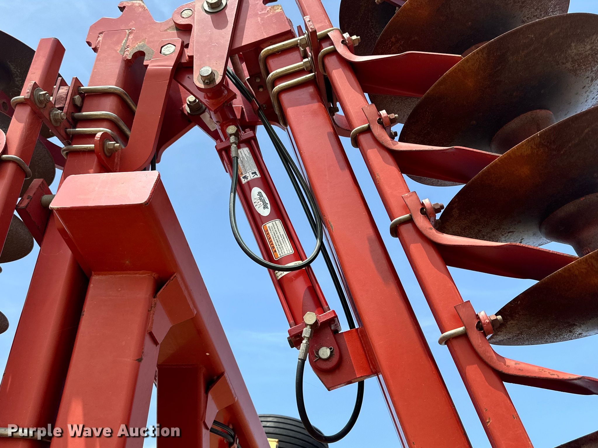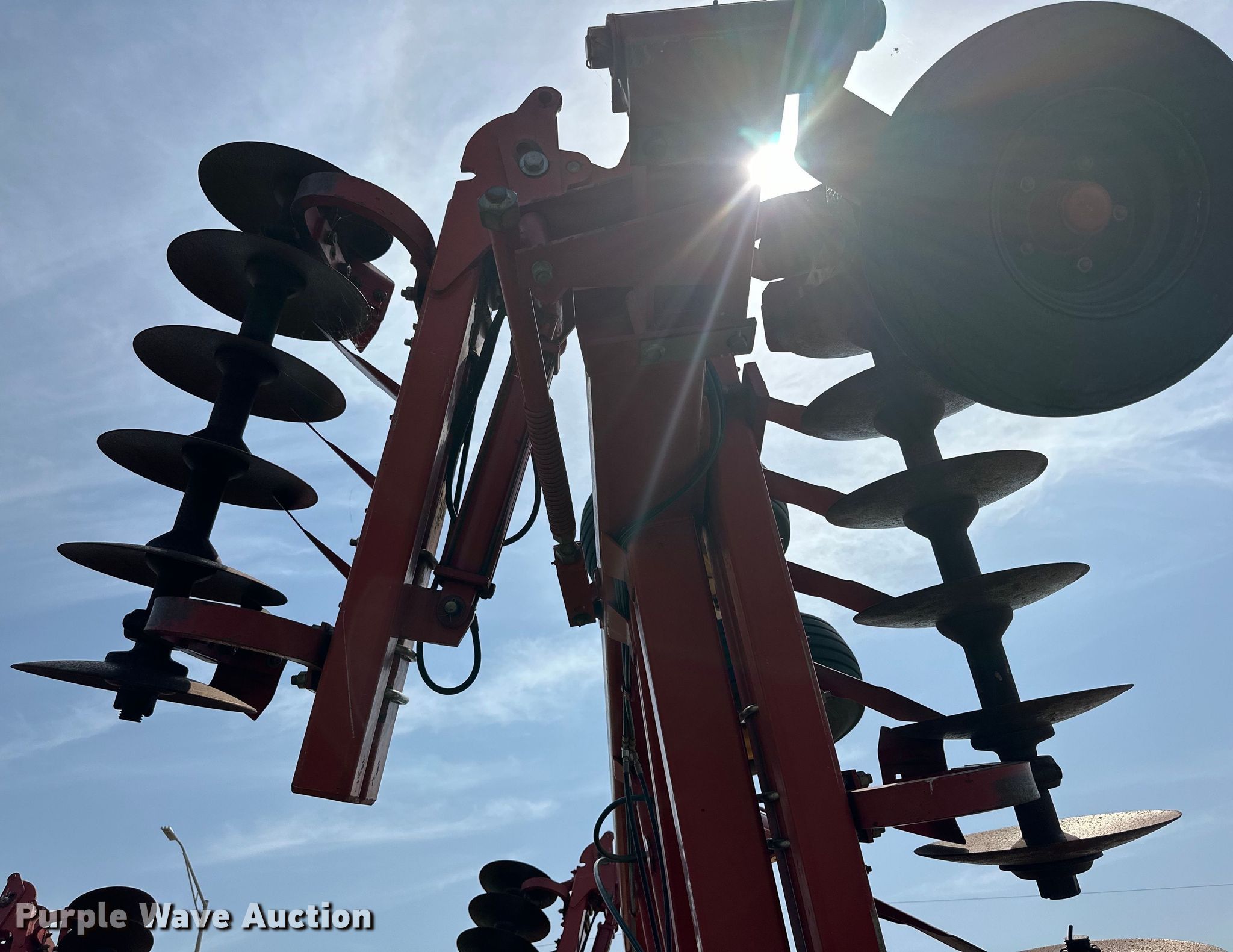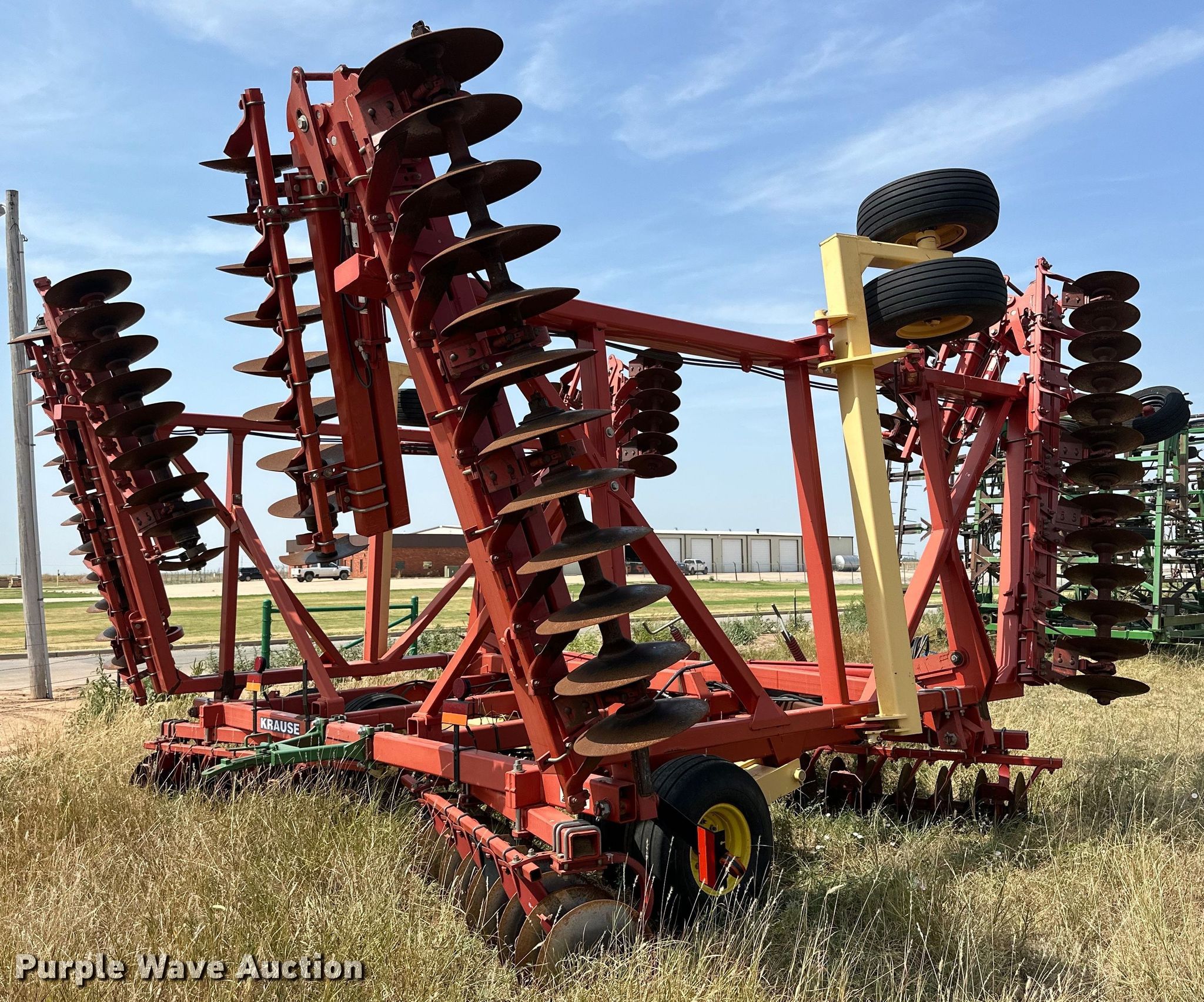 2009 Krause 7400-46WR disk. Overall width: 45', Serial: 1220. Features Front blades Diameter: 20", Spacing: 9", Rear blades Diameter: 21", Spacing: 9", Disk scrapers, Operation Hydraulic lift, Hydraulic fold, Leveler: Manual. Tires Tire size: 12.5SL-15, Gauge wheels Size: 20.5x8.0-10. Western Equipment. Altus, OK 73521