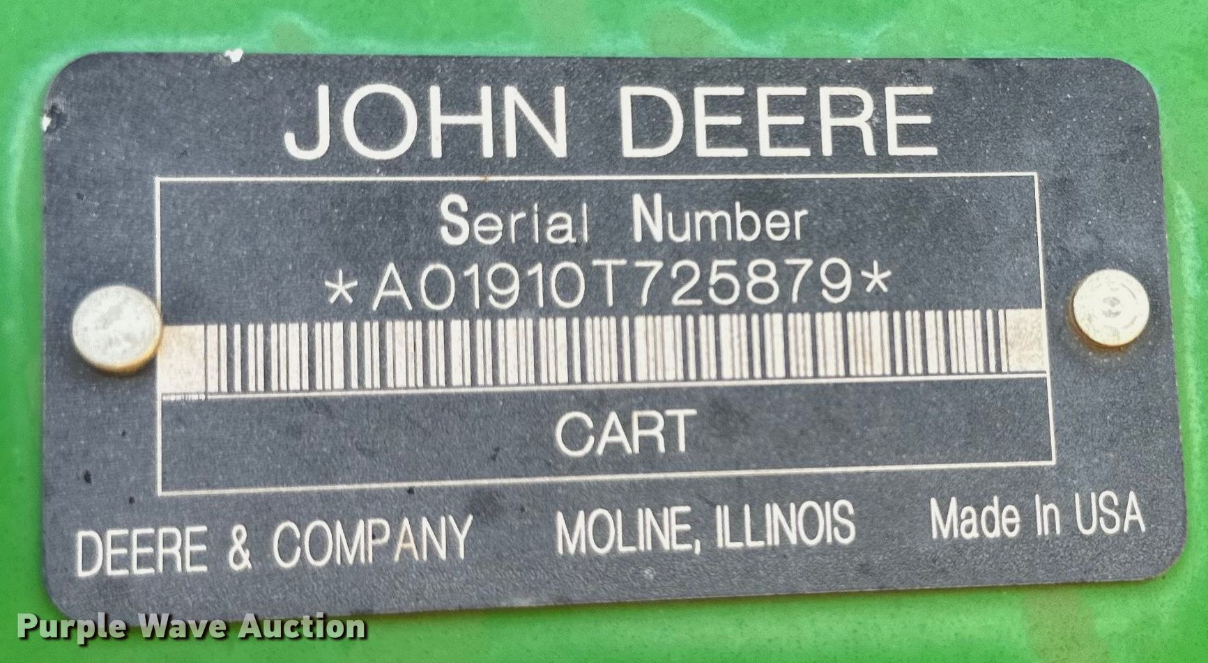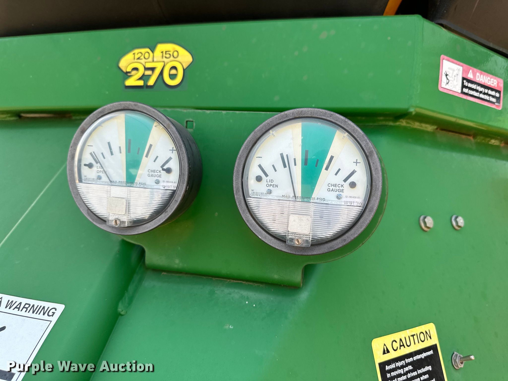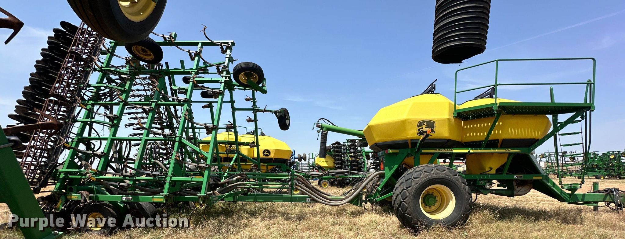 John Deere 730 air seeder. Width: 34', Row units: 70, Row spacing: 7", Serial: A00730X715105. Features Frame Fold type: Wing, Seed delivery Bulk fill system, Air commodity cart 2008 John Deere 1910, Serial: A01910T725879, Row units Meter drive: Ground, Down pressure: Spring, Disk openers: Double, Closing system: Single Type: Rubber.. Tires Transport tire size: 28L-26, Drive/ outside tire size: 280/70R15 Quantity: 8. Western Equipment. Altus, OK 73521