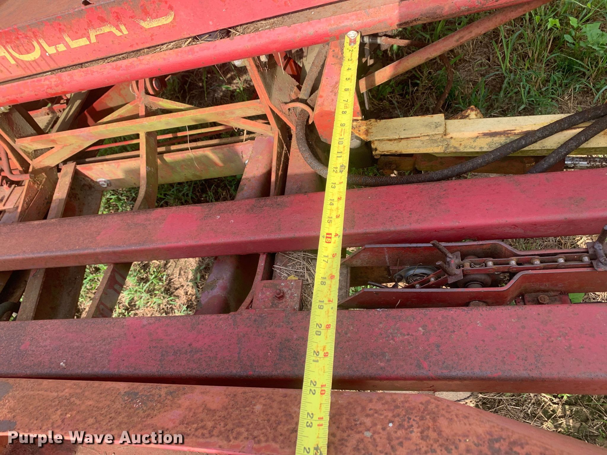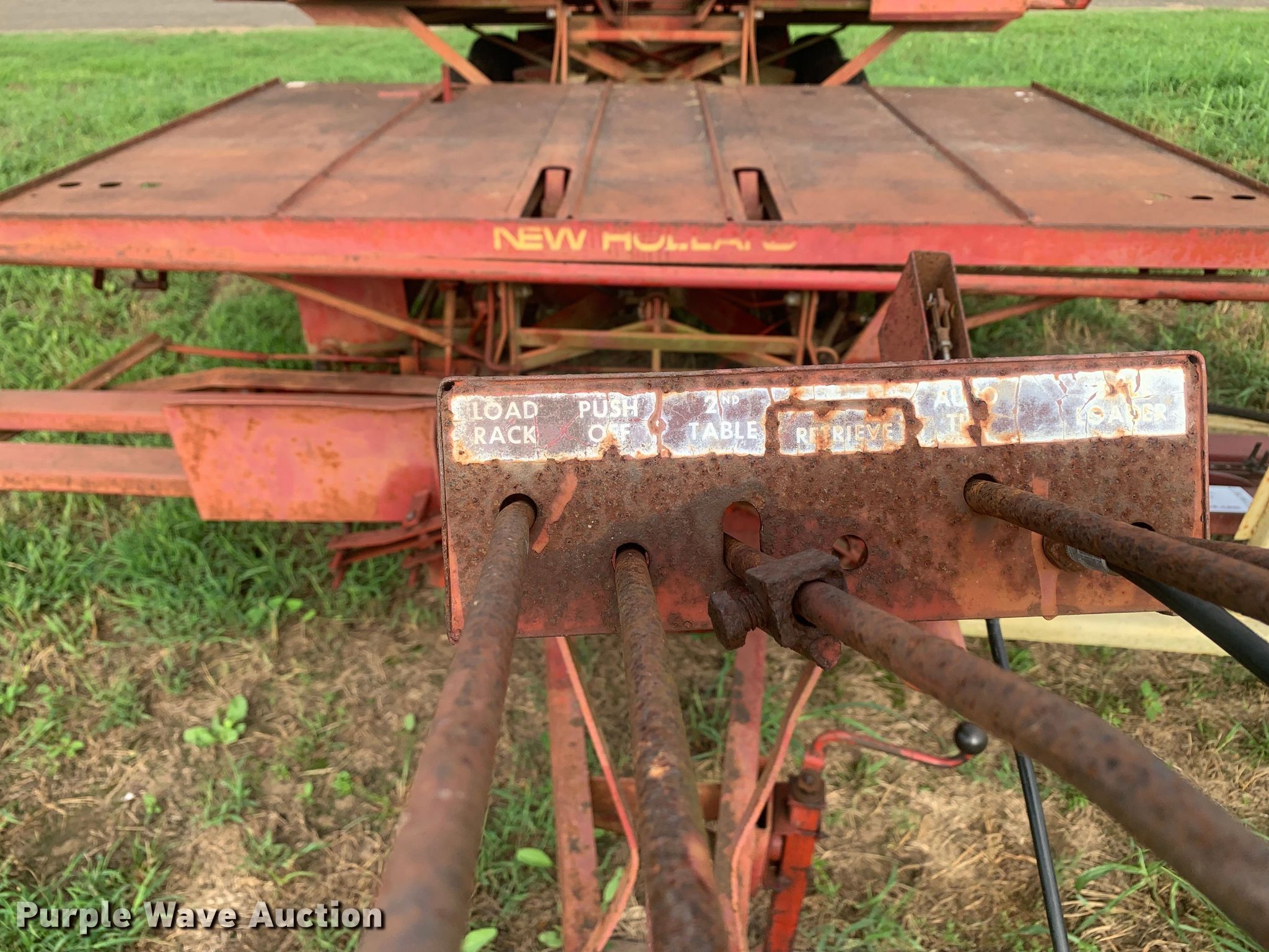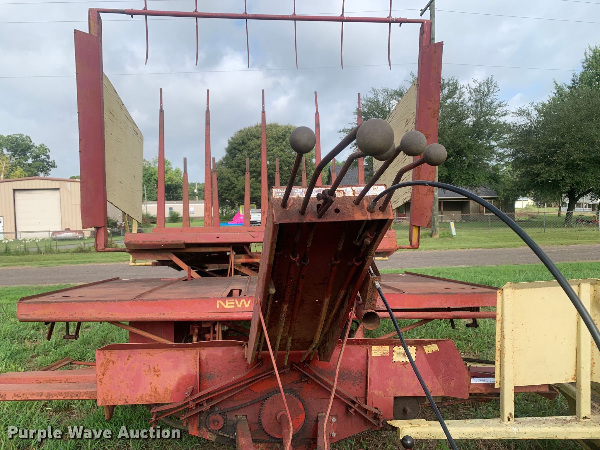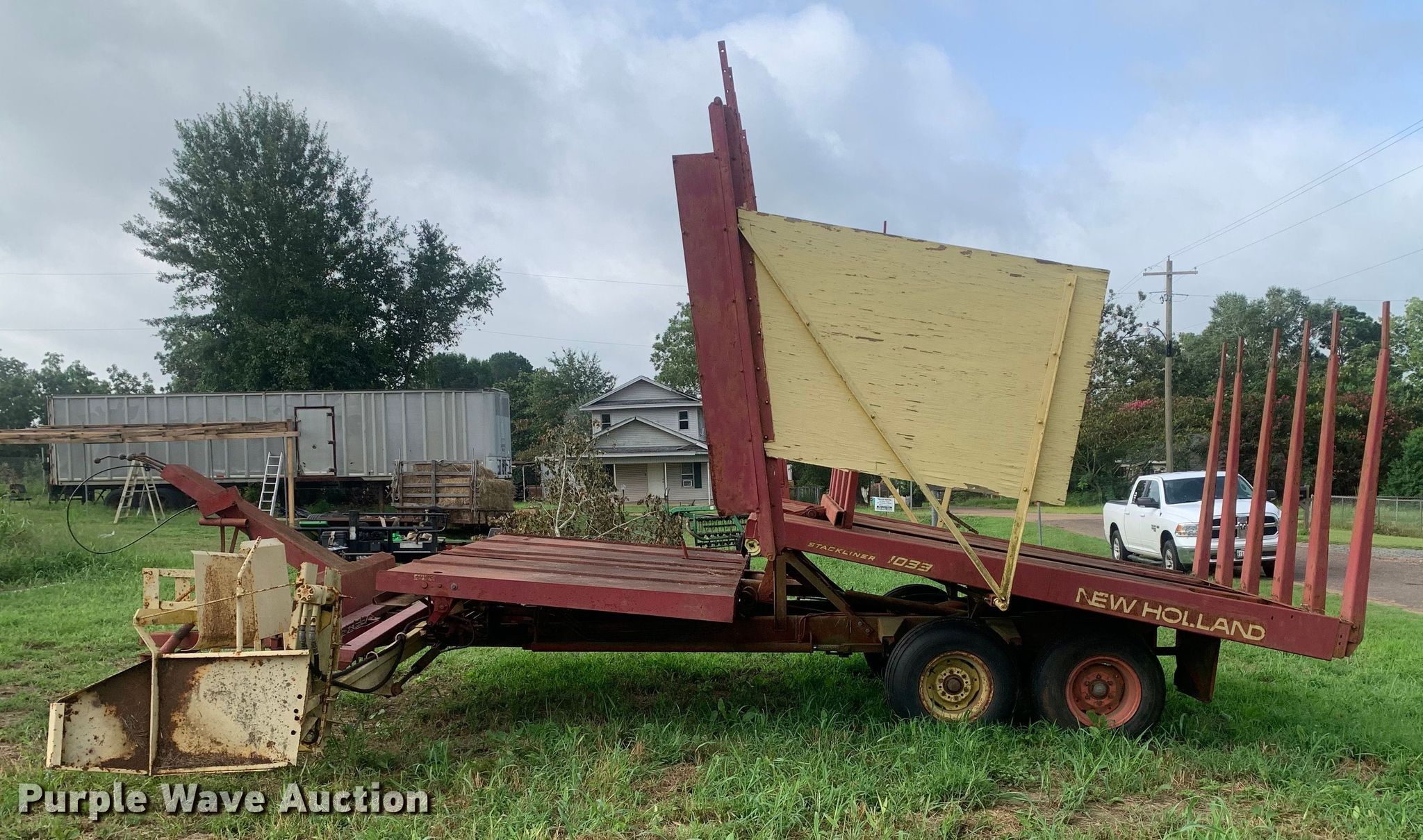 New Holland 1033 bale accumulator. Serial: 4813. Features Load chute: 19" W, Conveyor 9' 3" L x 21" W, Hydraulic dual deck Front deck 9' 4" L x 6' 3" W, Rear deck 9' L x 10' 9" W, 540 PTO shaft. Tires Size: 11L-15Sl. Notes Tractor not included. Bloomburg, TX 75556