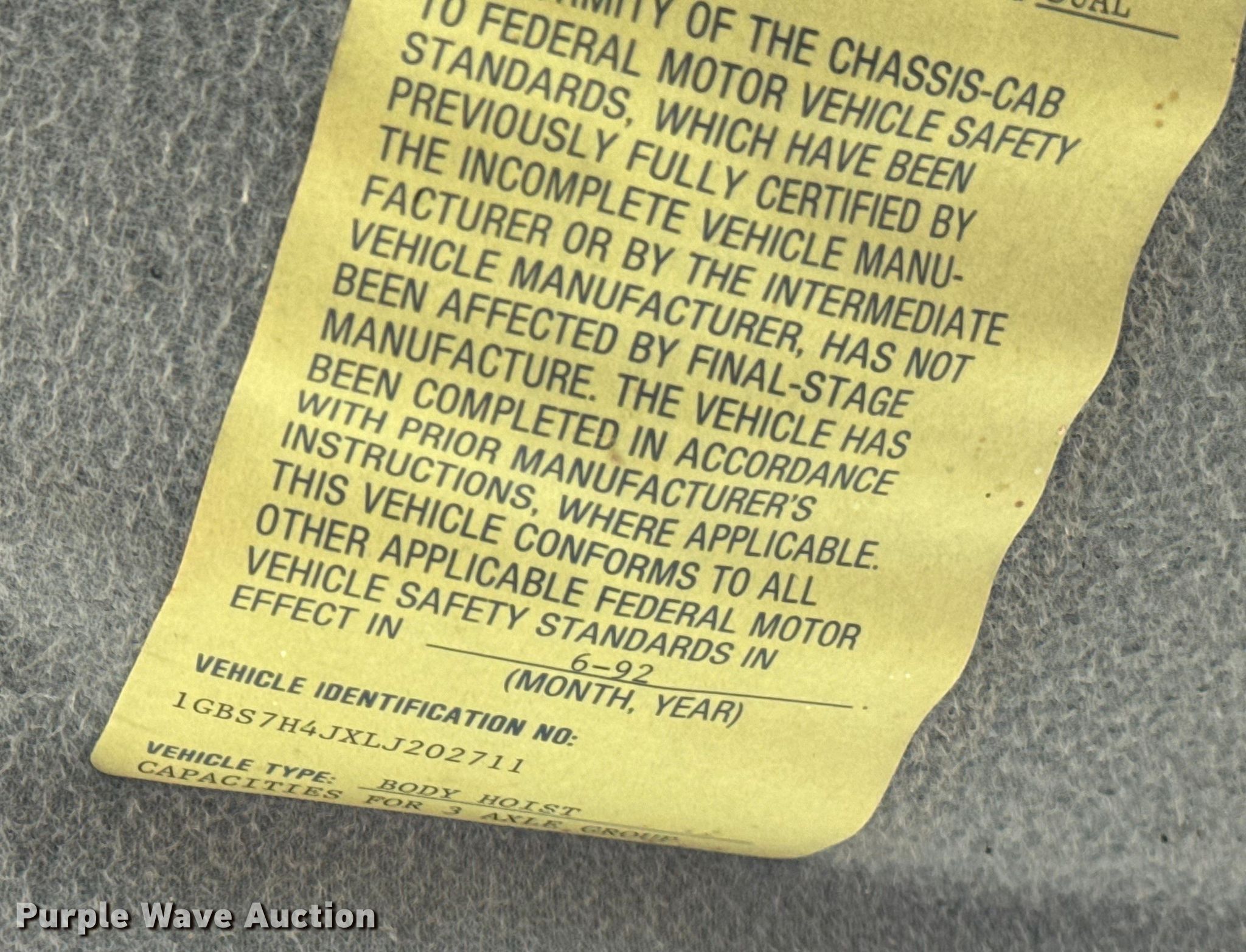 1990 Chevrolet Kodiak C7 grain truck. Miles: 60,287 on odometer, VIN: 1GBS7H4JXLJ202711. Engine Caterpillar 3116, Displacement: 6.6L, Cylinders: 6, Fuel type: Diesel. Transmission Automatic. Chassis Axles: Triple, Pusher axle, Differential lock: Inter-axle, Suspension: Spring over walking beam, Brakes: Air, PTO, GVWR: 56,830 lbs. Interior Heat. Features Dump bed Omaha Standard, 22' L x 96" W, Side height: 60", Bed type: Steel, Roll tarp, Ram: Dual, End gate: Manual. Tires Size: 11R22.5, Lift axle: 215/75R17.5. Notes Windshield chipped or cracked. Nebraska title. Leo Jessen Wyobraska Inc.. Oshkosh, NE 69154