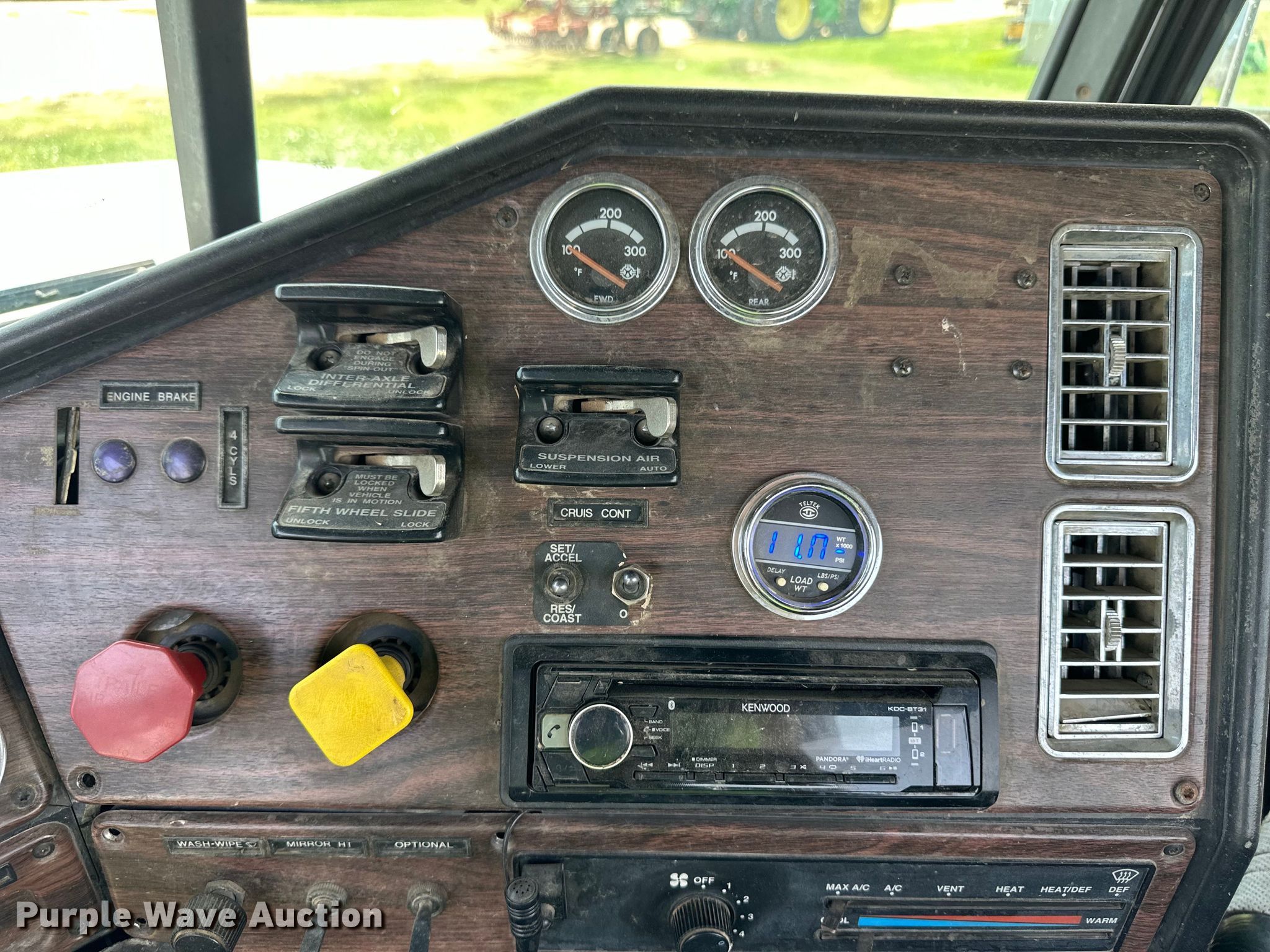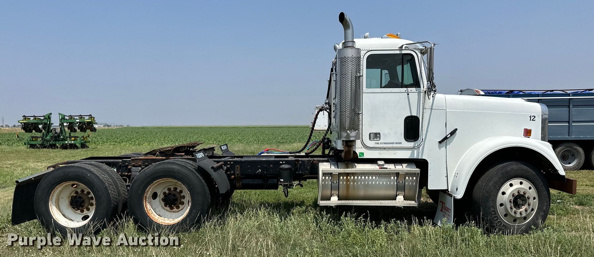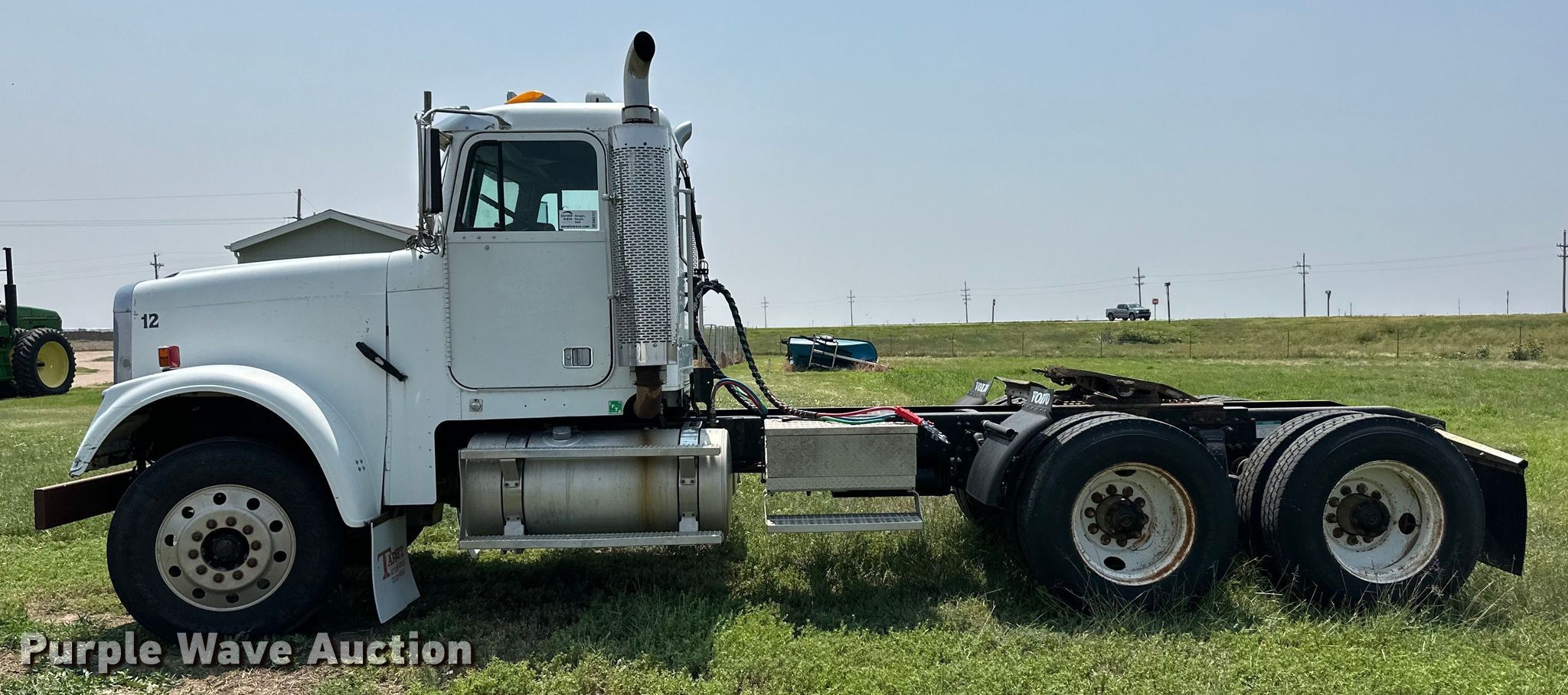 2000 Freightliner FLD semi truck. Miles: 908,167 on odometer, VIN: 1FUPFWEB5YPF66602. Engine Caterpillar C12, Serial: 2KS13105, Displacement: 12.0L, Cylinders: 6, Fuel type: Diesel, HP: 430, Engine brake. Transmission Meritor RMX10-165C, Manual, Speed: 10. Chassis Axles: Tandem, Differential lock: Inter-axle, Suspension: Air Dump valves, Brakes: Air. Interior AC, Heat, Heated mirrors, Cruise control, Air ride cab. Features Fifth wheel type: Air operated, Sliding, Fuel tank: Dual. Tires Size: 11R24.5. Kansas title. Title distribution may be delayed up to 30 days from verification of funds. Rundell Farms. Garden City, KS 67846