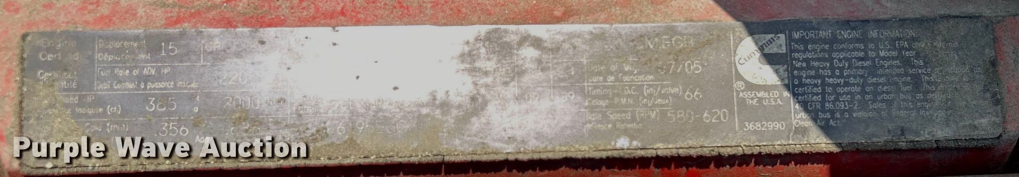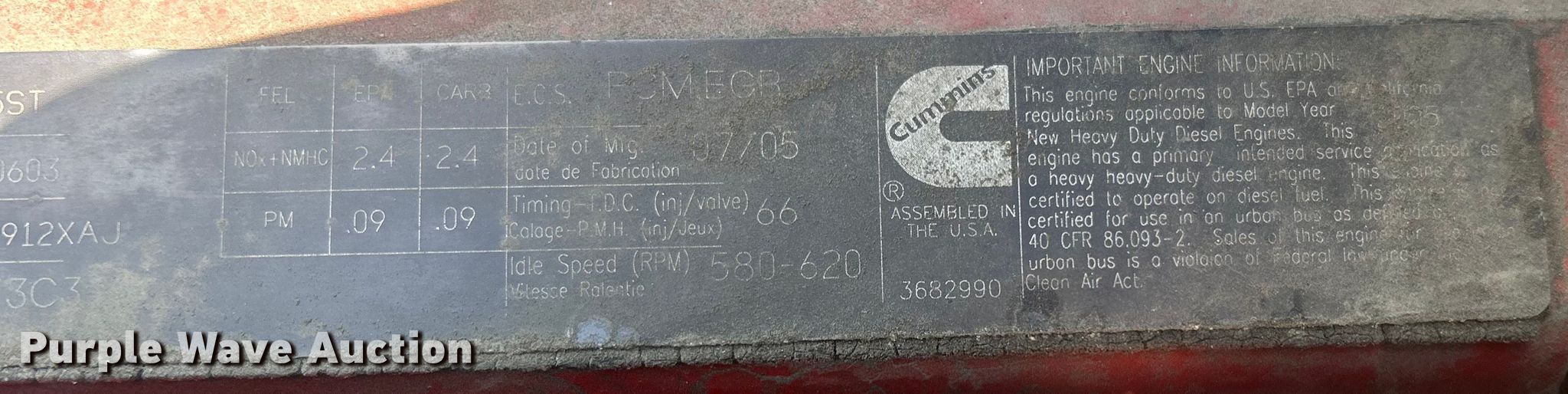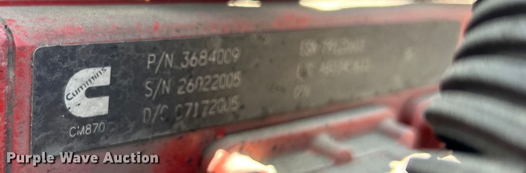 2006 International 9400i semi truck. Miles: 772,304 on odometer, VIN: 2HSCNAPR96C234994. Engine Cummins ISX 385ST, Serial: 79120603, Displacement: 15.0L, Cylinders: 6, Fuel type: Diesel. Transmission Meritor, Manual, Speed: 10. Chassis Axles: Tandem, Differential lock: Inter-axle, Suspension: Air Dump valves, Brakes: Air. Interior AC, Heat, Heated mirrors, Power locks, Cruise control. Features Deck plate: Aluminum, Fifth wheel type: Fixed, Fuel tank: Dual. Tires Size: 295/75R22.5. Notes Dash warning indicator: ABS, Windshield chipped or cracked. Oklahoma title. 15107 North 137th East Avenue. Collinsville, OK 74021