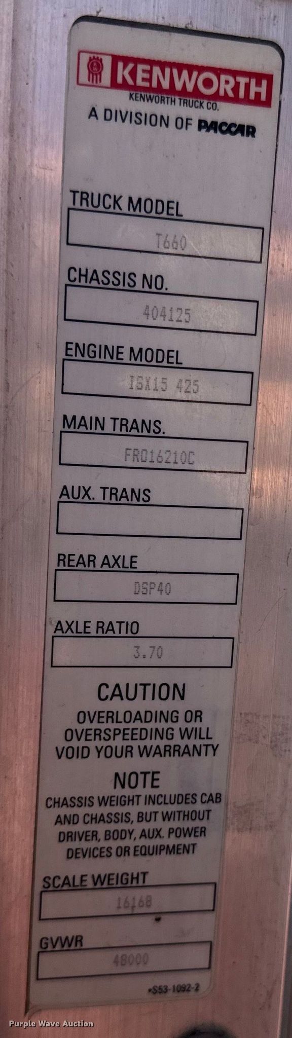 2014 Kenworth T660 semi truck. Miles: 668,404 on odometer, Hours: 18,768 on meter, VIN: 1XKAD49X3EJ404125. Engine Cummins ISX15, Displacement: 15L, Cylinders: 6, Fuel type: Diesel, HP: 425, Engine brake. Transmission Eaton Fuller, Manual, Speed: 10. Chassis Axles: Tandem, Gear ratio: 3.70, Differential lock: Inter-axle, Suspension: Air Dump valves, Brakes: Air, GVWR: 48,000 lbs FAWR: 12,350 lbs, IAWR: 18,000 lbs, RAWR: 18,000 lbs. Interior AC, Heat, Heated mirrors, Power windows, Power locks, Cruise control, Air ride cab. Features Deck plate: Aluminum, Fifth wheel type: Fixed, Fuel tank: Single. Tires Size: 295/75R22.5. California title. Title distribution may be delayed up to 30 days from verification of funds. TSG Fleet Services. Fontana, CA 92337