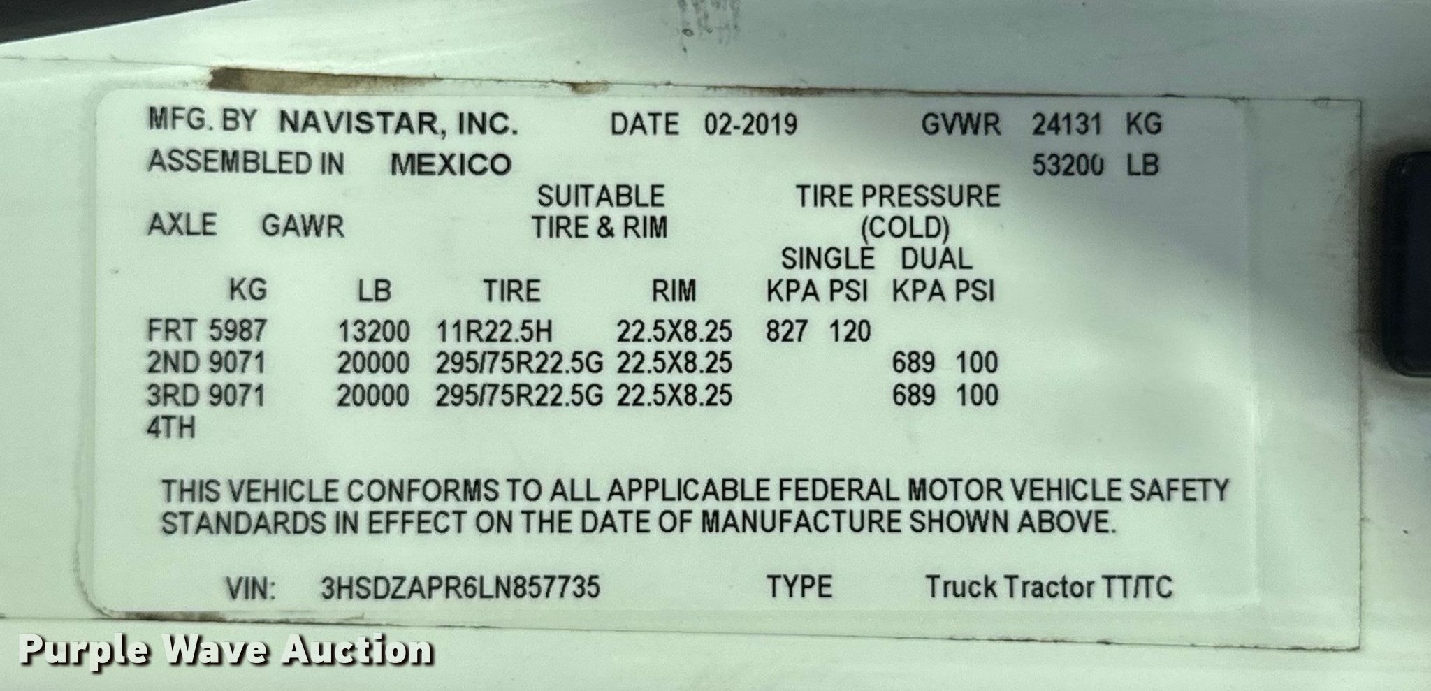 2020 International LT625 semi truck. Miles: 535,691 on odometer, Hours: 22,635 on meter, VIN: 3HSDZAPR6LN857735. Engine Cummins X15, Serial: 80149480, Displacement: 15.0L, Cylinders: 6, Fuel type: Diesel. Transmission Automated manual. Chassis Axles: Tandem, Differential lock: Inter-axle, Suspension: Air Dump valves, Brakes: Air, GVWR: 53,200 lbs FAWR: 13,200 lbs, IAWR: 20,000 lbs, RAWR: 20,000 lbs. Interior AC, Heat, Heated mirrors, Power windows, Power locks, Cruise control, Air ride cab, Sleeper Sleeper length: 5', Beds: Single, Rear climate control. Features Deck plate: Aluminum, Fifth wheel type: Air operated, Sliding, Fuel tank: Dual. Tires Front: 295/75R22.5, Rear: 275/80R22.5. Notes Windshield chipped or cracked. Oklahoma title. Carco Rentals. Fort Smith, AR 72904
