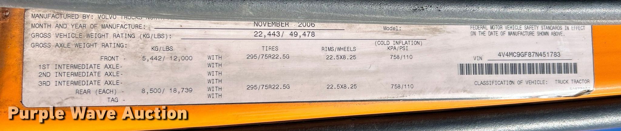 Purple Wave is selling a used Truck Tractor in Missouri. This item is a 2007 Volvo VN semi truck with the following: Miles: 1,380,117 on odometer, VIN: 4V4MC9GF87N451783