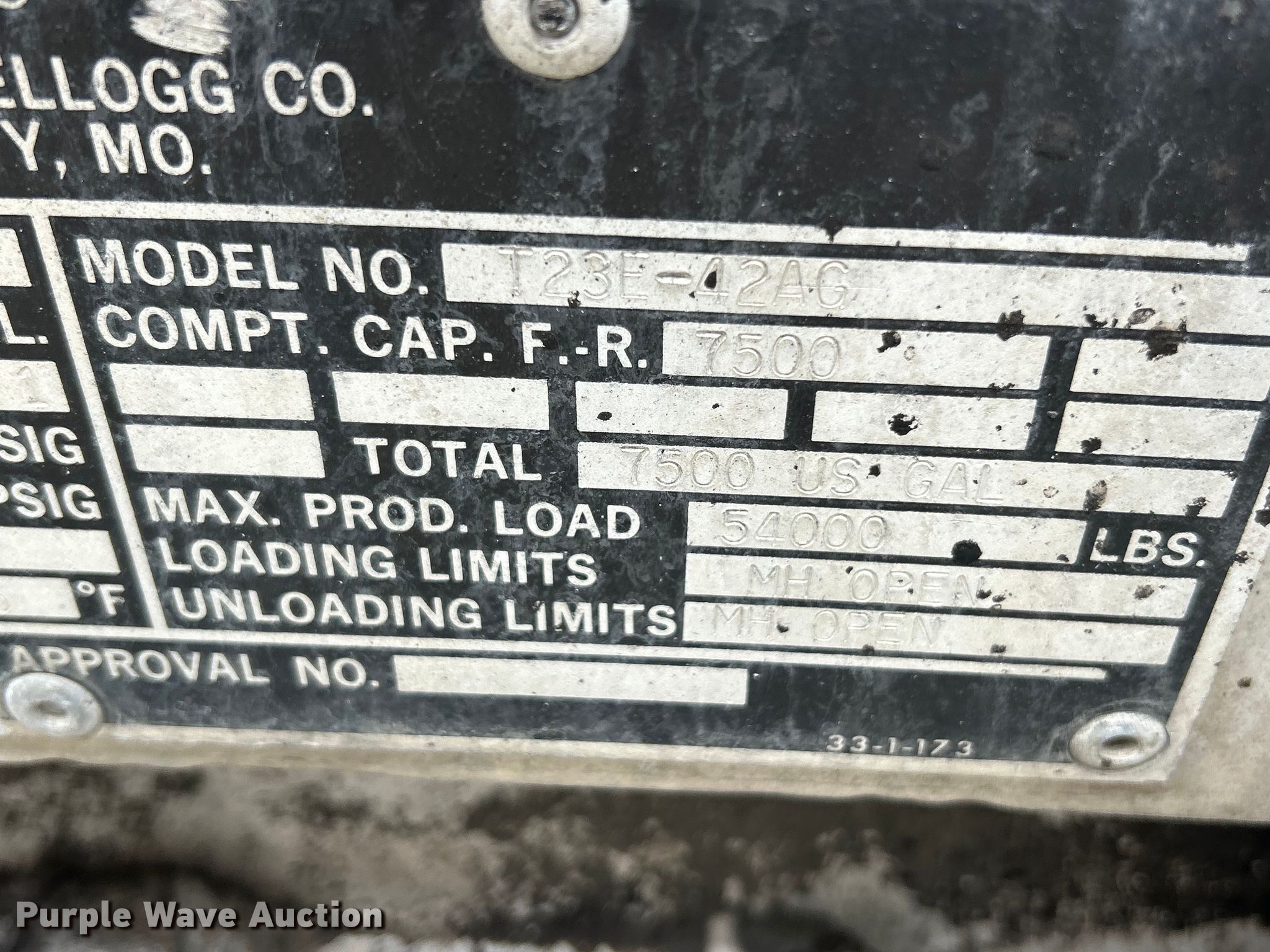 1981 Trailmobile T23E-42AG tank trailer. VIN: 1PTT23EJ3B4000578. Dimensions Overall: 42' L x 96" W. Features Tank type: Aluminum Capacity: 7,500 gallons, Outlet valves: 1 Size: 3", No. of manways/manholes: 1 Width: 18", Pump Outlet size: 3". Chassis Landing gear: Dual, Suspension: Spring, Brakes: Air, Axles: Tandem, GVWR: 64,200 lbs, GAWR: 19,040 lbs. Tires Steel wheels, Size: 11R22.5. Missouri title. Title distribution may be delayed up to 14 days from verification of funds. Titan Truck & Equipment Co. LLC. Overland, MO 63114