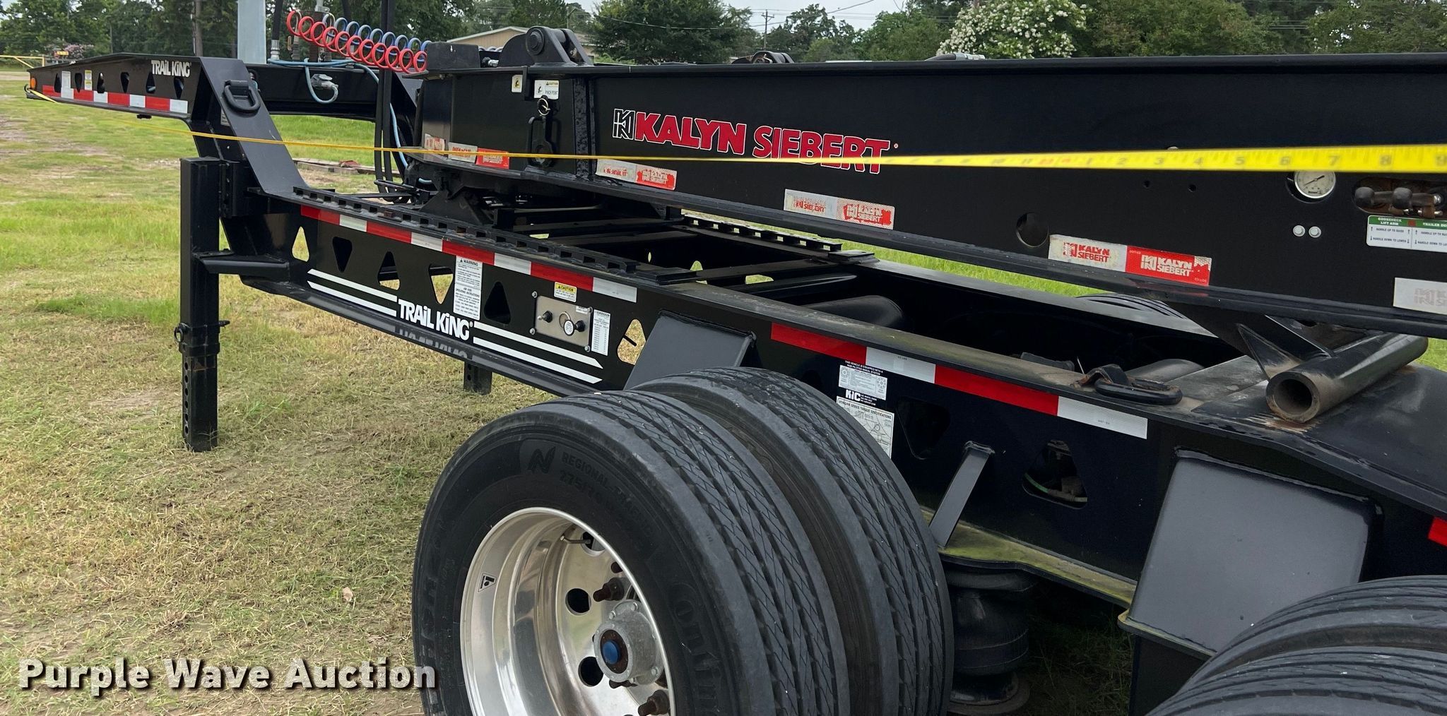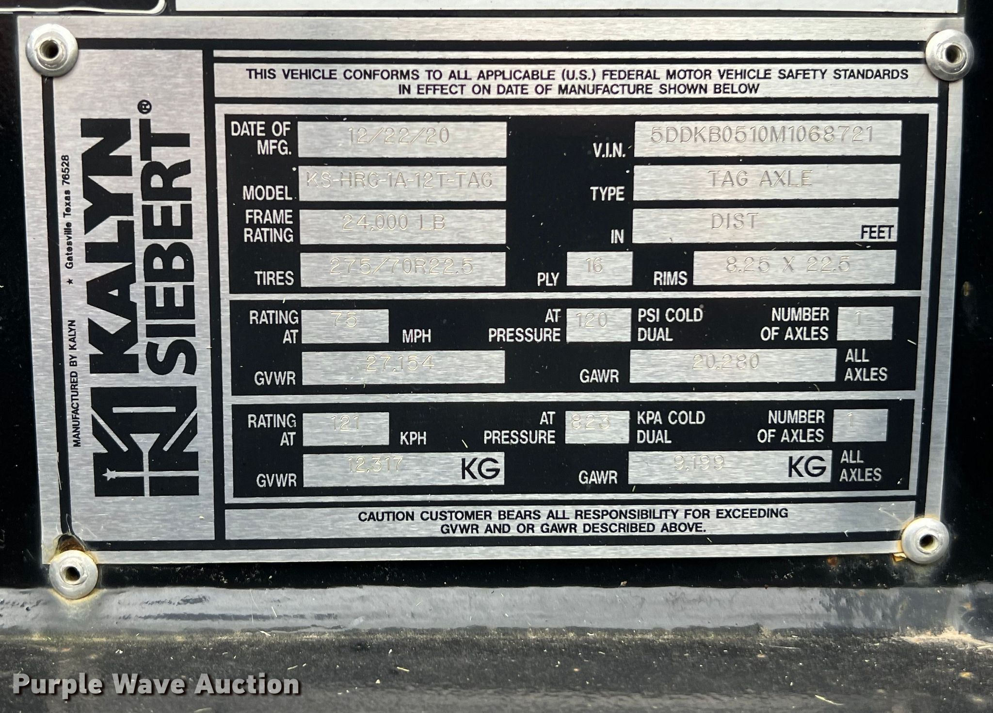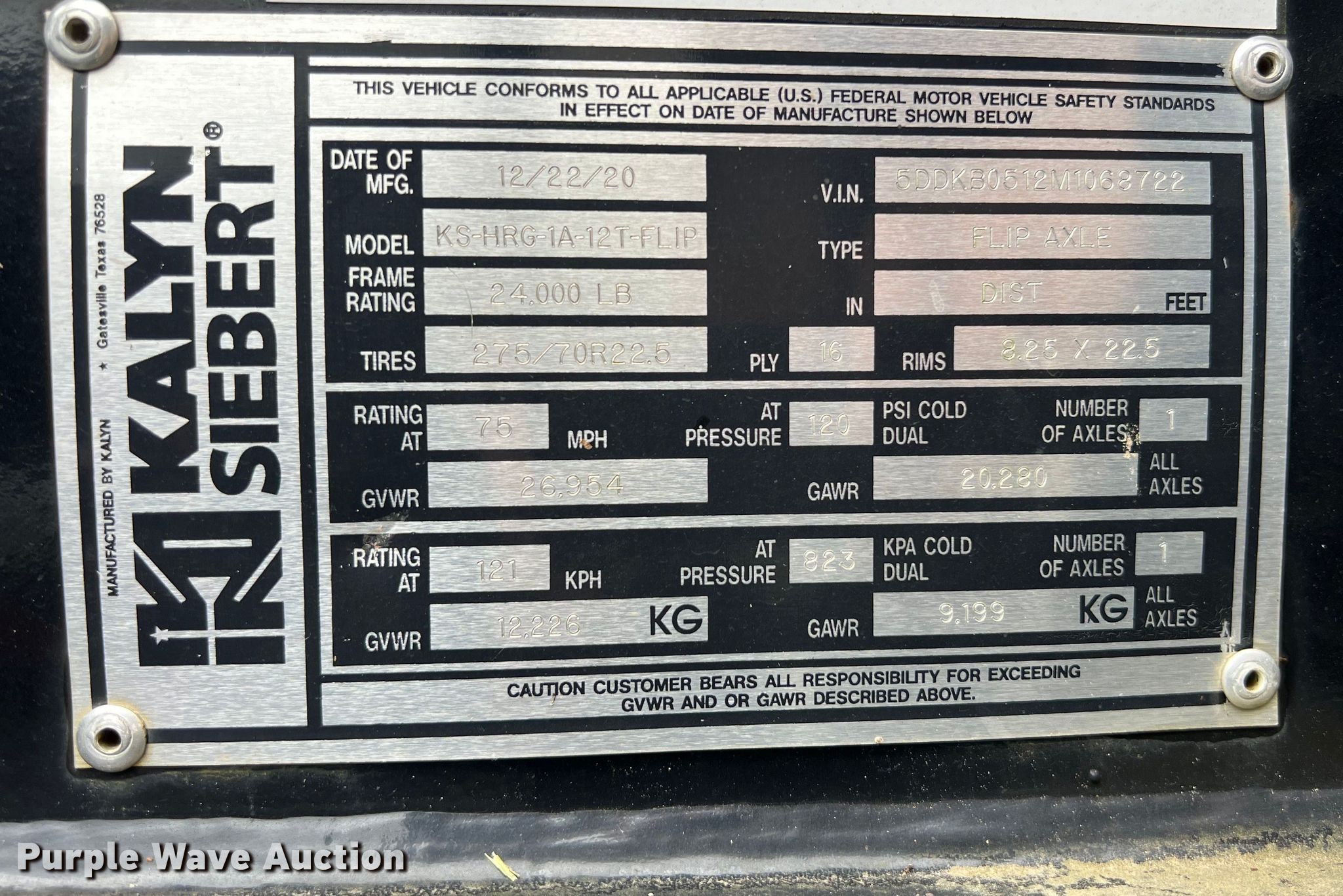2021 Kalyn Siebert KS-HRG-3A-60T-MOD-9W lowboy equipment trailer. VIN: 5DDKE2637M1068718. Dimensions Overall: 55' L x 9' W, Deck: 25' L x 9' W, Rear deck length: 12'. Features Deck type: Wood, Outriggers: Swing-out Board size: 12", Neck type: Detachable. Chassis Suspension: Air, Brakes: Air, Axles: Triple, GVWR: 145,812 lbs, GAWR: 20,280 lbs. Tires Aluminum wheels, Size: 275/70R22.5. 2018 Trail King TK80J jeep/dolly VIN: 1TKR02528JM057479. Dimensions Overall: 25' L x 8' 6" W. Chassis Landing gear: Dual, Suspension: Air, Brakes: Air, Axles: Tandem, GVWR: 87,080 lbs, GAWR: 24,751 lbs. Tires Aluminum wheels, Size: 275/70R22.5. 2021 Kalyn Siebert KS-HRG-1A-12T-TAG detachable tag axle VIN: 5DDKB0510M1068721. Dimensions Overall: 4' 6" L x 9' W. Chassis Suspension: Air, Brakes: Air, GVWR: 27,154 lbs, GAWR: 20,280 lbs. Tires Aluminum wheels, Size: 275/70R22.5. 2021 Kalyn Siebert KS-HRG-1A-12T-FLIP flip axle VIN: 5DDKB0512M1068722. Dimensions Overall: 4' 7" L x 9' W. Chassis Suspension: Air, Brakes: Air, GVWR: 26,954 lbs, GAWR: 20,280 lbs. Tires Aluminum wheels, Size: 275/70R22.5. Trailer - Texas title. Jeep/dolly - Transfer of ownership will be a bill of sale. Tag axle - Transfer of ownership will be a bill of sale. Flip axle - Transfer of ownership will be a bill of sale.. Title has a lien that will be released following the close of the auction. Title distribution may be delayed up to 30 days from verification of funds. Magnum Sitework and Excavation, LLC. Montgomery, TX 77316