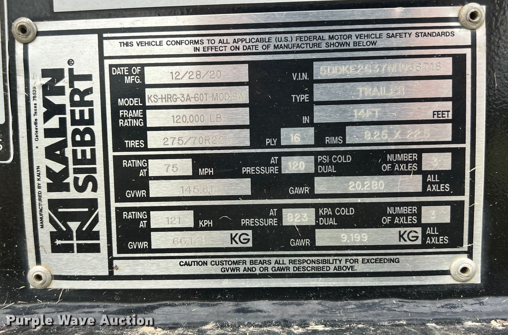 Purple Wave is selling a used Equip. Trailer in Texas. This item is a 2021 Kalyn Siebert KS-HRG-3A-60T-MOD-9W lowboy equipment trailer with the following: VIN: 5DDKE2637M1068718