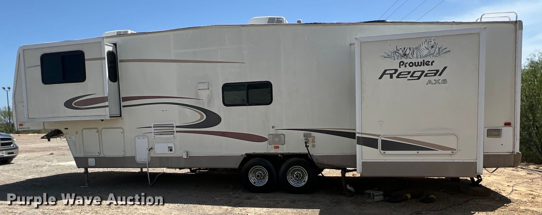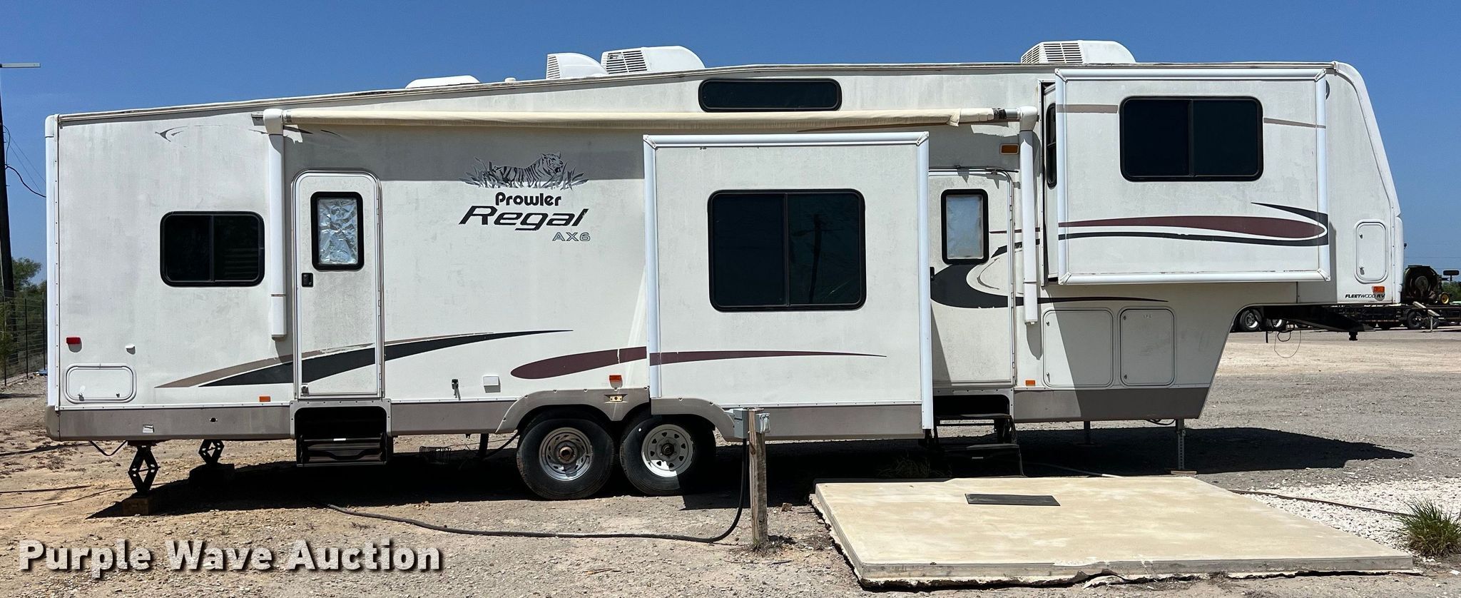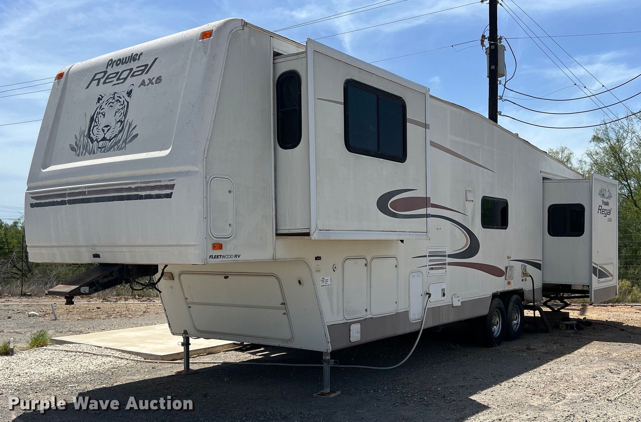 2004 Fleetwood Prowler Regal AX6 camper. Camper length: 36' 6", VIN: 1EC5F362244002887. Chassis Axles: Tandem, Suspension: Spring, Brakes: Electric, GVWR: 13,500 lbs, GAWR: 6,000 lbs. Interior Kitchen: Sink, Refrigerator, Freezer, Microwave, Oven, Stove: Propane, Living room: Couch, Bathroom, Beds: 1, TVs: 1, Sound system, Heater, AC units: 2. Features Slide outs: 4, Awnings: 1 Awning type: Electric. Tires Size: 235/85R16. Notes Loose contents not included. Texas title. Title has a lien that will be released following the close of the auction. Title distribution may be delayed up to 30 days from verification of funds. Big River Contractors. Cotulla, TX 78014