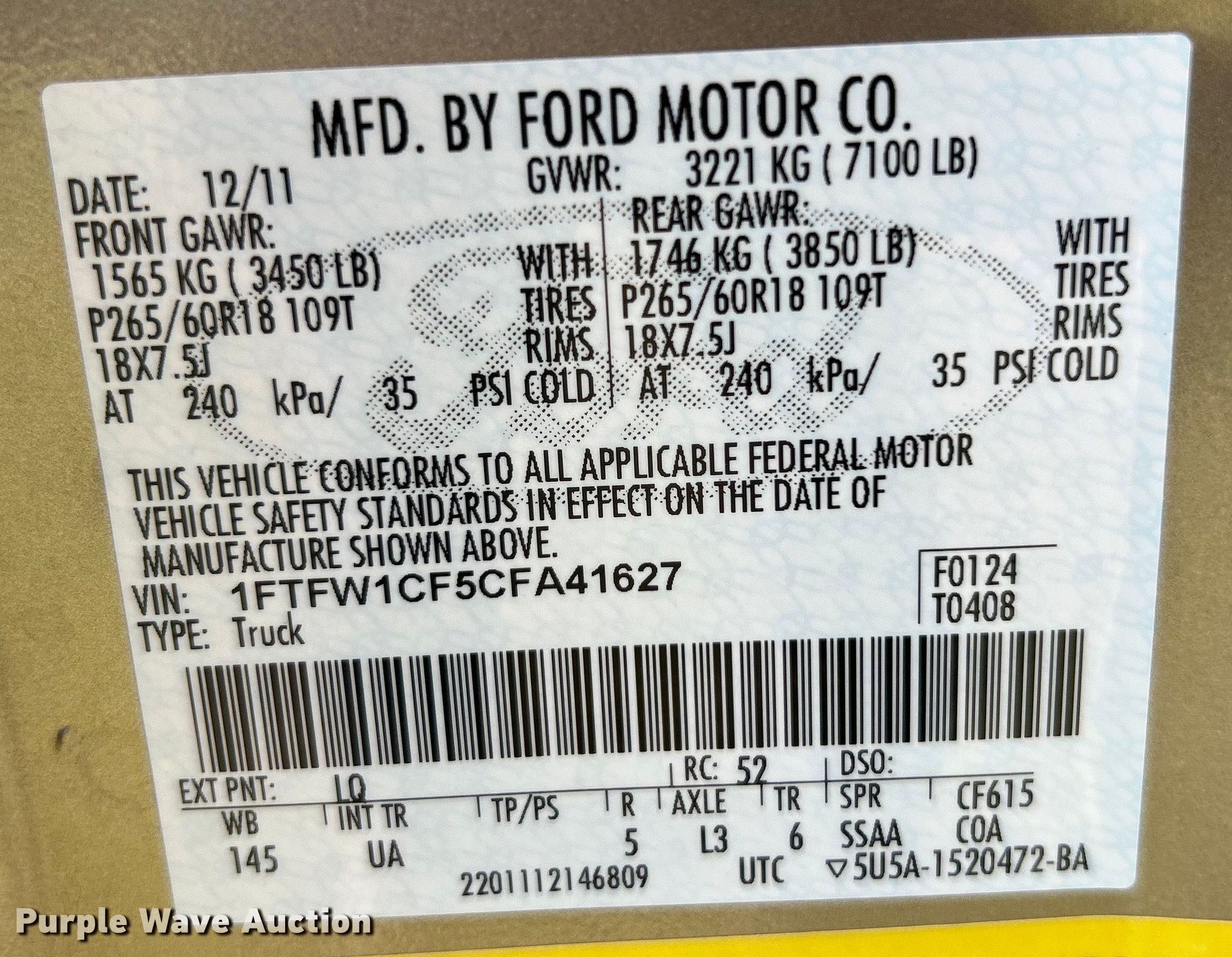 Purple Wave is selling a used 1/2 Ton Pickup or Van in Oklahoma. This item is a 2012 Ford F150 Oklahoma Edition XLT SuperCrew pickup truck with the following: Miles: 109,421 on odometer, Miles or hours may vary, unit still in use, VIN: 1FTFW1CF5CFA41627