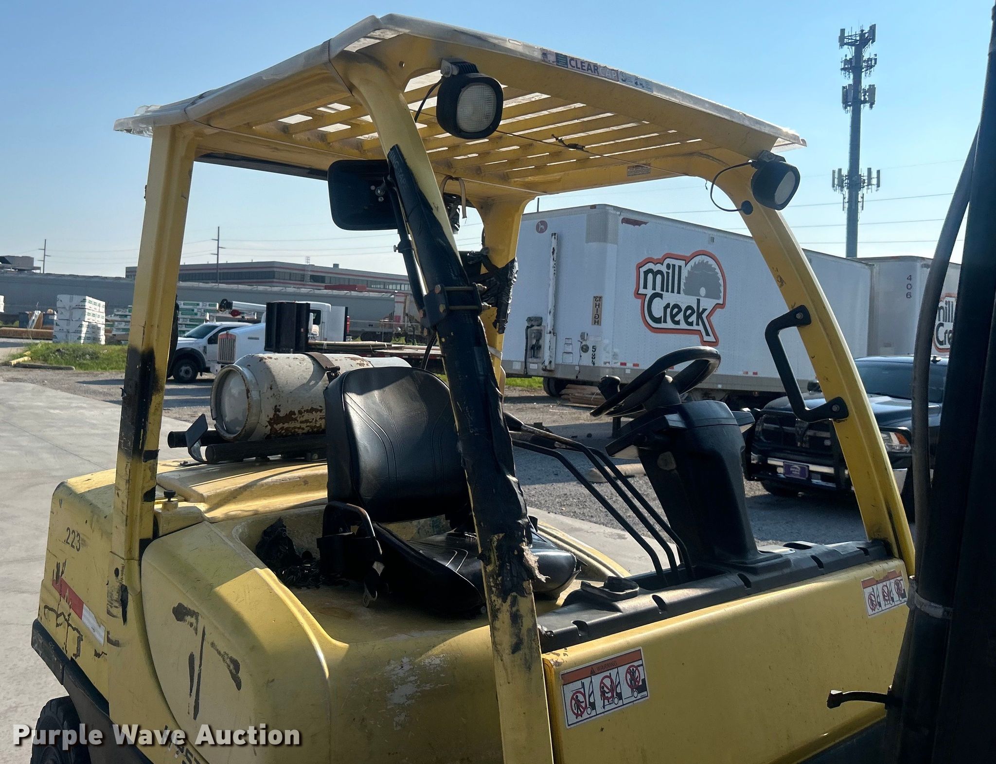 Hyster 80 forklift. Hours: 14,518 on meter. Engine Cylinders: 6, Fuel type: LPG LP bottle: Not included. Transmission Powershift. Features Maximum lift capacity: 8,000 lbs, Maximum lift height: 167", Mast stages: 2, Side shift, Mast tilt, Fork length: 46". Tires Front: 7.00-15, Rear: 7.00-12, Solid. Mill Creek lumber & Supply. Broken Arrow, OK 74012