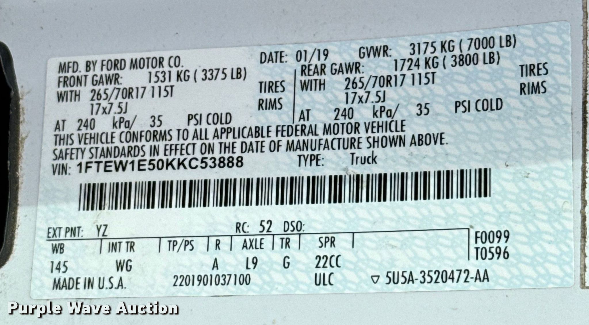Purple Wave is selling a used 1/2 Ton Pickup or Van in Colorado. This item is a 2019 Ford F150 XL SuperCrew pickup truck with the following: Miles: 154,728 on odometer, VIN: 1FTEW1E50KKC53888, Unit #: 02.734