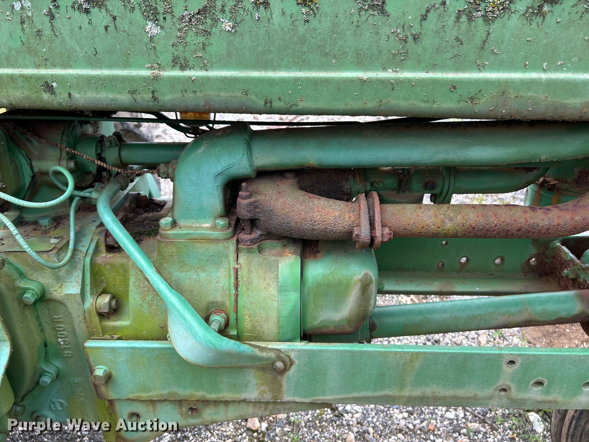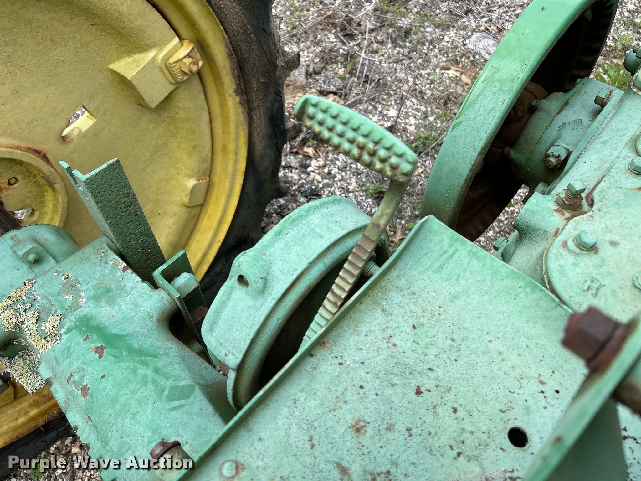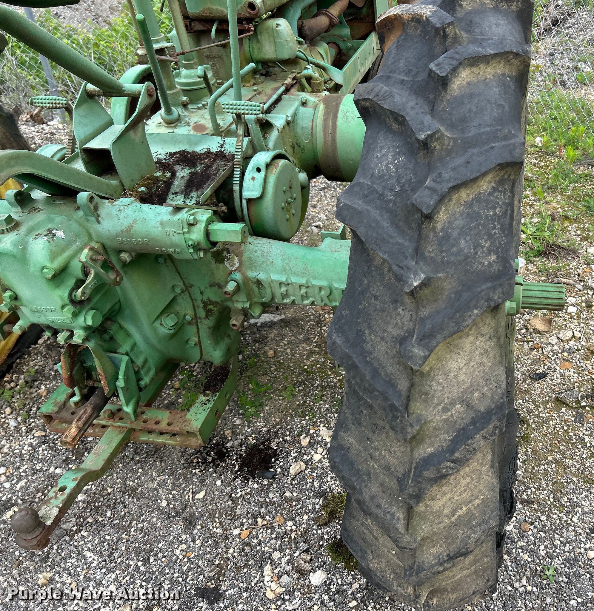 1939 John Deere B tractor. Serial: B70877. Engine Cylinders: 2, Fuel type: Gas. Transmission Manual. Features PTO: 540, Two bottom plow, Field cultivator. Tires Front: 5.00-15 SL, Rear: 9.5-36. Notes Non-operational plow, Non-operational cultivator, Non-operational unit. House Springs, MO 63051