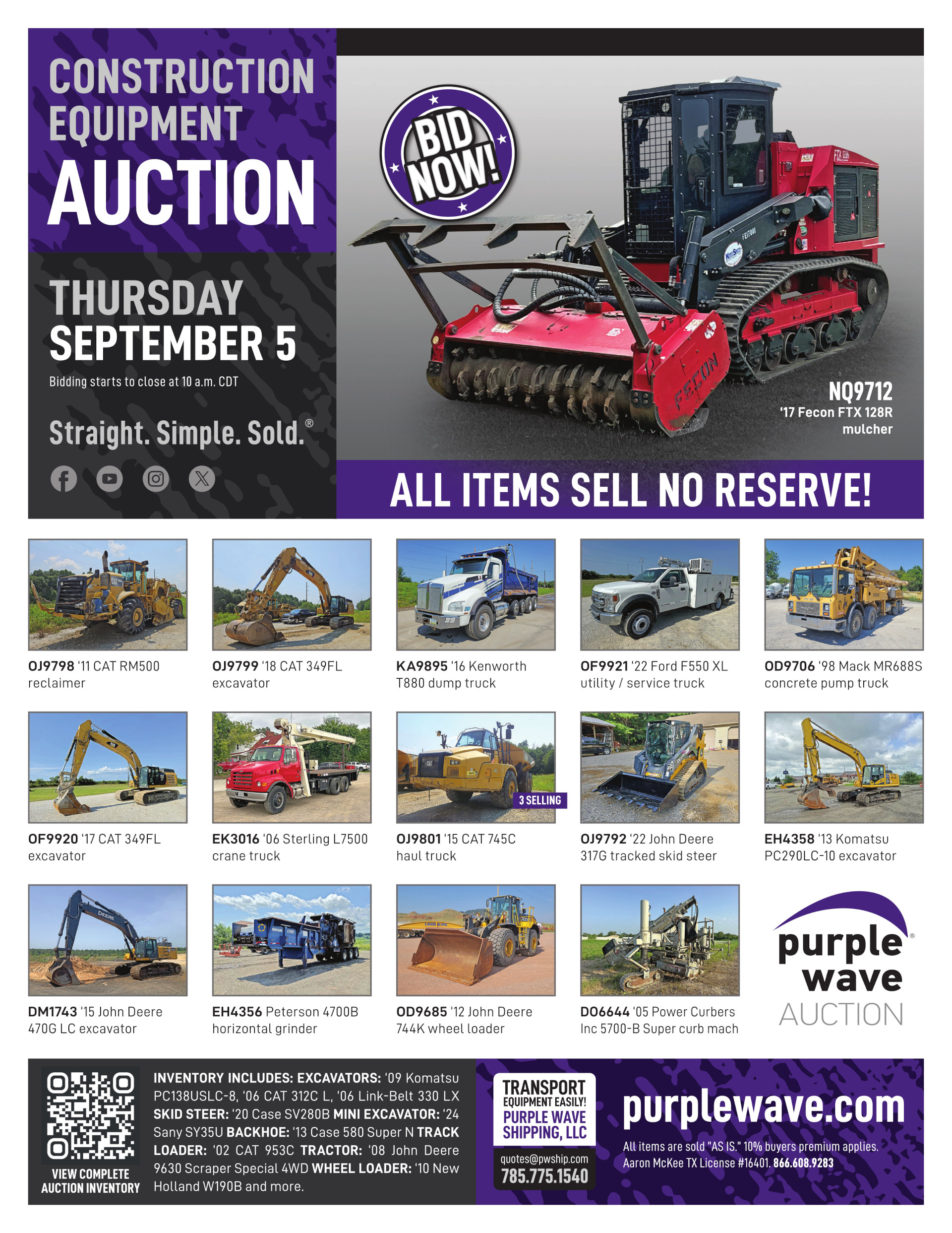 Purple Wave Shipping, LLC provides shipping and transportation services to winning bidders on ag, construction and fleet type assets. Purple Wave Shipping, LLC does not provide shipping on items weighing less than 1,000 pounds.