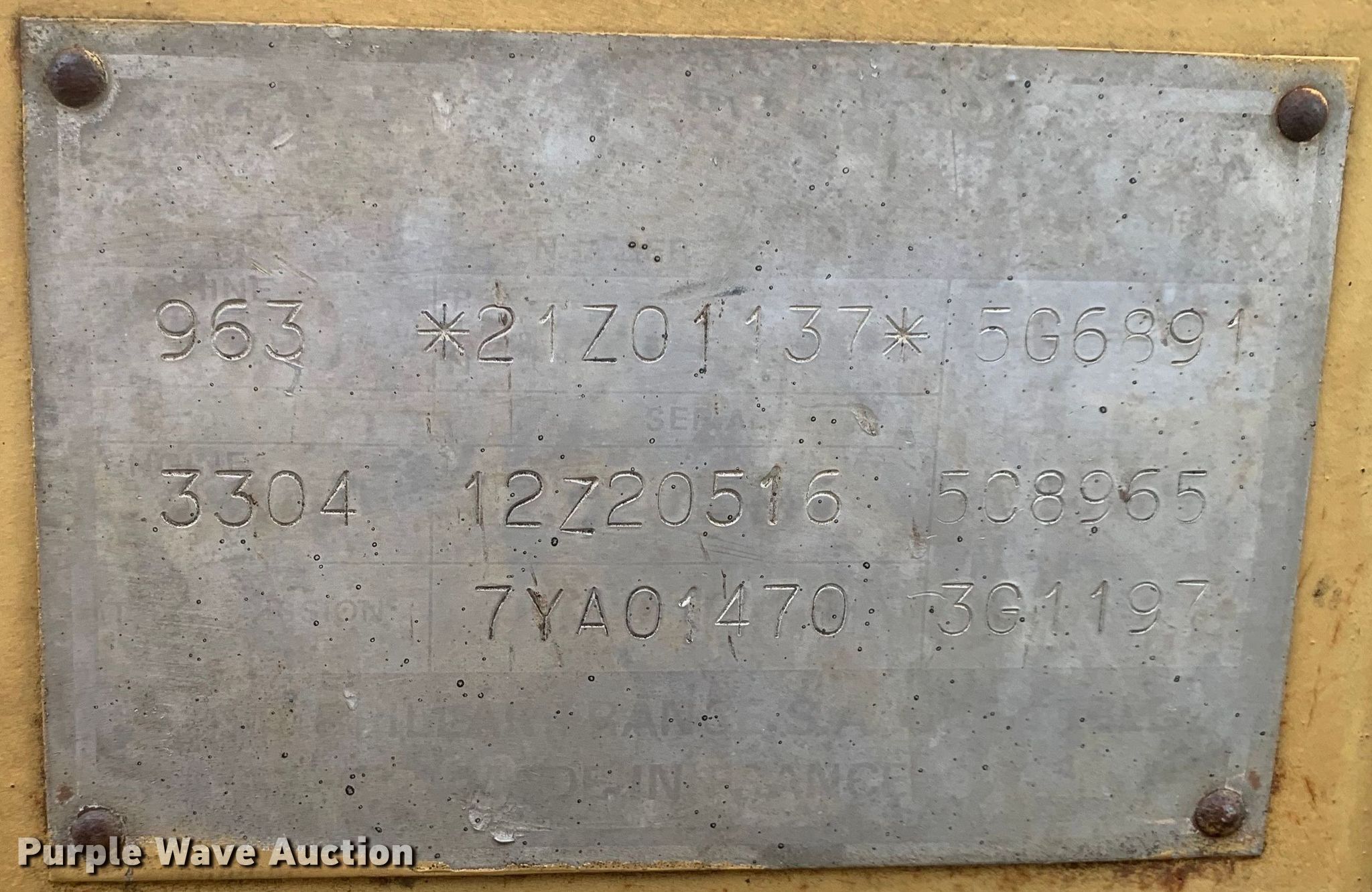 1987 Caterpillar 963 loader. Hours: 1,368 on meter Actual hours unknown, Serial: 21Z01137. Engine Caterpillar 3304, Serial: 12Z205516, Displacement: 7.0L, Cylinders: 4, Fuel type: Diesel, HP: 95, kW: 75. Transmission Hydrostatic. Operators station Canopy, Bucket controls: Two-lever. Features Bucket Width: 100", Cutting edge: Bolt-on, Teeth: 8, Rear ripper Serial: 36Y00286, Pockets: 3, Shanks: 3. Tracks Width: 21.5", Grouser pads: Double. Notes Hydraulic leak. G8 Builders, Inc. Farmersville, TX 75442
