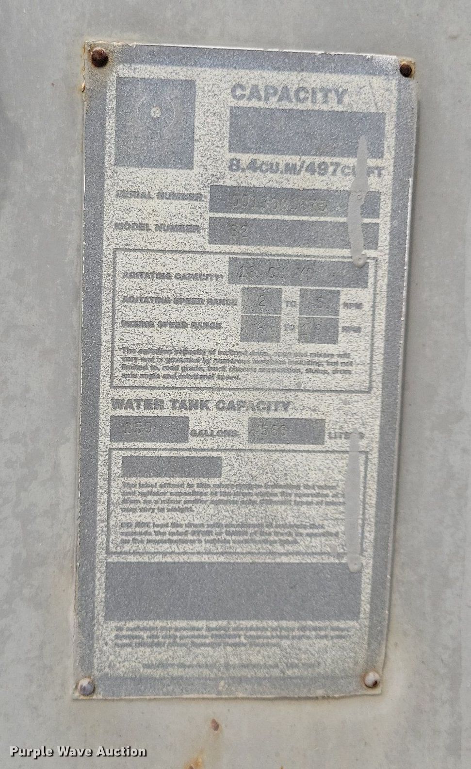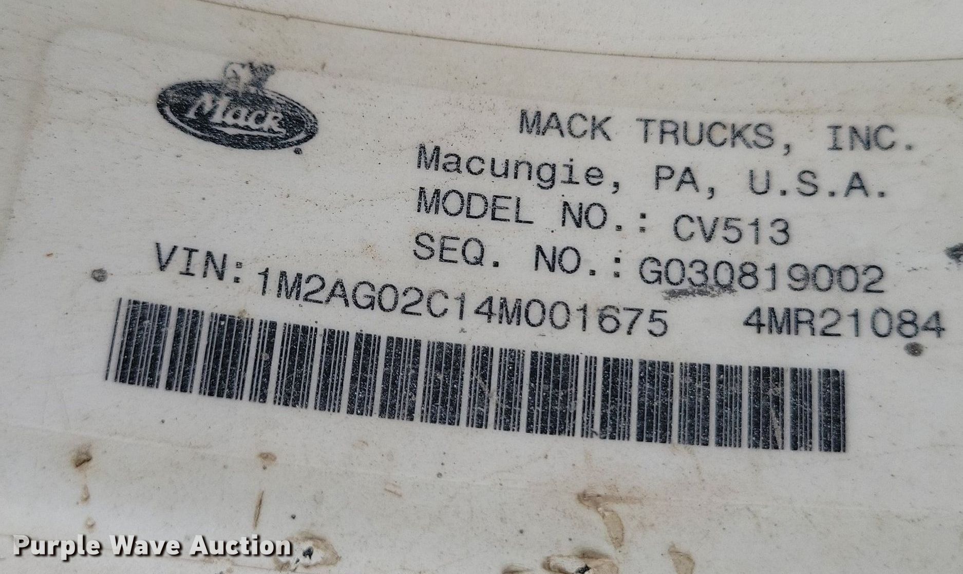 2004 Mack CV513 ready mix truck. Miles: 164,838 on odometer, Hours: 15,142 on meter, VIN: 1M2AG02C14M001675. Engine Mack, Displacement: 12.0L, Cylinders: 6, Fuel type: Diesel. Transmission Mack Maxitorque ES, Manual, Speed: 10. Chassis Axles: 4, Pusher axle Steerable, Tag axle Steerable, Brakes: Air, PTO, GVWR: 82,220 lbs FAWR: 20,000 lbs, IAWR: 19,000 lbs, RAWR: 19,000 lbs, Lift axle GAWR: 11,020 lbs. Interior AC, Heat, Heated mirrors, Cruise control. Features Mixer McNeilus B2, Serial: 0013001675, Capacity: 13 cu.yd., Discharge: Rear, In-cab controls, Rear drum controls, Water tank capacity: 150 gallons, Chute Extensions: 3, Chute type: Steel.. Tires Front: 425/65R22.5, Rear: 11R22.5, Lift axle: 255/70R22.5. Iowa title. Title distribution may be delayed up to 14 days from verification of funds. Croell Redi-Mix. New Hampton, IA 50659