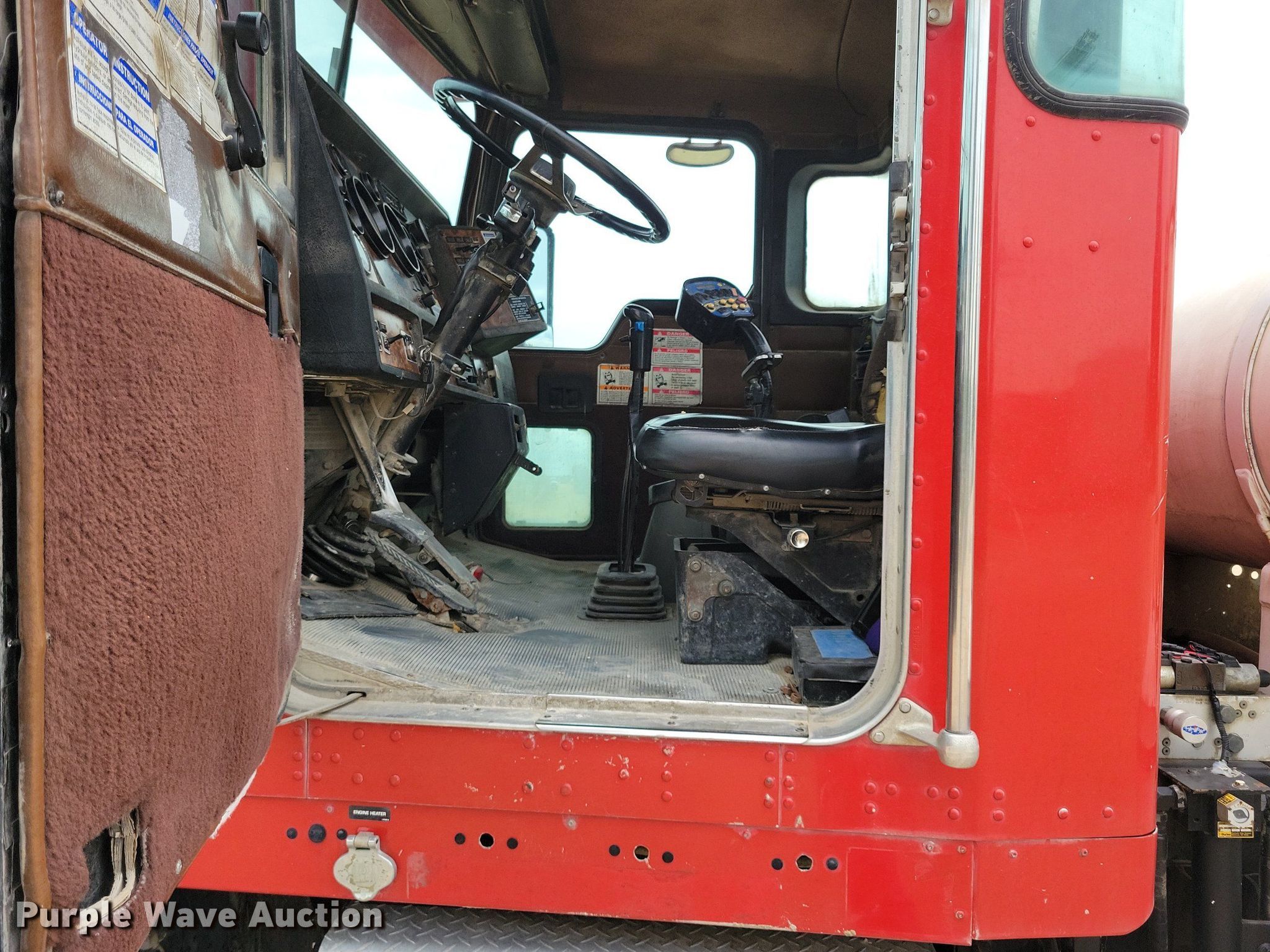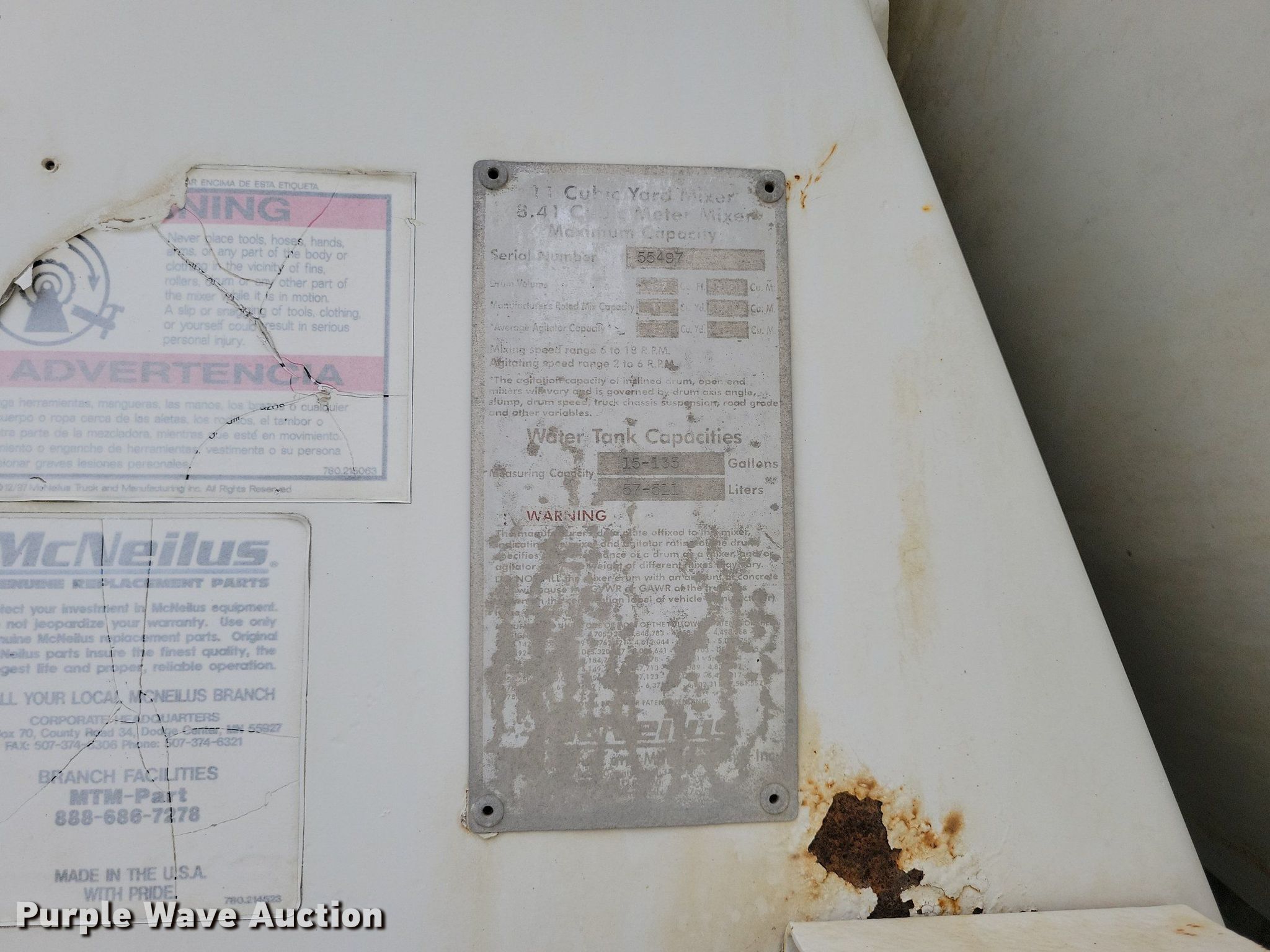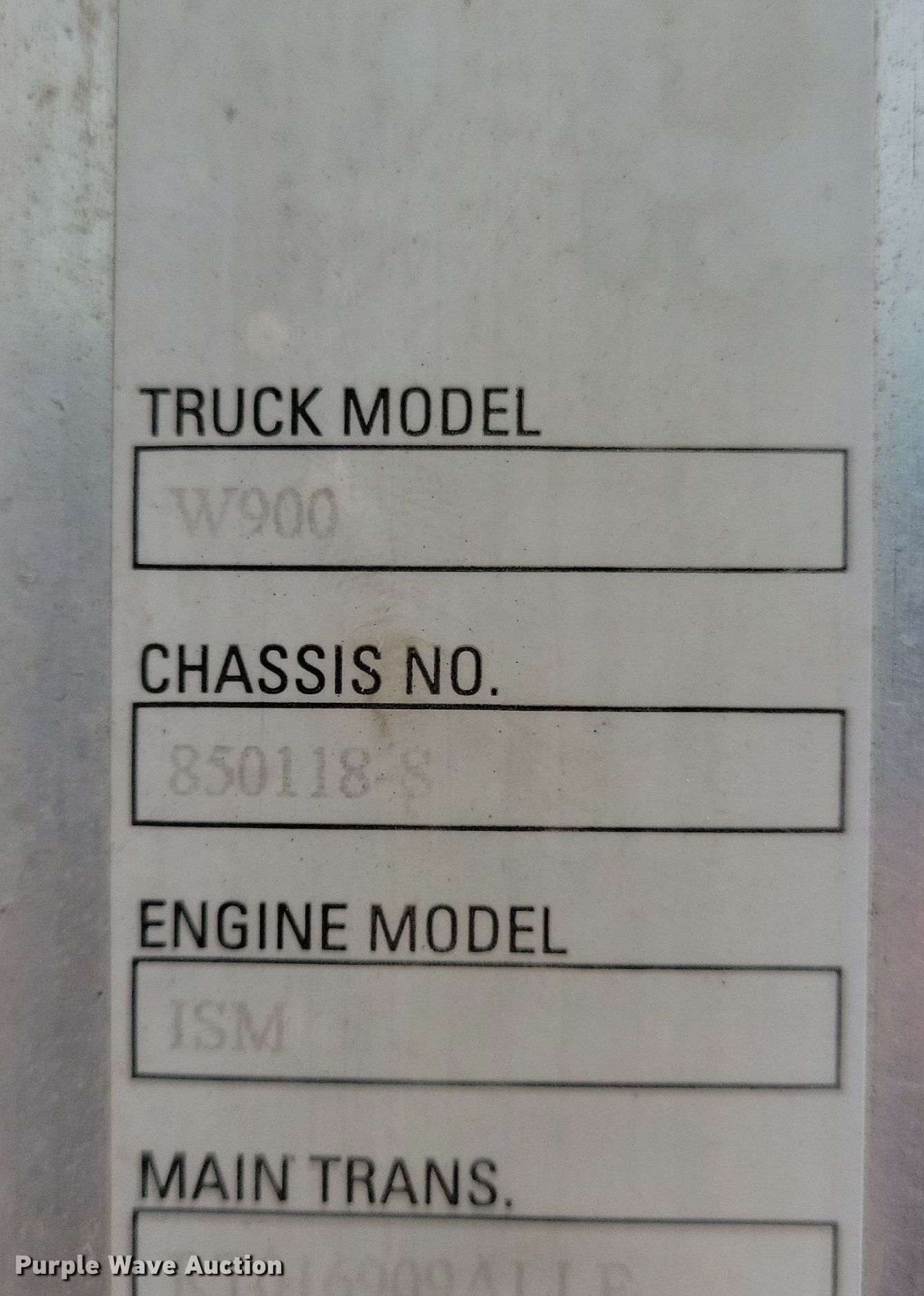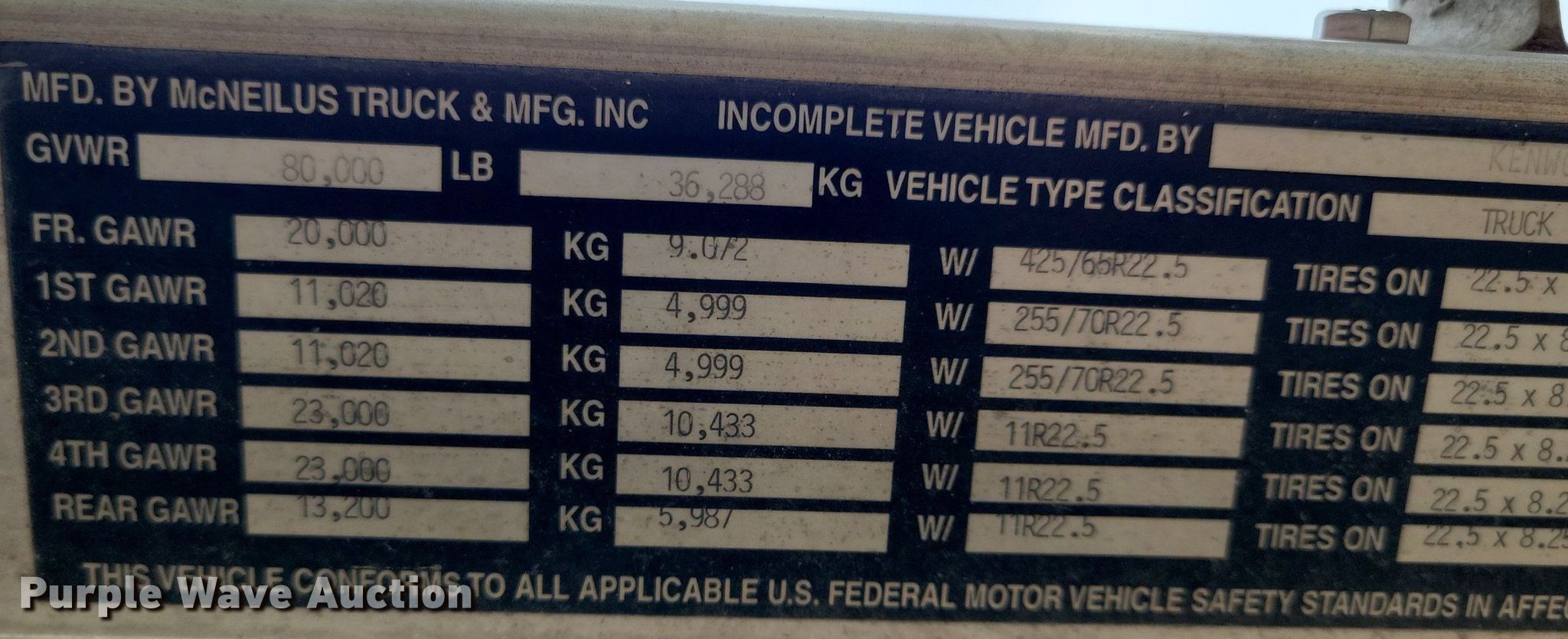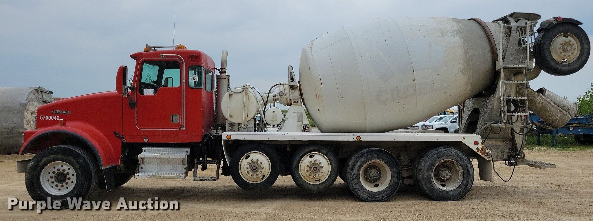 1999 Kenworth W900 ready mix truck. Miles: 275,797 on odometer, Hours: 8,337 on meter, VIN: 1NKWL00X3XS850118. Engine Cummins ISM, Serial: 34985966, Displacement: 10.8L, Cylinders: 6, Fuel type: Diesel. Transmission Eaton Fuller 8LL, Manual, Speed: 10. Chassis Axles: 5, Gear ratio: 5.38, Pusher axle Steerable, Tag axle Steerable, Differential lock: Inter-axle, Suspension: Spring over walking beam, Brakes: Air, PTO, GVWR: 80,000 lbs FAWR: 20,000 lbs, IAWR: 23,000 lbs, RAWR: 23,000 lbs, Lift axle GAWR: 11,020 lbs. Interior AC, Heat, Heated mirrors, Cruise control. Features Mixer McNeilus, Serial: 55497, Capacity: 11 cu.yd., Discharge: Rear, In-cab controls, Rear drum controls, Water tank capacity: 135 gallons, Chute Extensions: 3, Chute type: Steel.. Tires Front: 425/65R22.5, Rear: 11R22.5, Lift axle: 255/70R22.5. Iowa title. Title distribution may be delayed up to 14 days from verification of funds. Croell Redi-Mix. New Hampton, IA 50659
