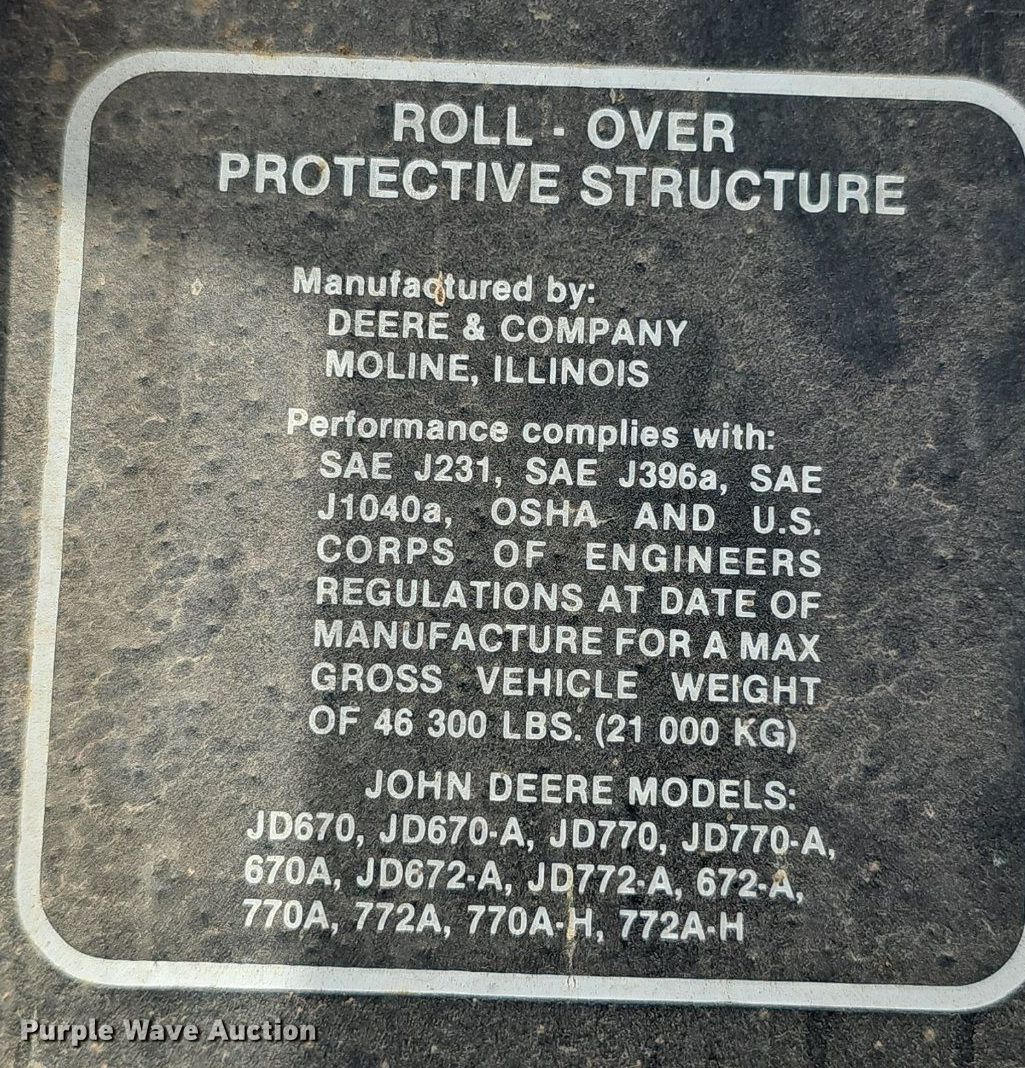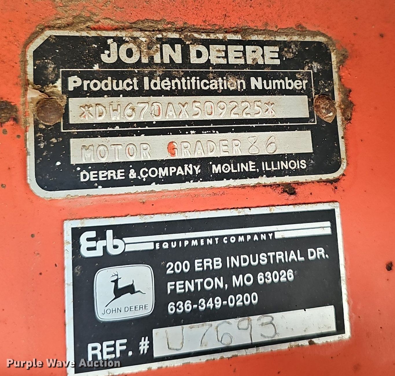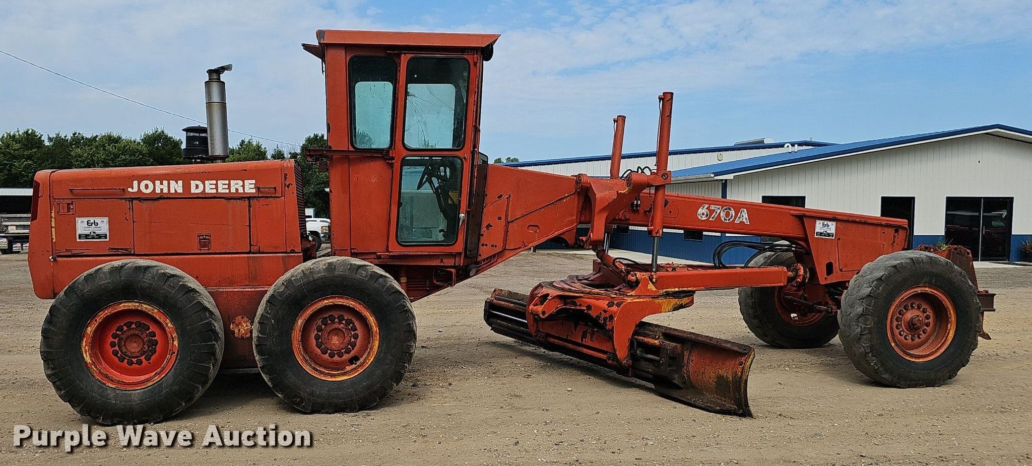 Purple Wave is selling a used Motor Grader in Kansas. This item is a 1985 John Deere 670A motor grader with the following: Hours: 806 on meter, Actual hours unknown, Serial: DW670AX509225