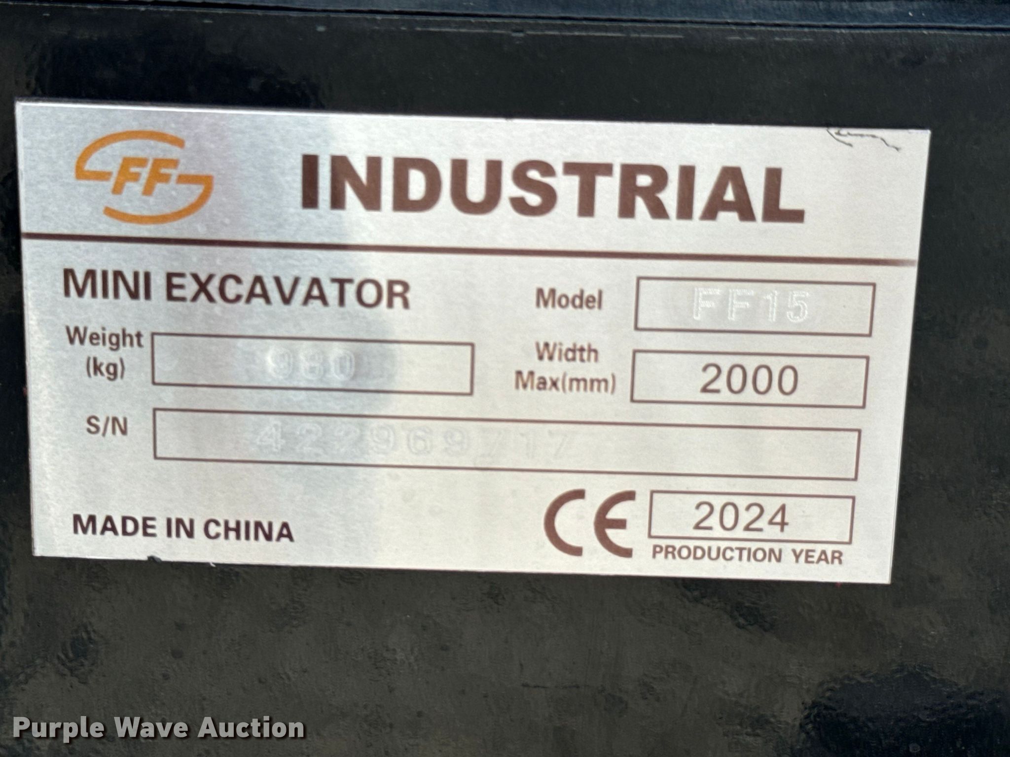 Purple Wave is selling a used Mini Excavator in Oklahoma. This item is a 2024 FF Industrial FF15 mini excavator with the following: Hours: 0 on meter, Serial: 422969717