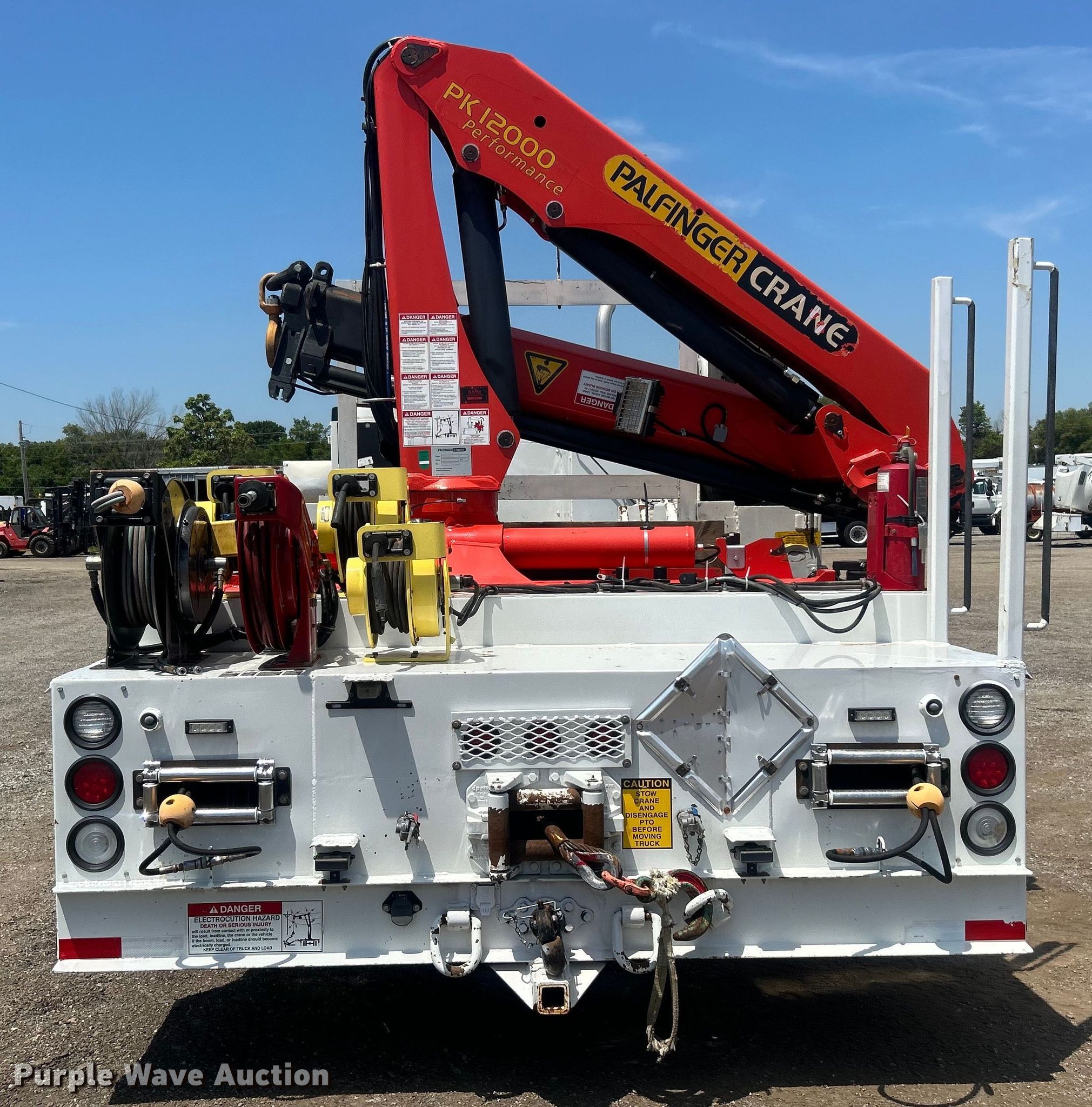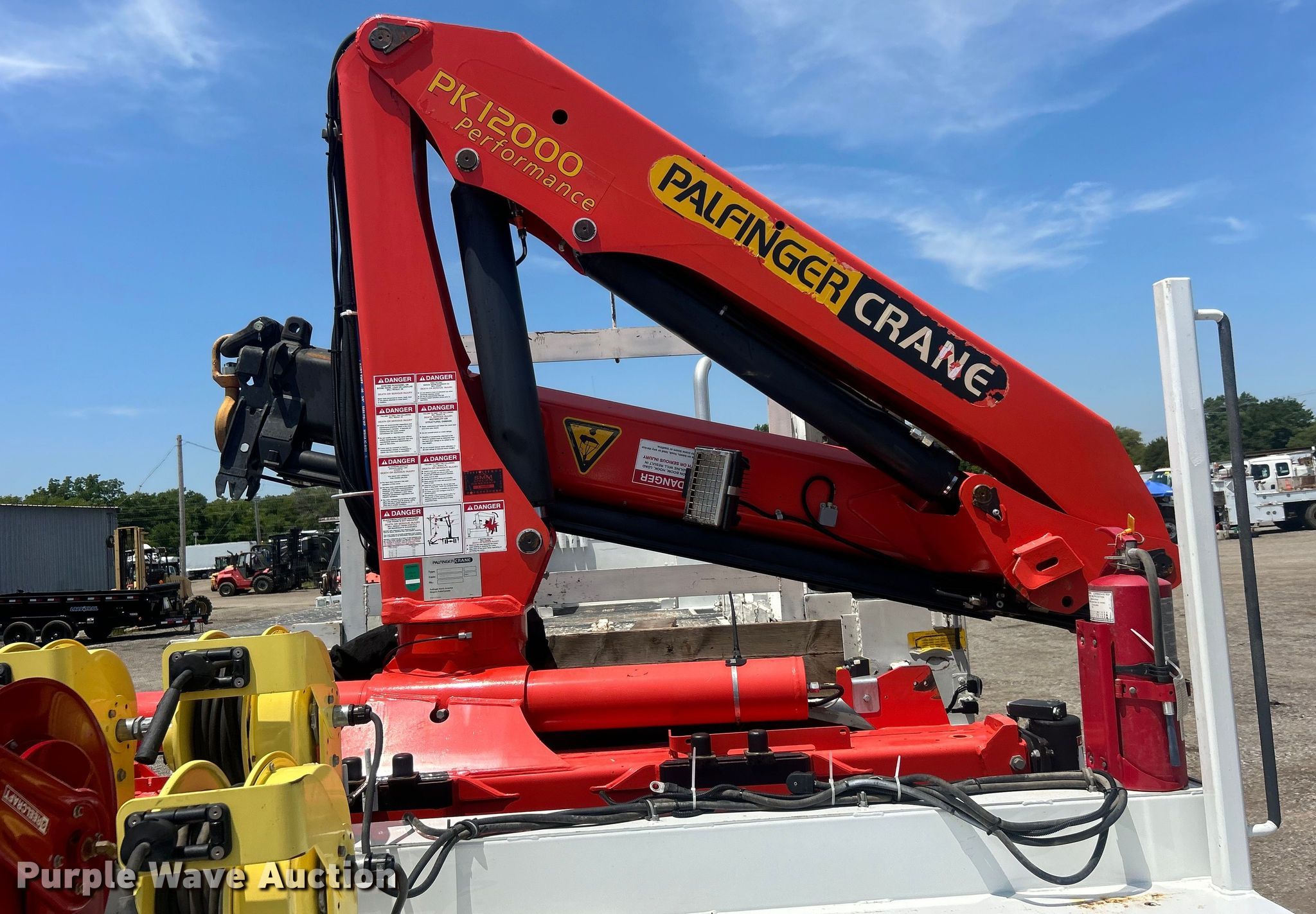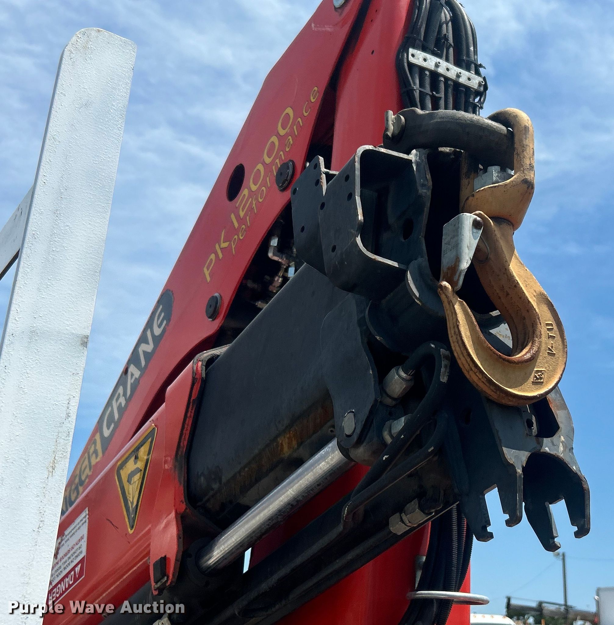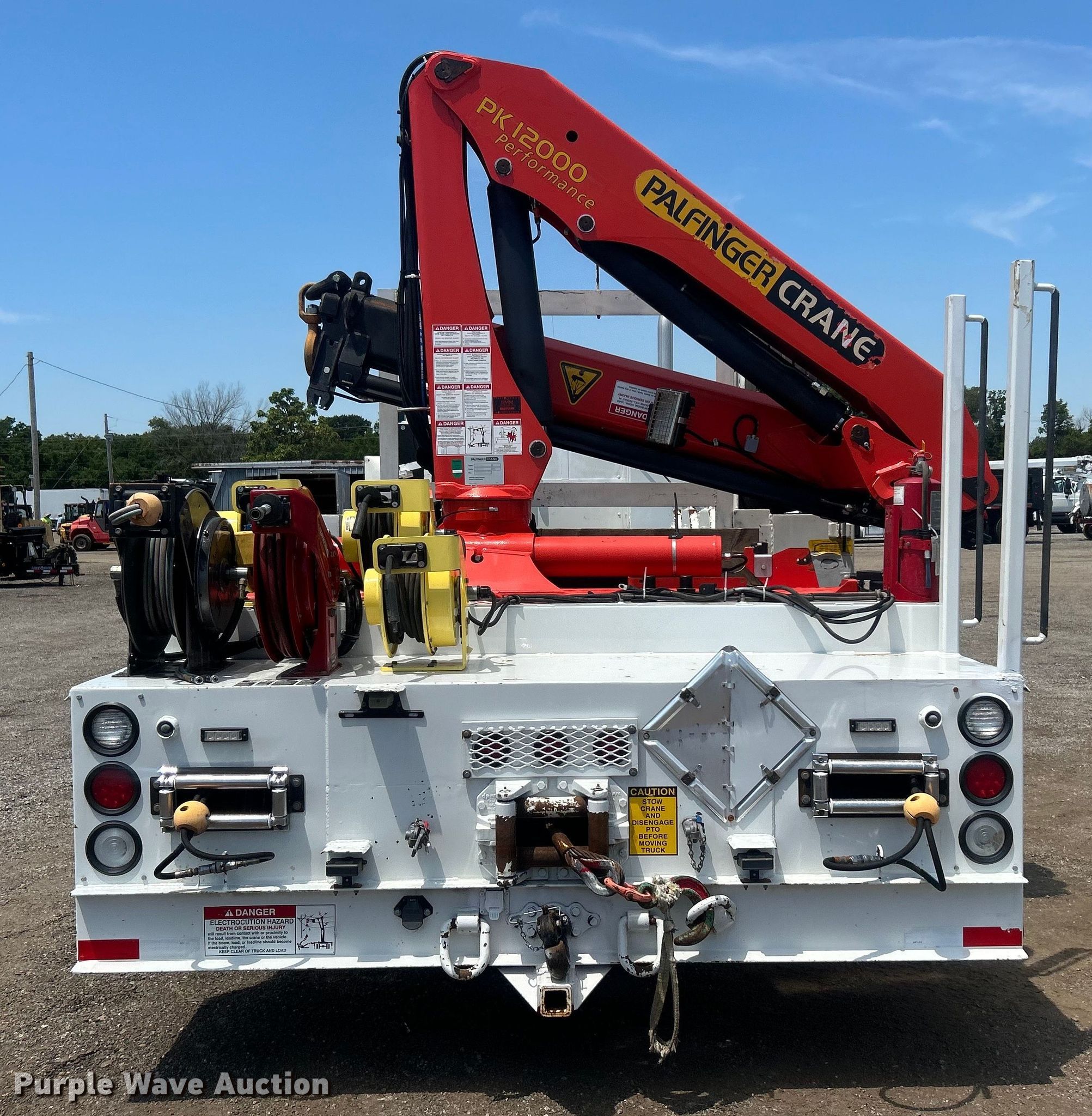 2010 Freightliner Business Class M2 utility / service truck. Miles: 53,982 on odometer, Hours: 5,439 on meter, VIN: 1FVHC7CV2ADAR3101. Engine Mercedes Benz OM460, Displacement: 12.8L, Cylinders: 6, Fuel type: Diesel, HP: 450, kW: 335. Transmission Automated manual. Chassis Axles: Tandem, Suspension: Air, Brakes: Air, PTO, GVWR: 56,000 lbs. Interior AC, Heat, Cruise control, Auxiliary controls, Brake controller. Features Bed 16' 10" L x 101" W, Crane Palfinger PK12000, Maximum boom length: 46' Maximum lift capacity: 14,970 lbs, Hi-rail system. Tires Front: 315/80R22.5, Rear: 11R22.5. Oklahoma title. 15107 North 137th East Avenue. Collinsville, OK 74021