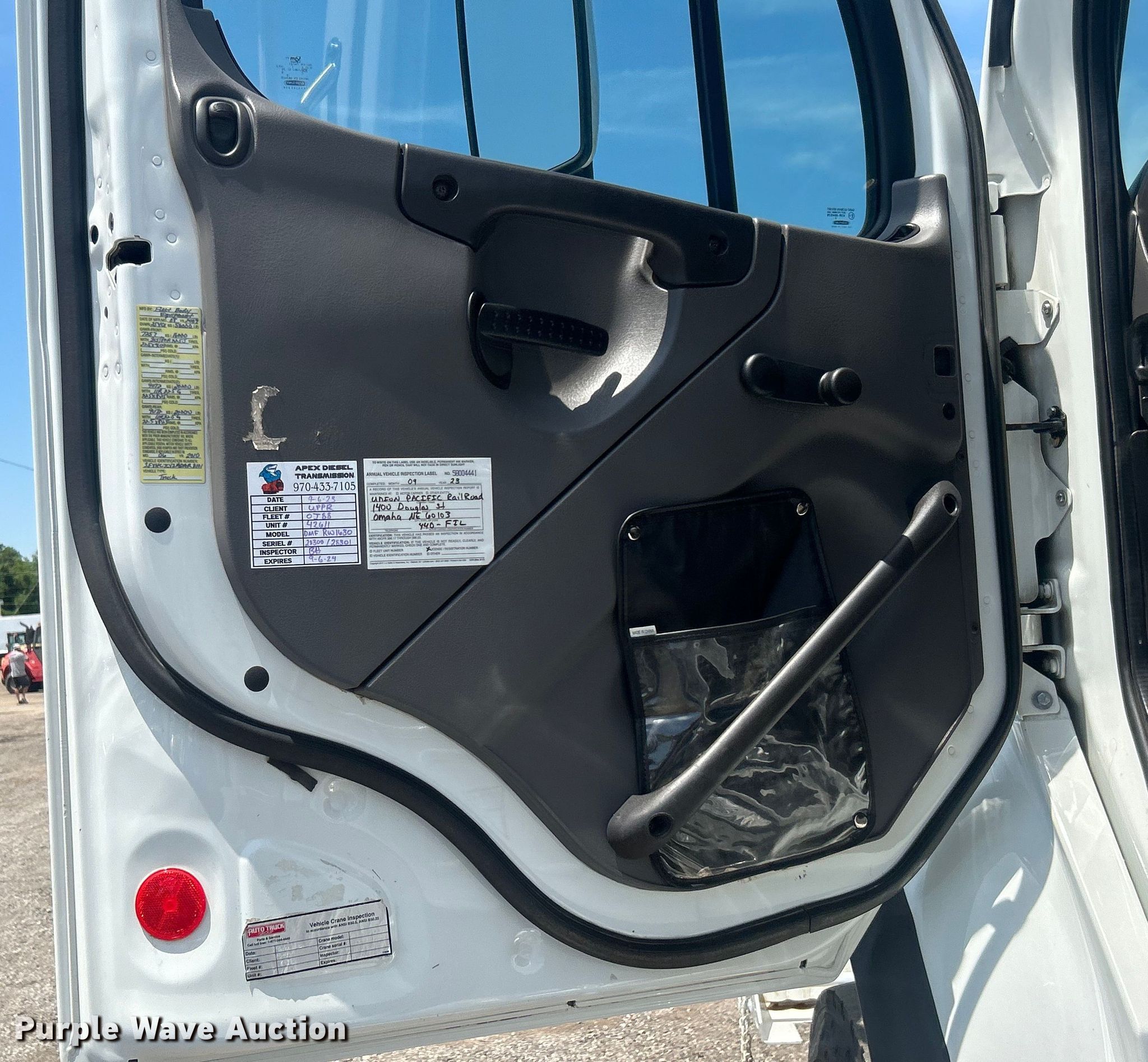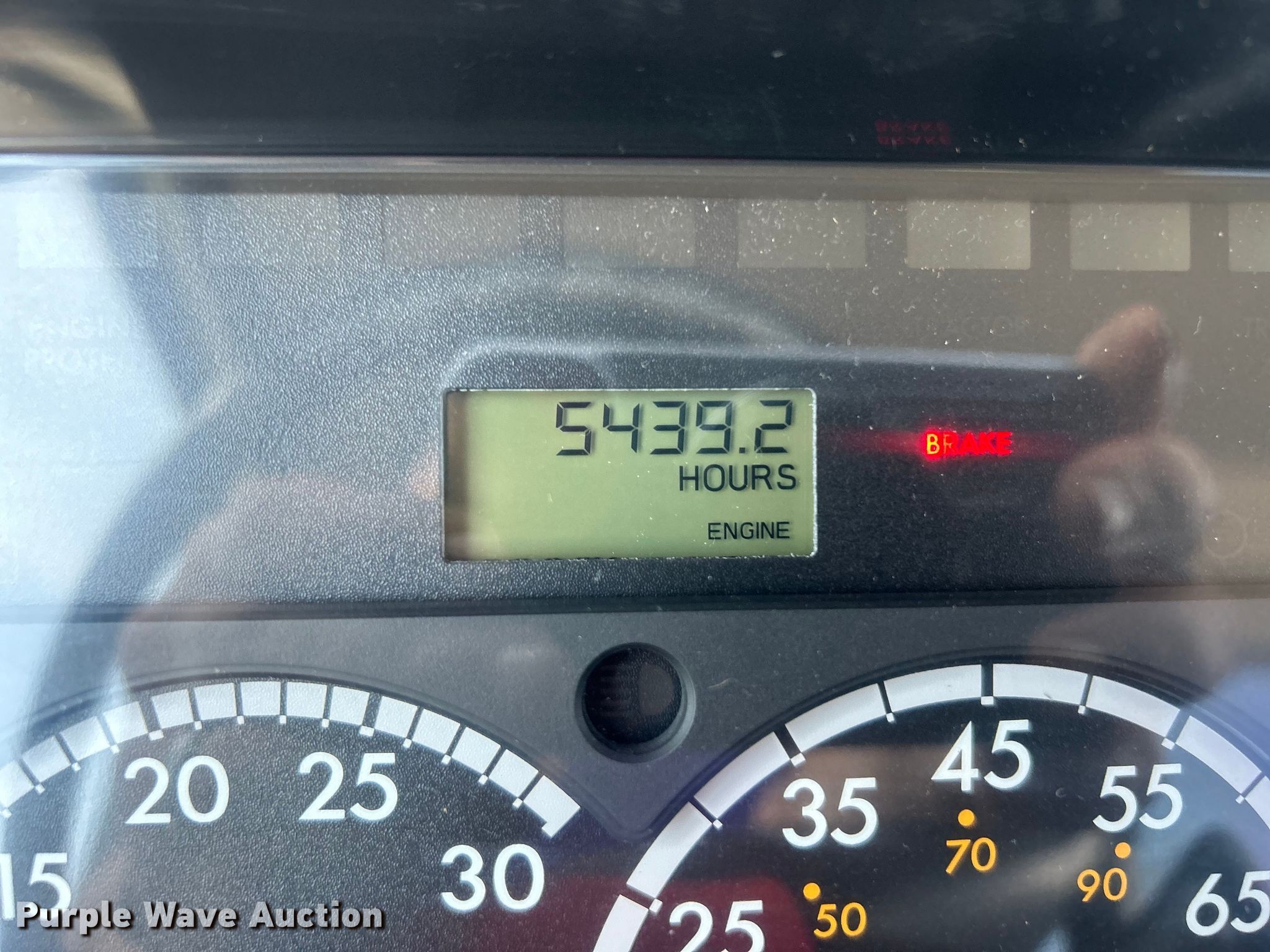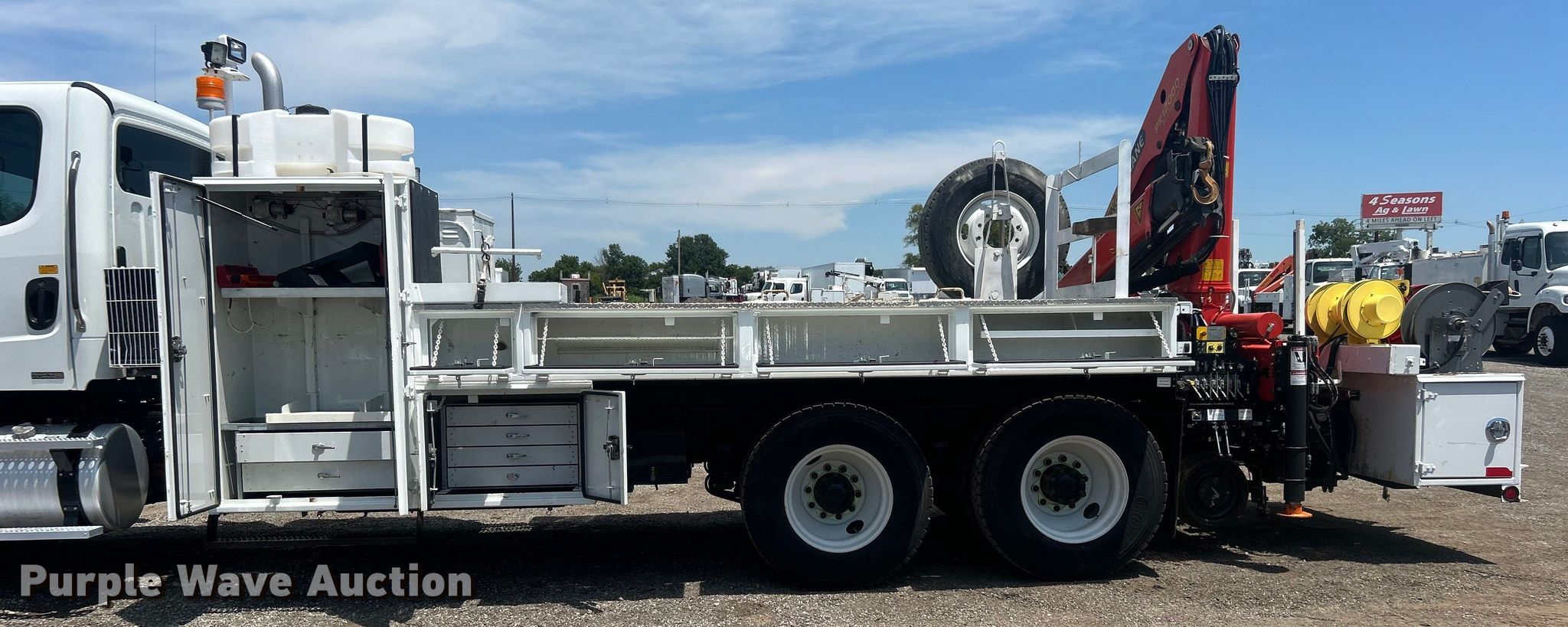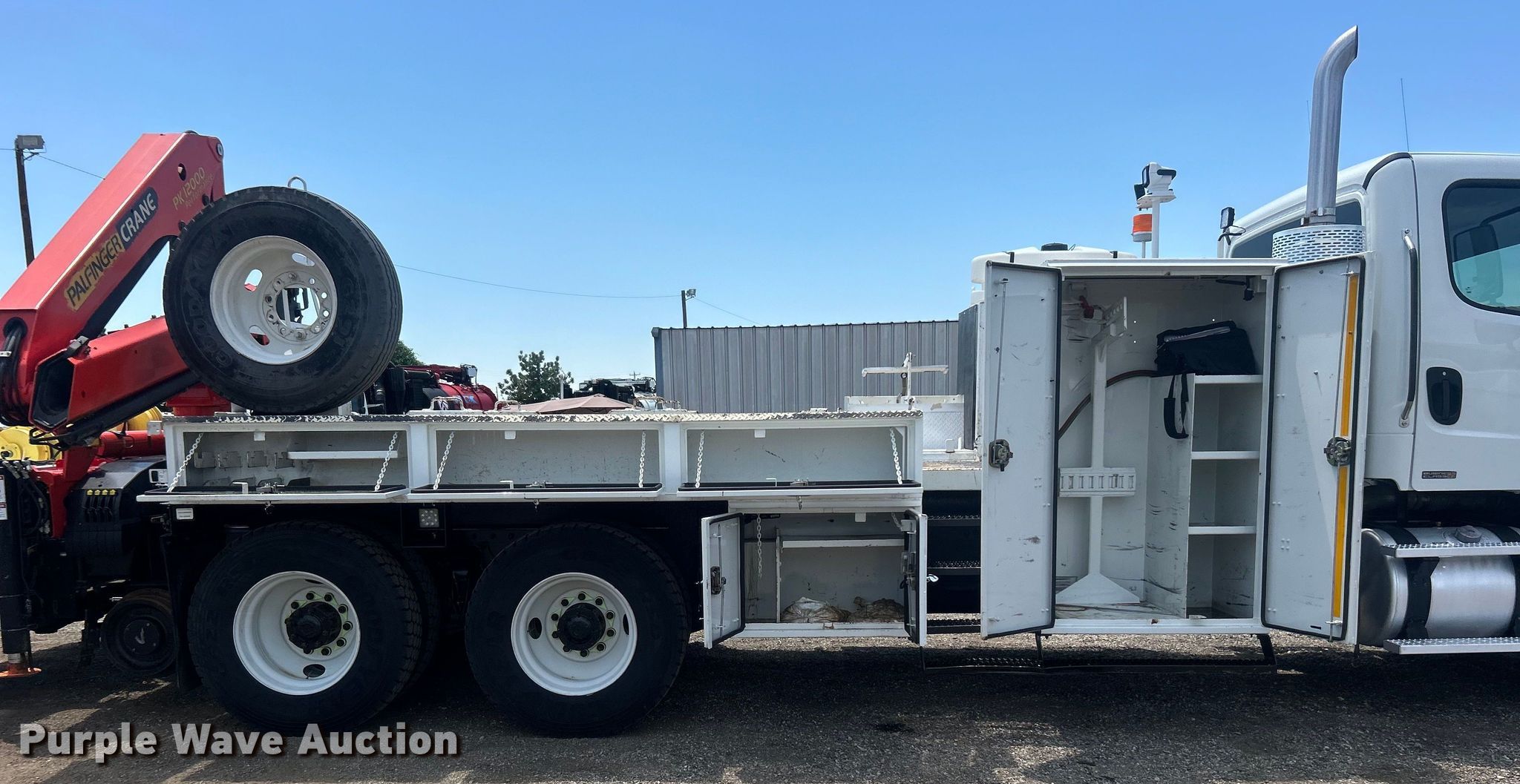 2010 Freightliner Business Class M2 utility / service truck. Miles: 53,982 on odometer, Hours: 5,439 on meter, VIN: 1FVHC7CV2ADAR3101. Engine Mercedes Benz OM460, Displacement: 12.8L, Cylinders: 6, Fuel type: Diesel, HP: 450, kW: 335. Transmission Automated manual. Chassis Axles: Tandem, Suspension: Air, Brakes: Air, PTO, GVWR: 56,000 lbs. Interior AC, Heat, Cruise control, Auxiliary controls, Brake controller. Features Bed 16' 10" L x 101" W, Crane Palfinger PK12000, Maximum boom length: 46' Maximum lift capacity: 14,970 lbs, Hi-rail system. Tires Front: 315/80R22.5, Rear: 11R22.5. Oklahoma title. 15107 North 137th East Avenue. Collinsville, OK 74021