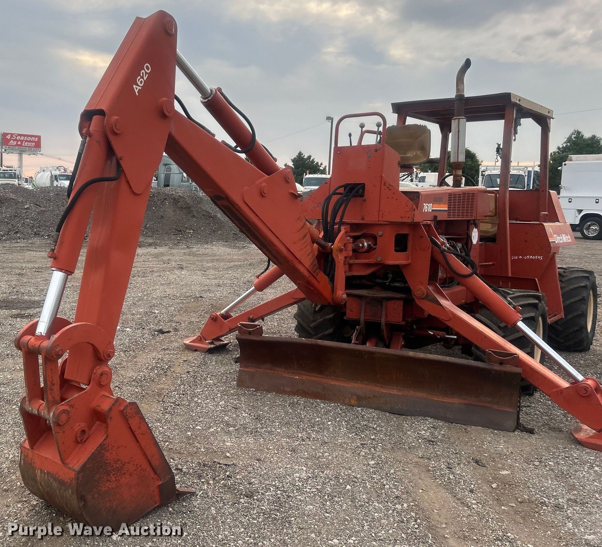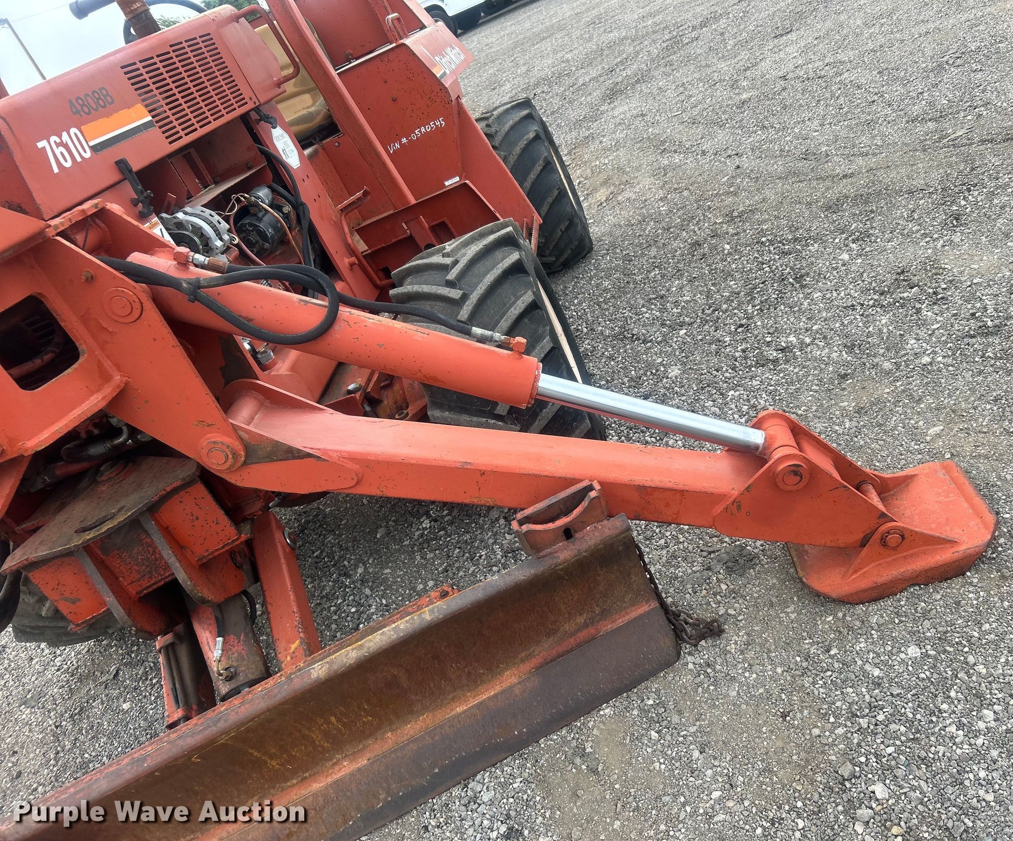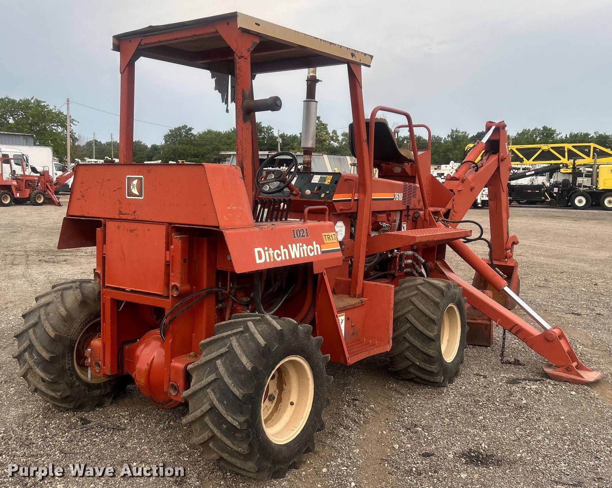 1998 Ditch Witch 7610 trencher. Hours: 2,216 on meter. Engine Deutz F4LN12, Serial: 8536269, Cylinders: 4, Fuel type: Diesel, kW: 64. Transmission Manual, 4F - 1R, Four wheel drive, Differential lock. Operators station Canopy. Features Backhoe Model: A620, Bucket width: 18", Backfill blade Width: 72". Tires Size: 41x15.59-15 NHS. Notes Serial Plate Missing. Collinsville, OK 74021