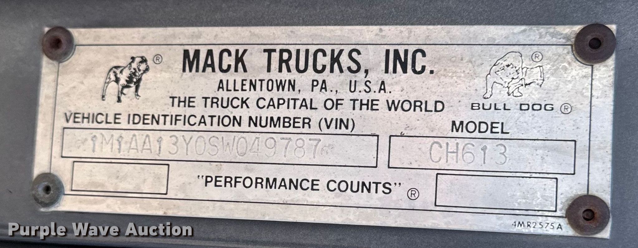 Purple Wave is selling a used Truck Tractor in Iowa. This item is a 1995 Mack CH613 semi truck with the following: Miles: 407,230 on odometer, Hours: 13,872 on meter, VIN: 1M1AA13Y0SW049787