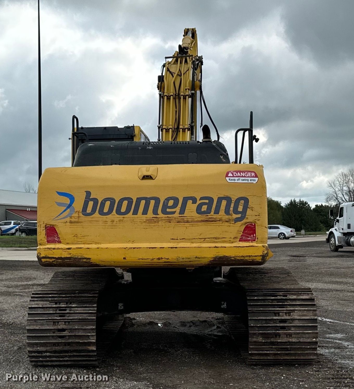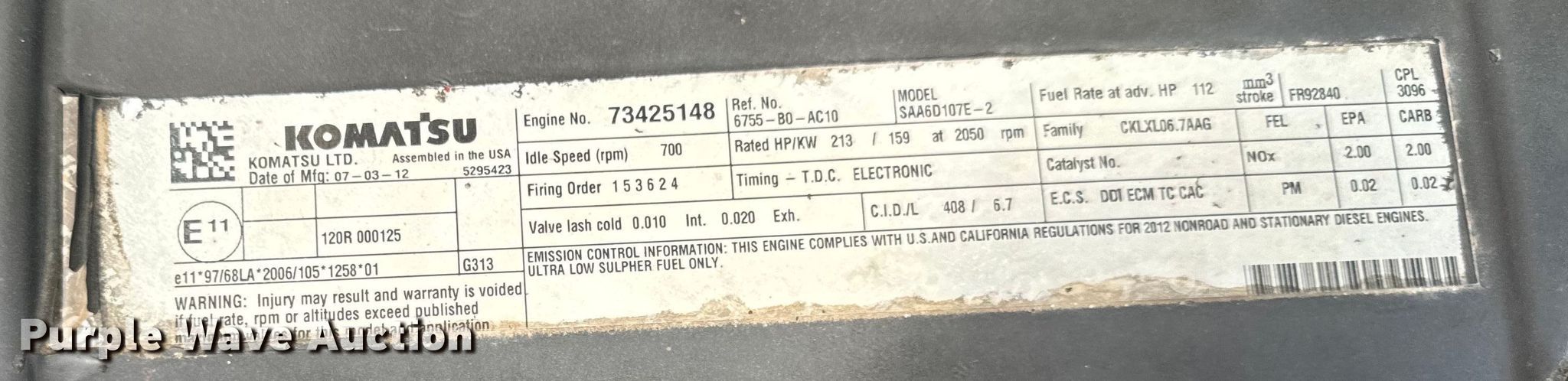 2013 Komatsu PC290LC-10 excavator. Hours: 7,870 on meter, Serial: A25288. Engine Komatsu SAA6D107E-2, Displacement: 6.7L, Cylinders: 6, Fuel type: Diesel. Transmission Hydrostatic, Three speed travel, 3F - 3R. Operators station Enclosed cab, AC, Heat. Features Auxiliary hydraulics Two-way, Counter weights, Boom Standard, Stick Stick length: 12', Quick coupler: Hydraulic, Thumb: Hydraulic, Bucket Width: 54", Teeth: 6. Tracks Width: 33", Steel, Grouser pads: Triple. Boomerang Corp. Anamosa, IA 52205