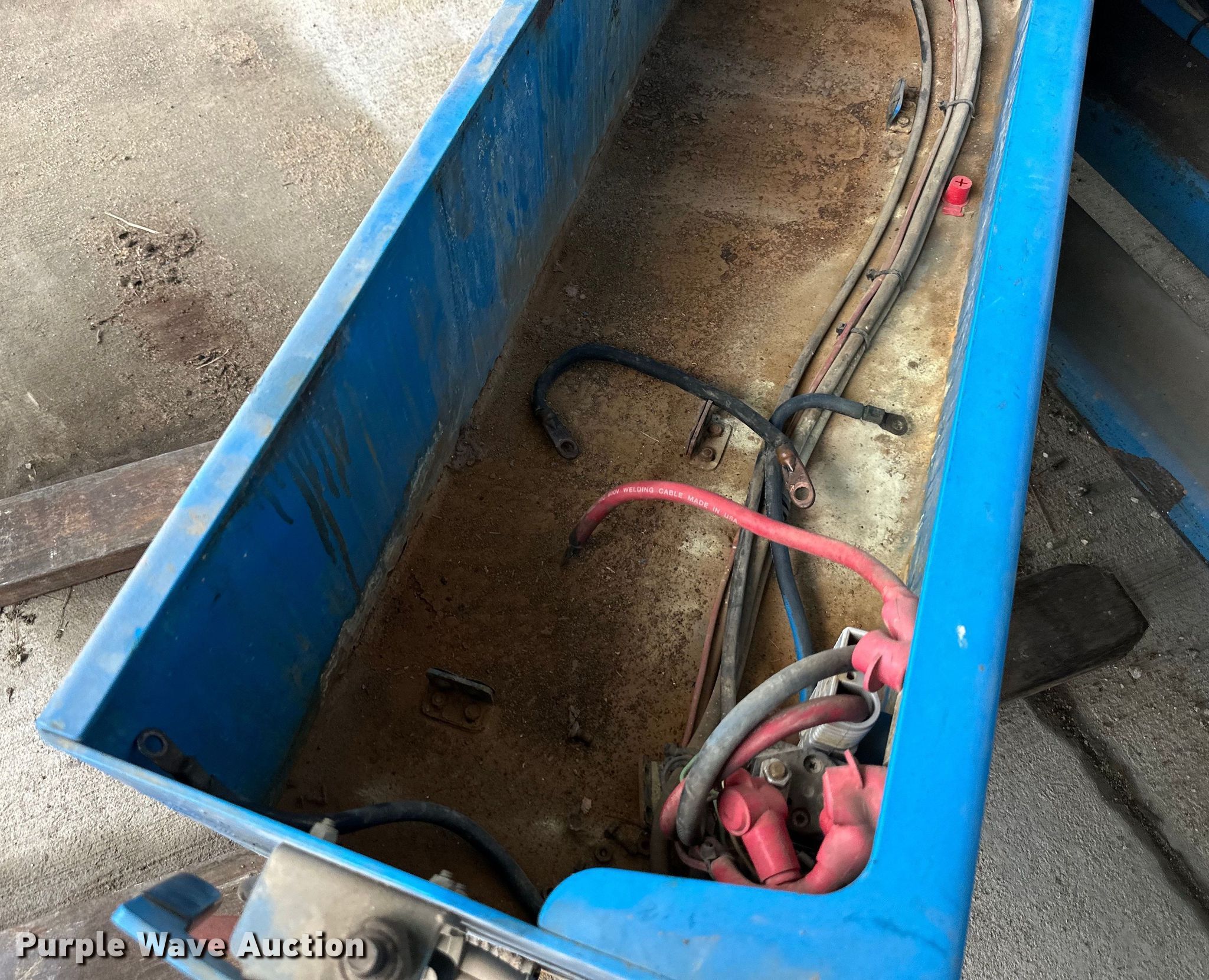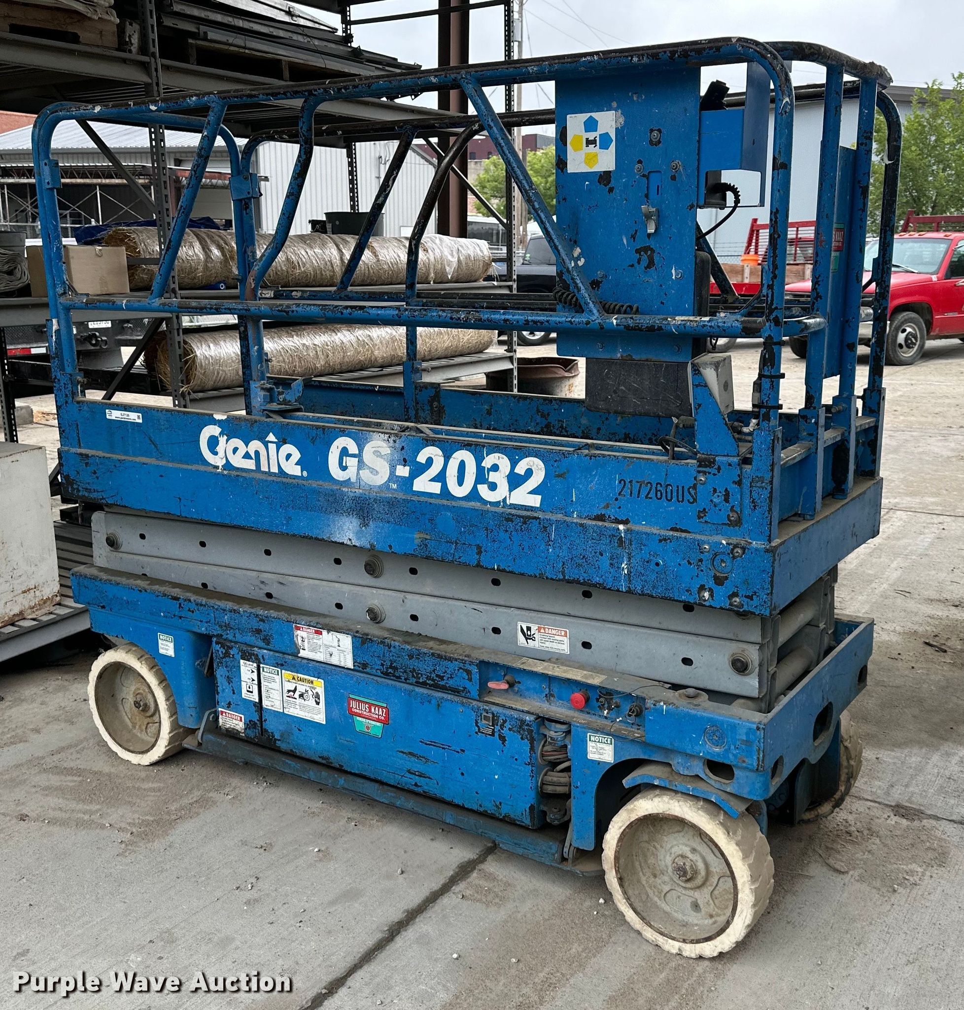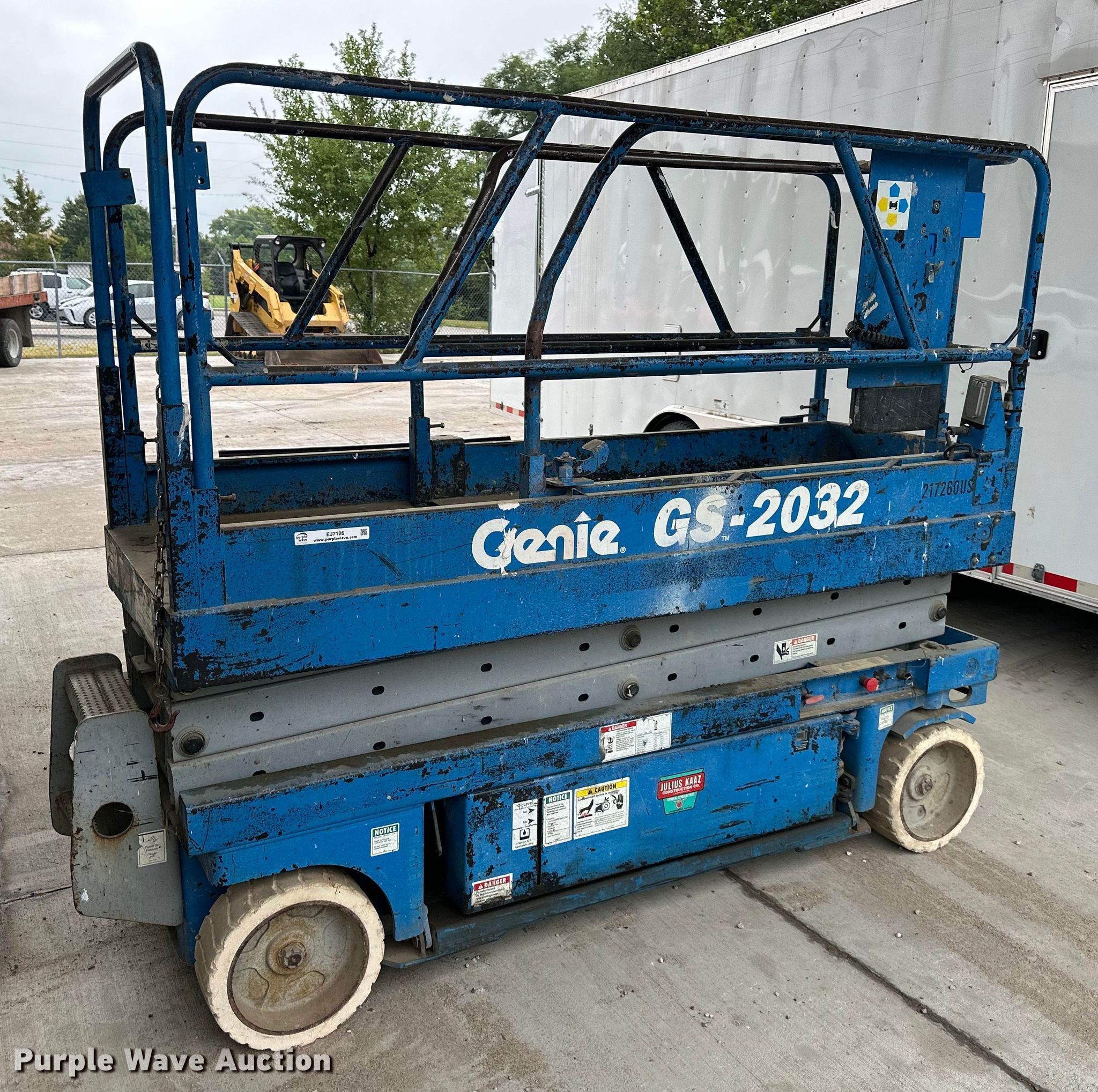 Genie GS-2032 scissor lift. Electric Motor. Volts: 12/24. Features Maximum lift capacity: 800 lbs, Maximum lift height: 20', Platform: 89" L x 30" W, Controls: Remote Control, Ground, Platform extensions: Manual. Tires Tire size: 15x5, Solid, Non-marking. Notes Battery missing, Possible electrical issues, Non-operational unit. Julius Kaaz Construction Co., Inc.. Leavenworth, KS 66048
