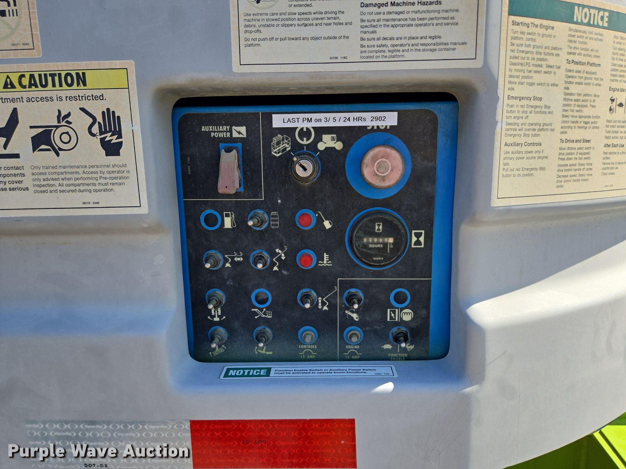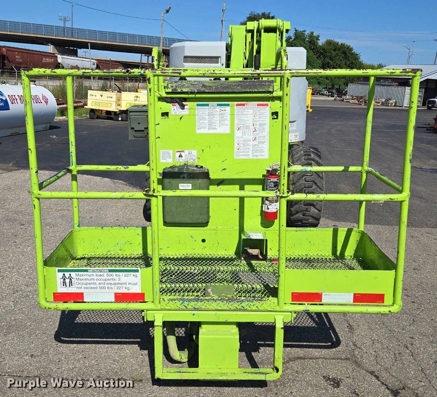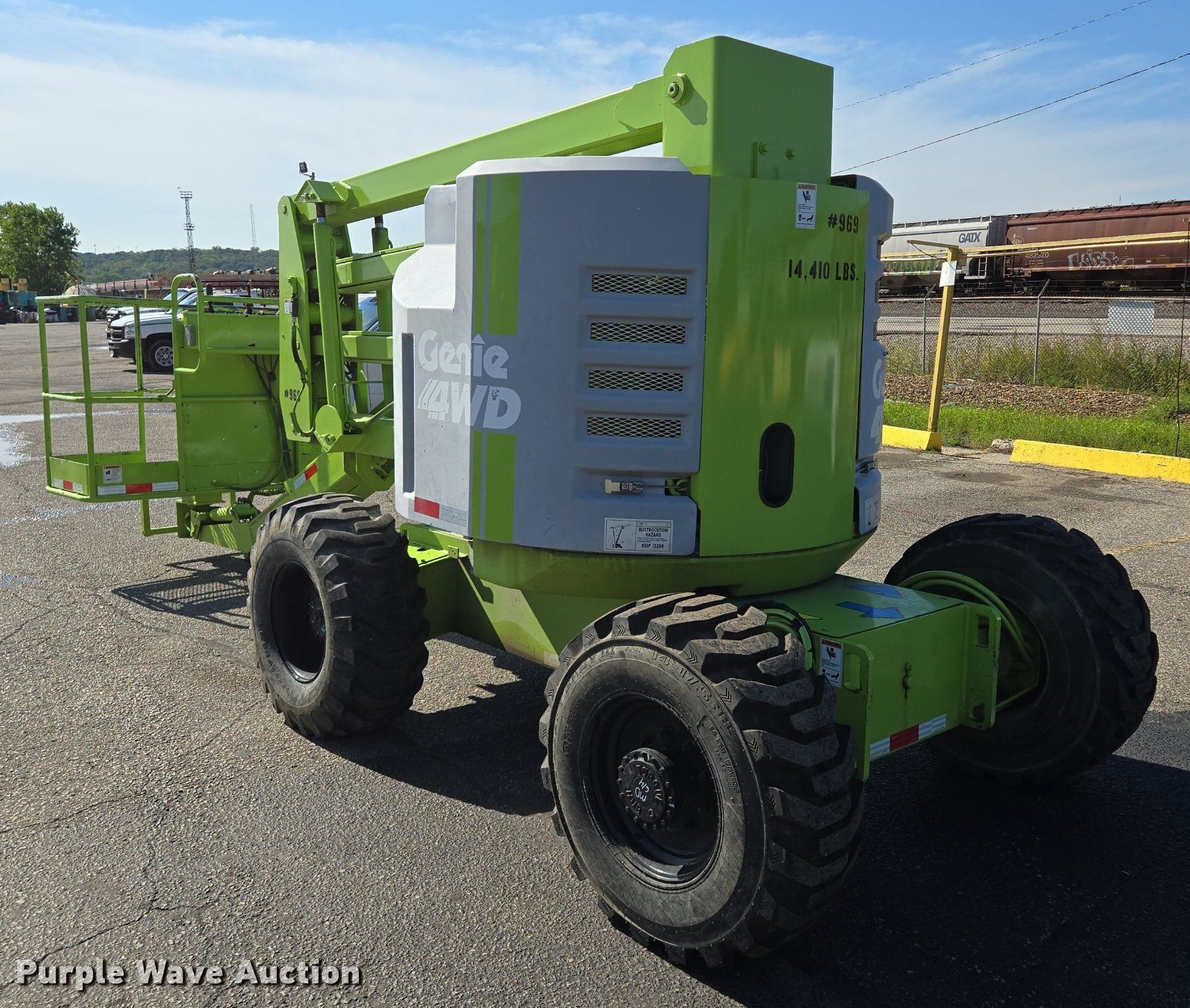 1997 Genie Z-45/22 boom lift. Hours: 2,961 on meter, Serial: Z-45-005954. Engine Ford, Displacement: 2.3L, Cylinders: 4, Fuel type: LPG. Chassis Four wheel drive. Features Rough terrain, Boom type: Articulating, Telescopic, Maximum lift capacity: 500 lbs, Maximum reach length: 23', Maximum lift height: 45', Platform: 69" L x 27" W, Controls: Platform, Ground, Platform rotation: Hydraulic. Tires Tire size: 14-17.5. Delta Innovative Services. Kansas City, KS 66106