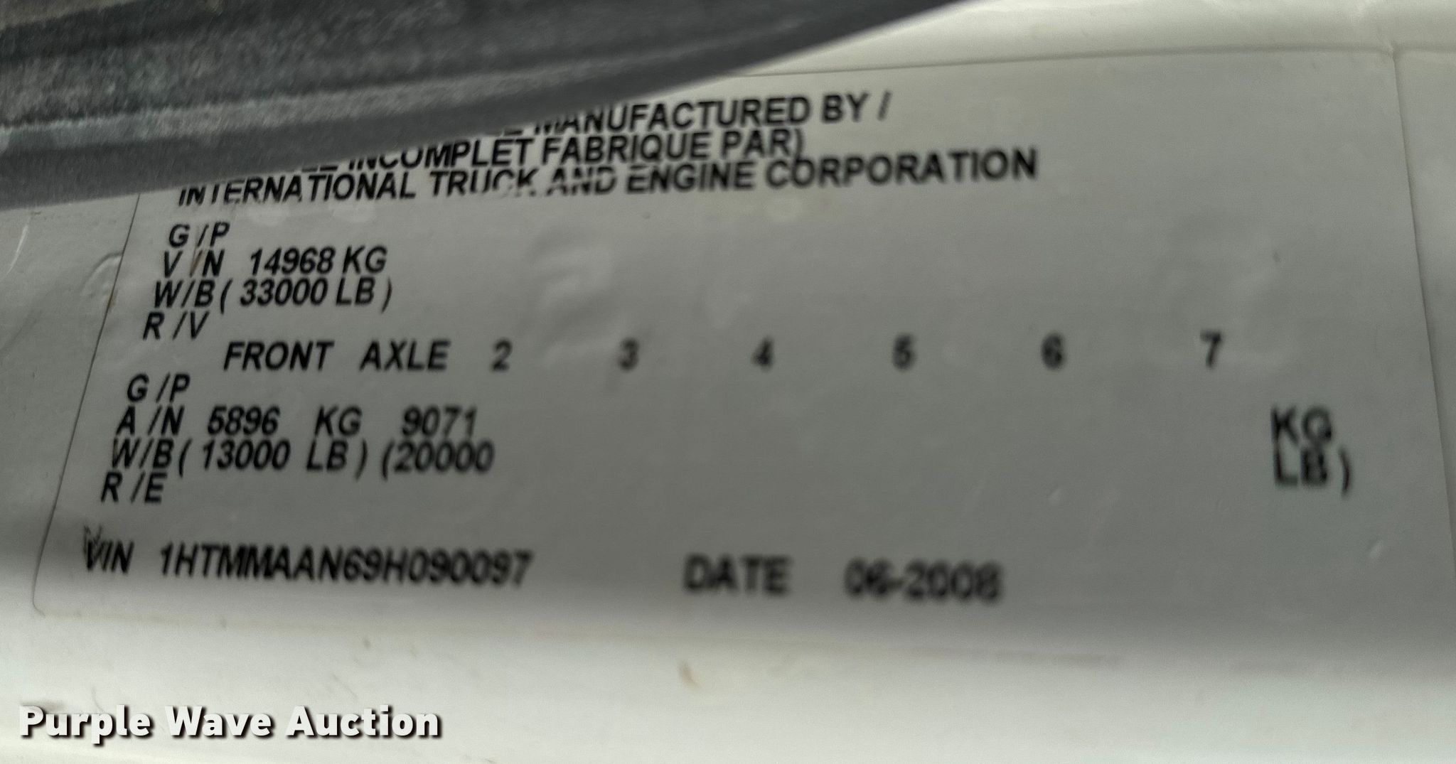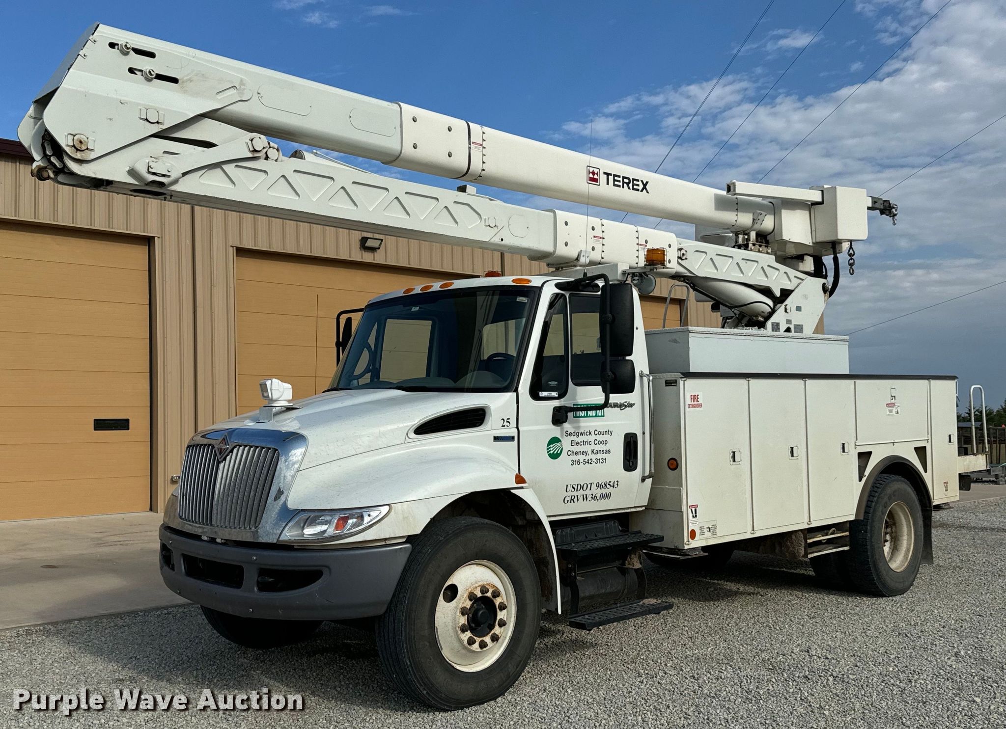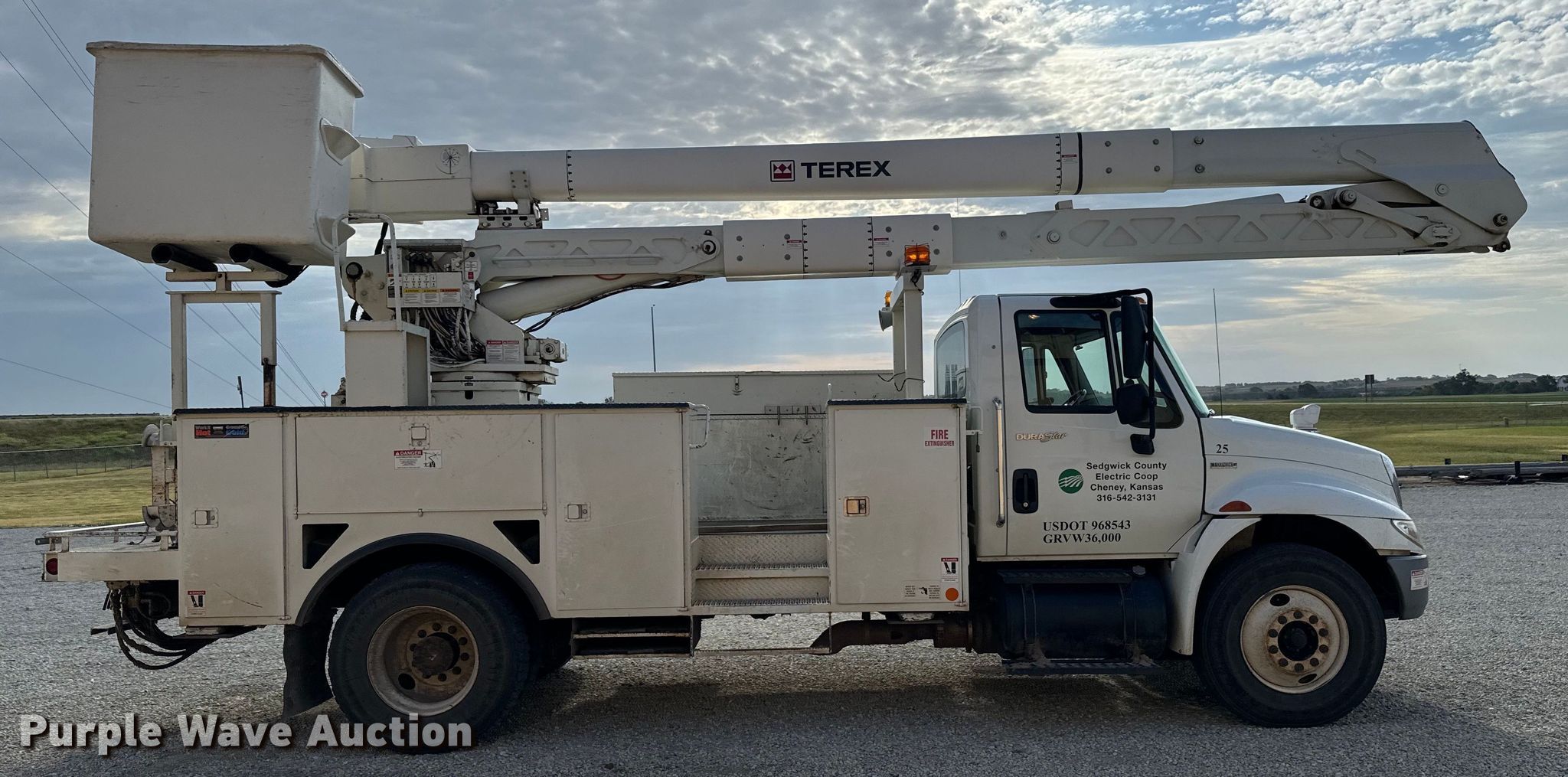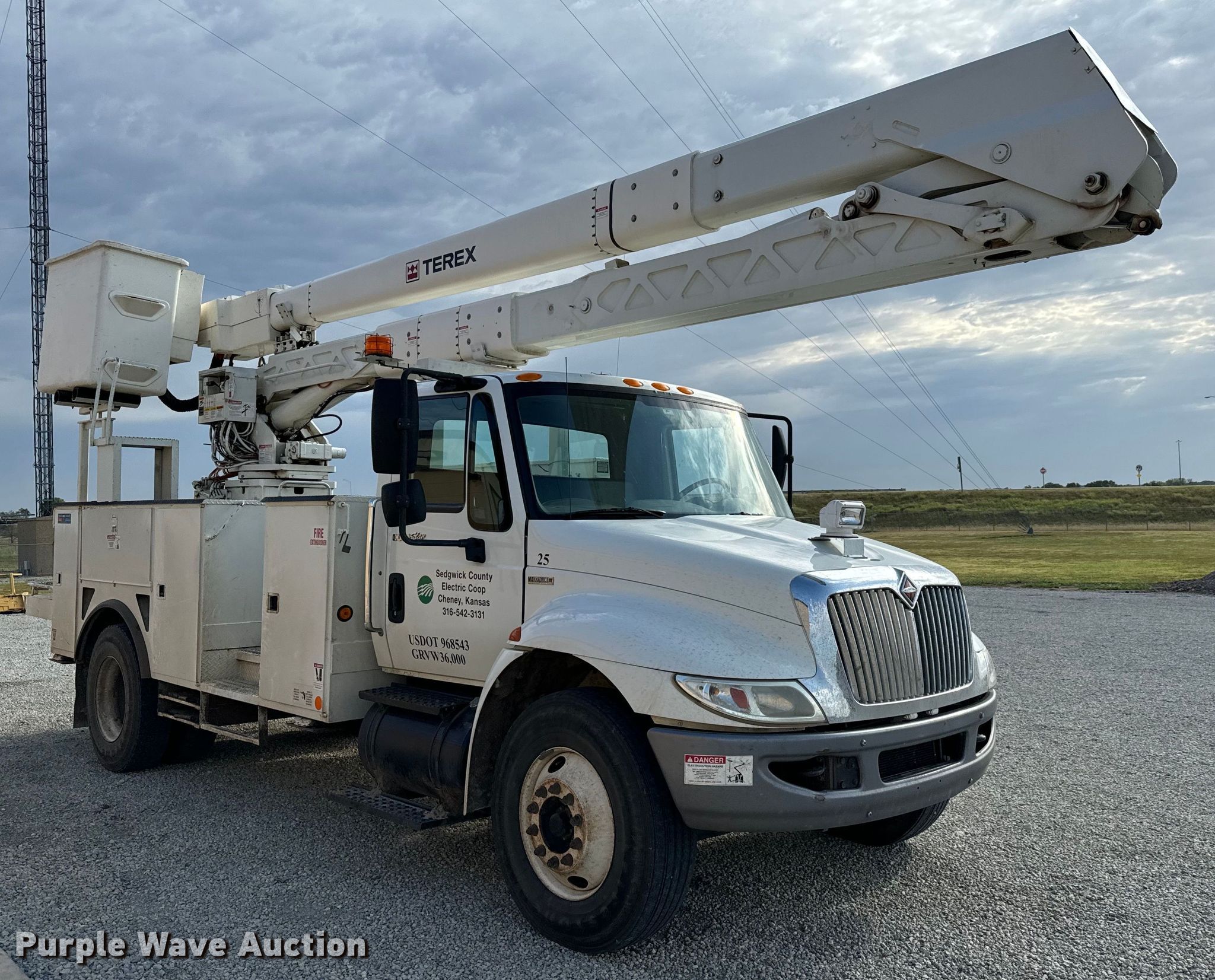2009 International DuraStar 4300 bucket truck. Miles: 97,704 on odometer, Hours: 7,745 on meter, VIN: 1HTMMAAN69H090097. Engine International Maxxforce GDT245, Displacement: 7.6L, Cylinders: 6, Fuel type: Diesel. Transmission Allison, Automatic. Chassis Axles: Single, Suspension: Spring, Brakes: Air, PTO, GVWR: 33,000 lbs. Interior AC, Heat, Cruise control, Auxiliary controls. Features Bed Terex IN15661, 16' 6" L x 94" W, Boom 2008 Terex Telelect Hi-Ranger TCX-55, Serial: 2080737237, Mast height: 55', Maximum lift capacity: 500 lbs, Boom type: Articulating, Insulated, Man basket, Boom controls Ground, Platform/ basket, Material handler, Certification valid through: 10/2/24. Tires Size: 11R22.5. Notes Dash warning indicator: Intermittent DEF. Kansas title. Sedgwick County Electric Coop. Cheney, KS 67025
